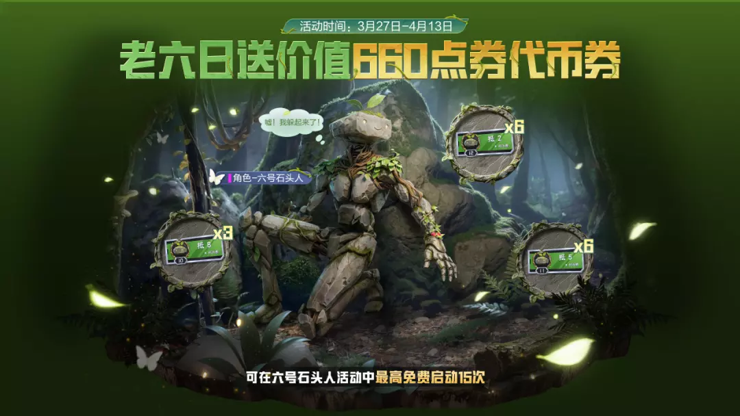 3月27日-4月13日,玩家通过完成活动任务,可领取六号石头人代币券共15张,最多可在六号石头人双层秘宝活动中免费启动15次!