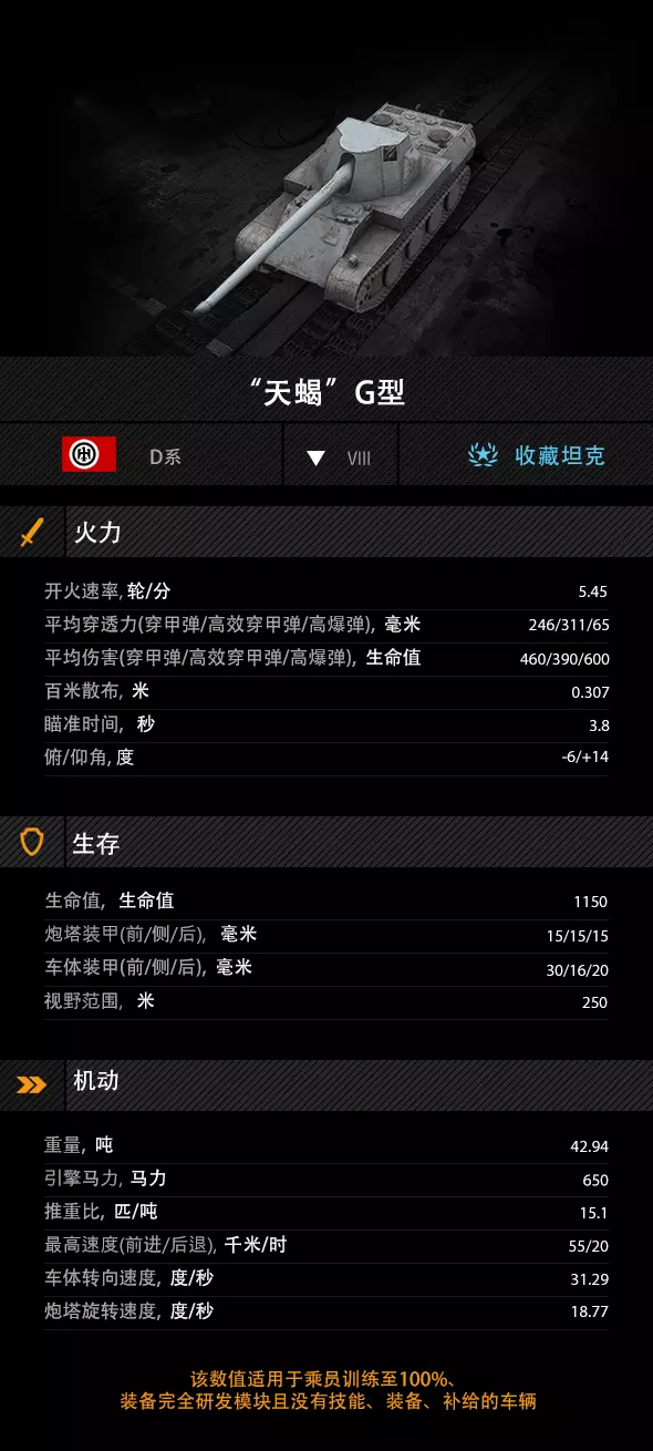 “天蝎”G型拥有55千米/时的前进极速与20千米/时的倒车极速,具备优异的远距离转场能力。31.29度/秒的车体转向速度,使其能够灵活调整站位,在战场上从容应对多变战局,寻找合适的黑枪位置。其防护能力较为薄弱,不适合正面抗线。该车更适合利用机动优势辗转游走,伺机偷袭敌方侧后。