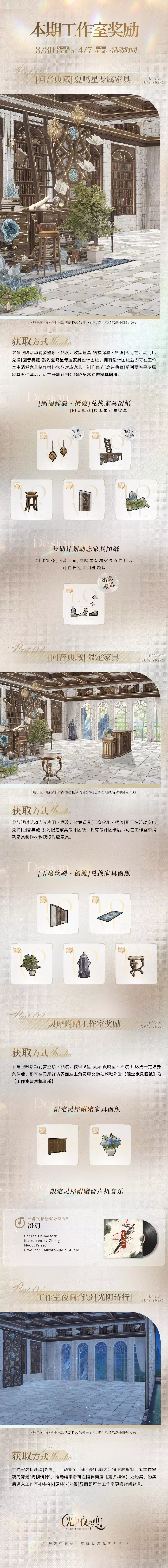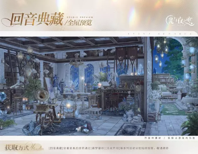 工作室家具[回音典藏]系列登场,后续将通过[羁梦鎏珍][吉光片羽]等系列活动【分批陆续投放】。参与本期限时活动可获得工作室奖励一览: