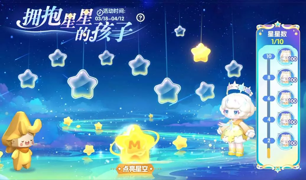每日点亮星空可获得一颗星星,每点亮两天可获得100皮肤碎片。