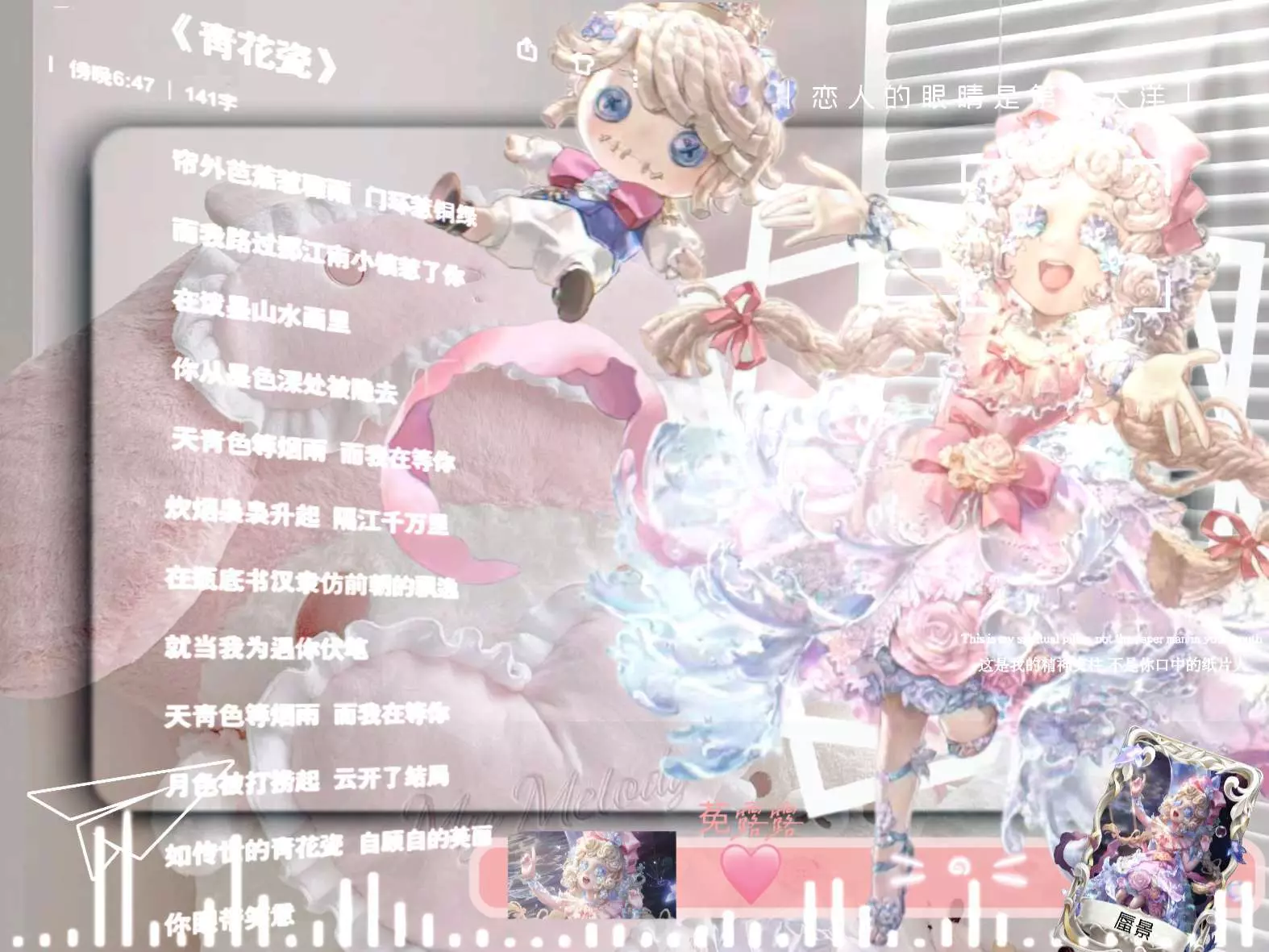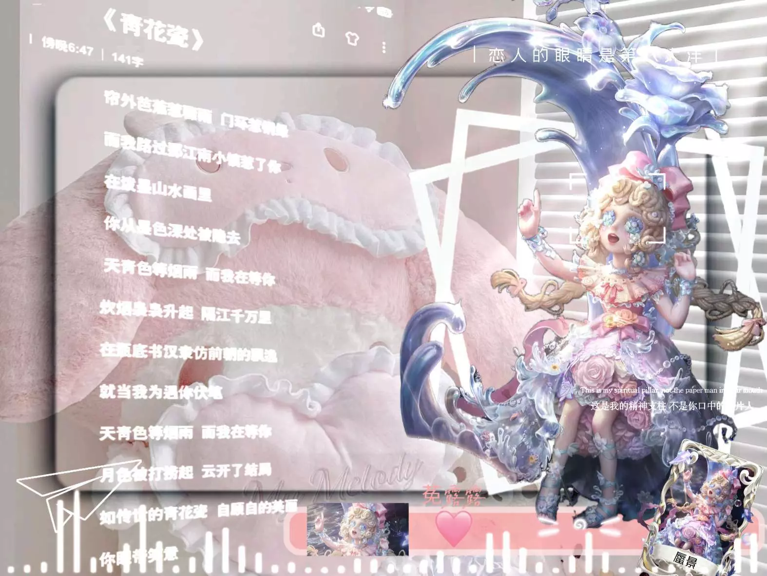 这是第五人格的创作美图帖,展示了身着精美服饰的角色形象,搭配《青花瓷》歌词,表达出对该角色的喜爱,称其为精神支柱,相关创作者为菟露露。