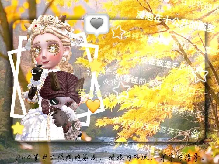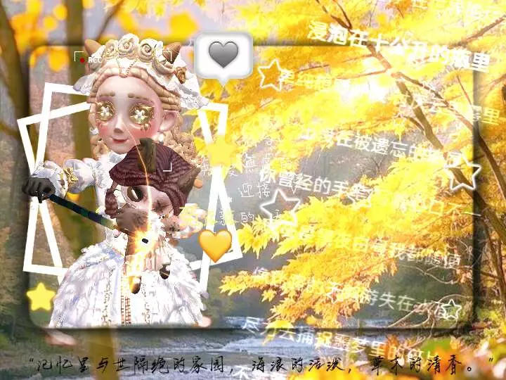 这是第五人格的创作美图帖,展示了游戏角色在秋日林间的形象,配文唤起对记忆里与世隔绝的故土家园的怀念,带有关联话题与创作标识。