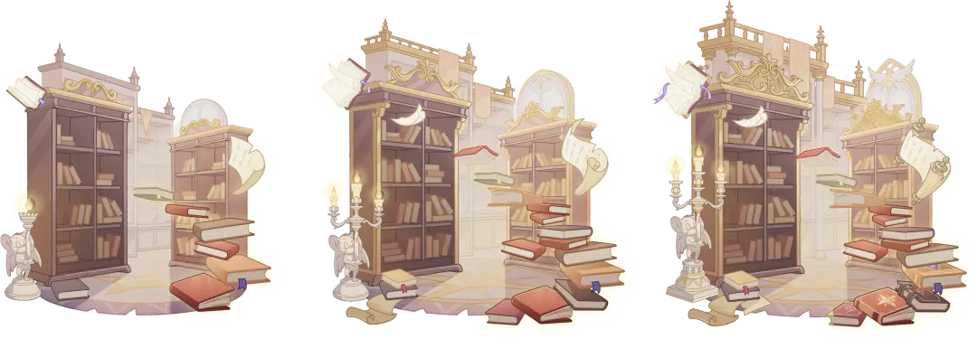 背景设计上,宏伟的宫廷书库在阳光的照耀下显得神圣不可侵犯,书柜高低起伏依次排开,书本呈阶梯状逐层攀缘上升,仿佛一道通向那神圣之地的坦途。空气中弥漫着淡淡的圣香,烛台与羊皮纸各置一侧,构筑出一幅静谧而庄严的画卷。