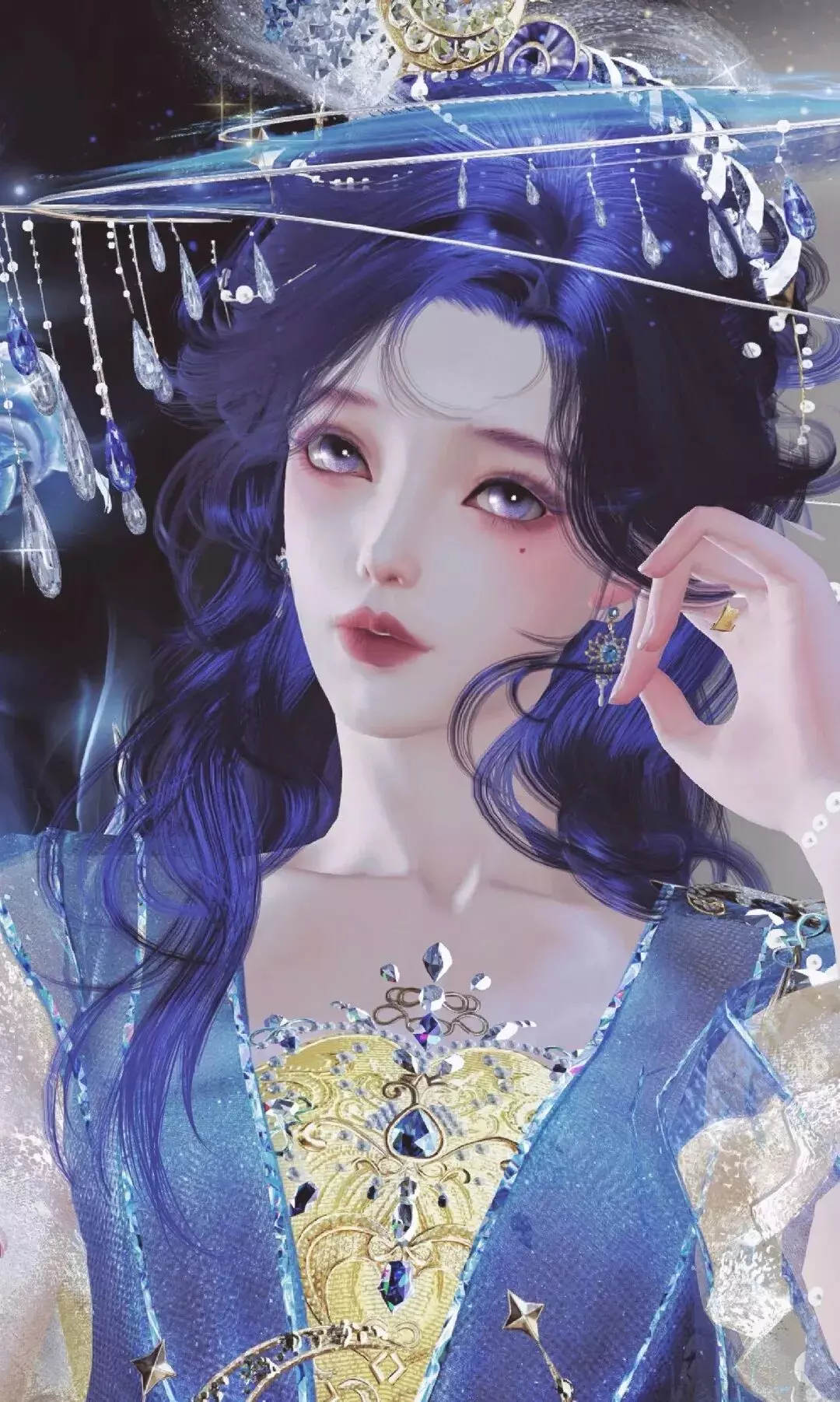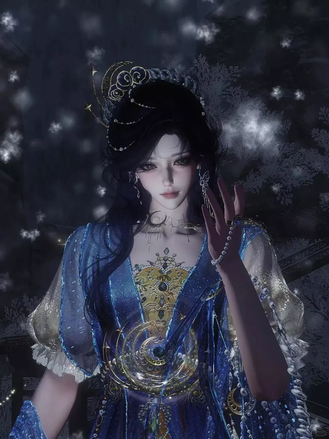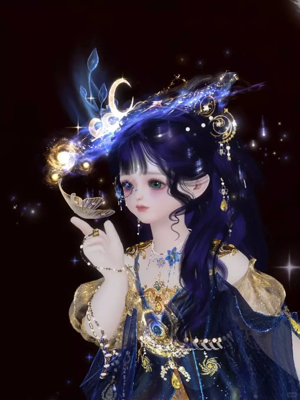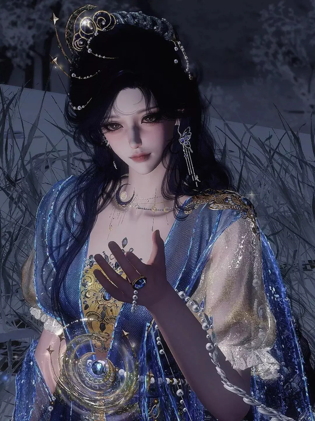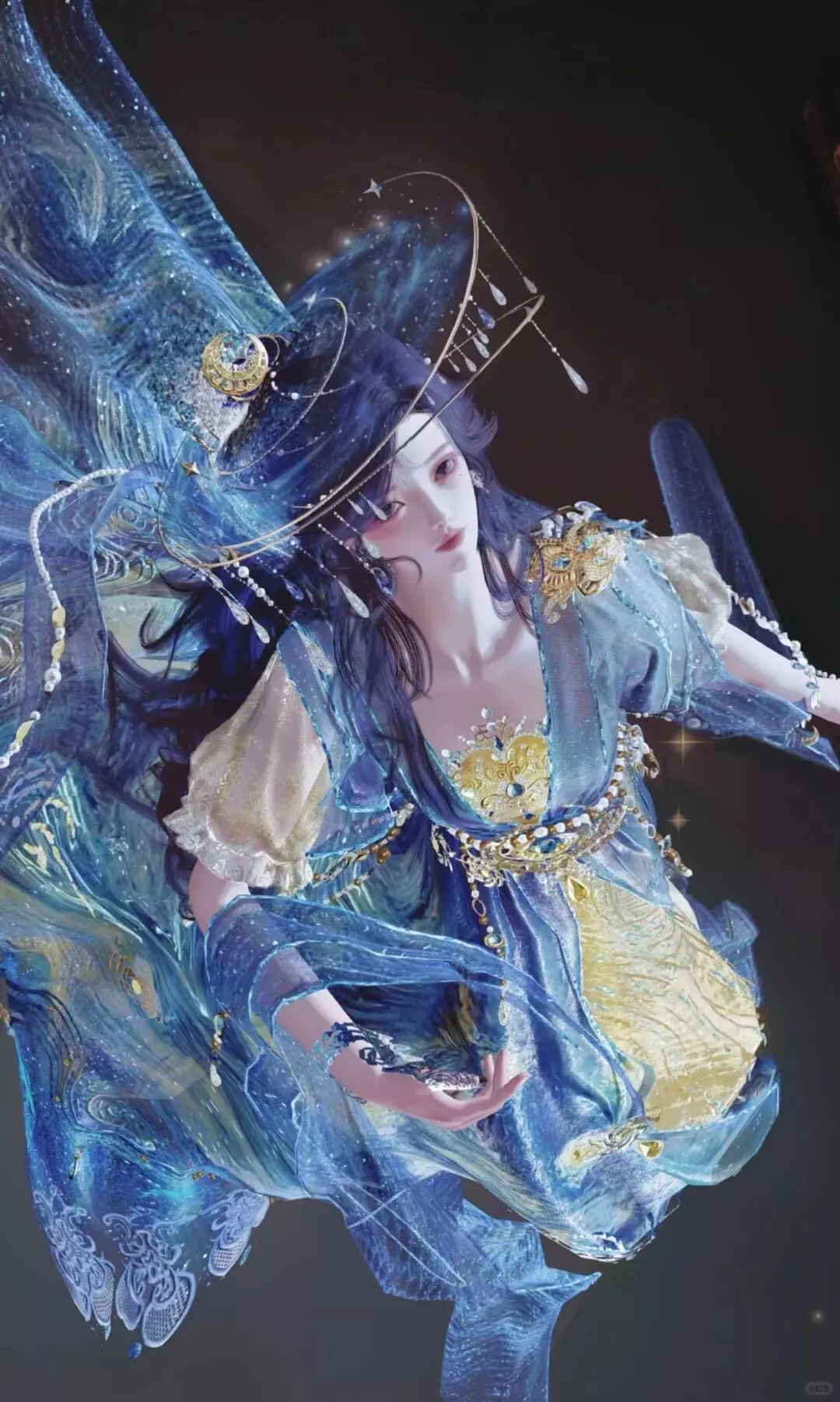 蓝纱金纹映着星子微光,她指尖轻触蝶影,掌心托住星光,时而抬腕与流星击掌,时而垂首对碎钻私语,又萌又美的模样,恰似趁夜色偷落凡间的一小片星子,正趁着夜色与漫天繁星玩闹说悄悄话。