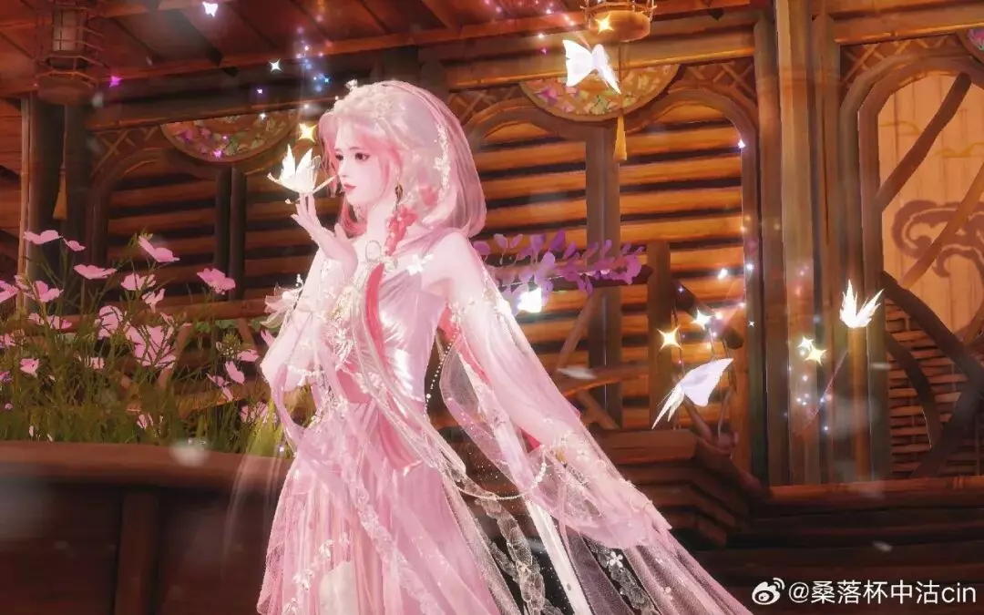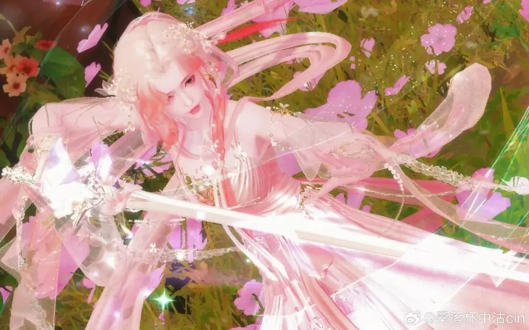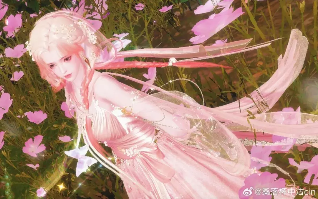发间珠花轻颤,朝露与星子一同绾入鬓边,粉发垂落肩头,将春日最娇柔的色彩都拢在衣袂间,抬手便有蝶翼轻吻指尖,仿佛连风都为她放缓了脚步。