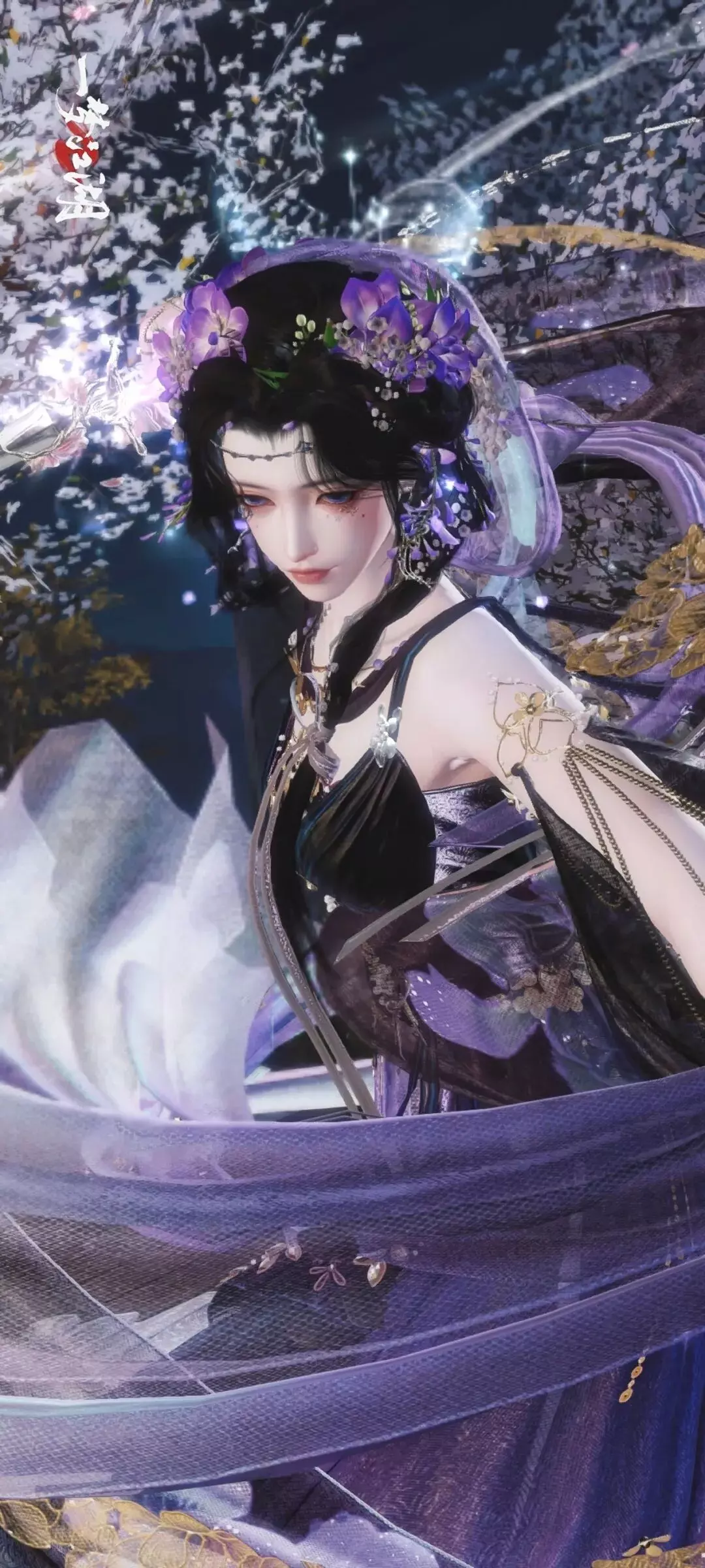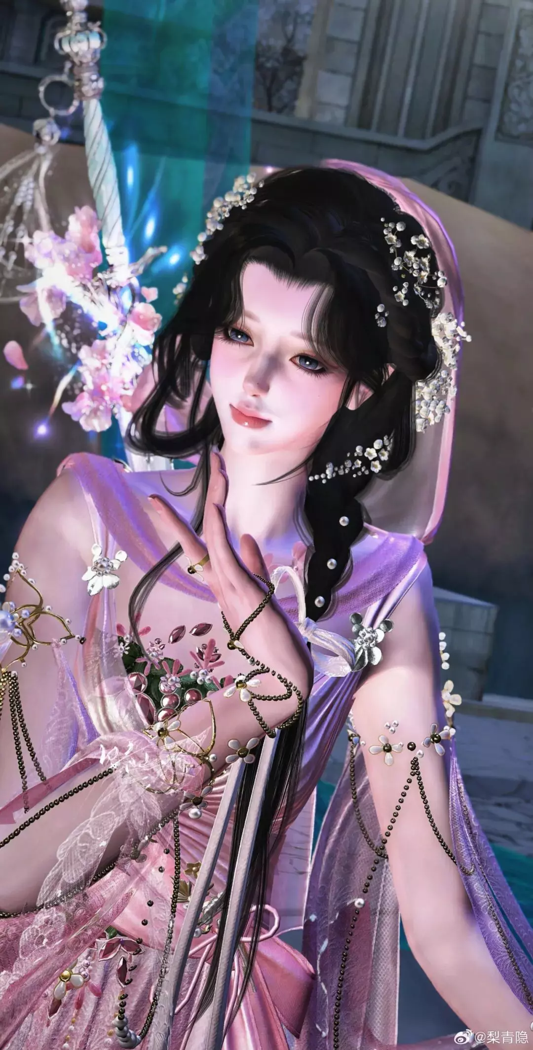 紫罗缠鬓,星子缀纱,少侠@溪边花满枝将时装・繁星缀碧染成暮春紫藤的缱绻。那簇簇紫花如凝露初绽,瓣瓣蜷曲着春日的柔婉。