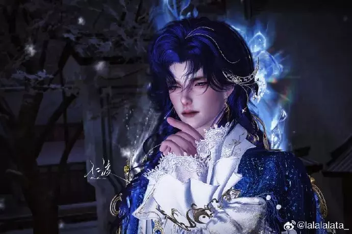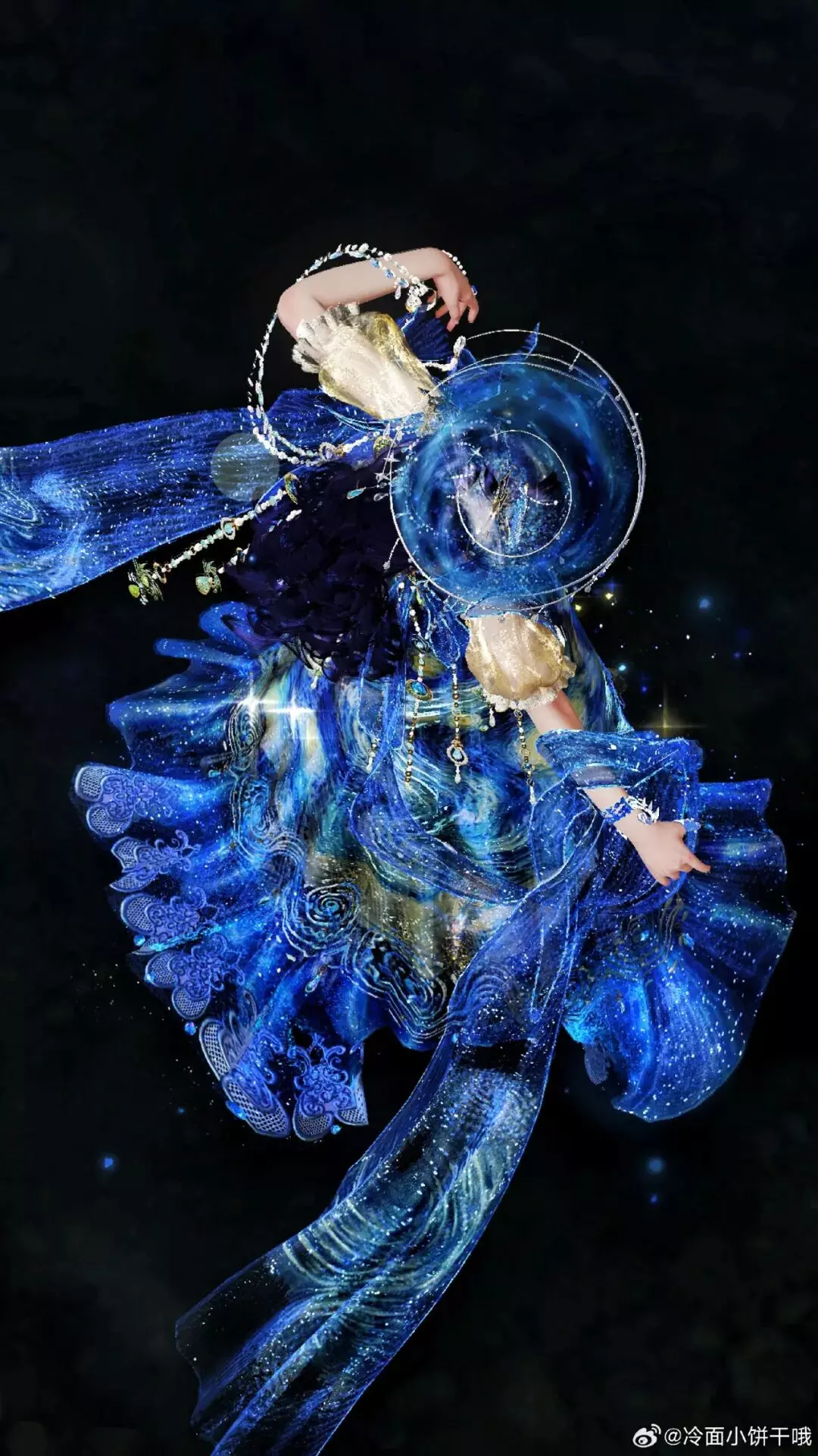 蓝纱裹挟着《星月夜》的漩涡流光,金纹吻过碎金,蝶影绕着书卷翩飞,夜空在衣袂间翻涌成热烈星河,每一处光影都藏着巧思,让神圣感与艺术感撞得恰到好处,小少侠仿佛从画中踏星而来的神女,把江湖酿成了最动人的星夜诗篇。