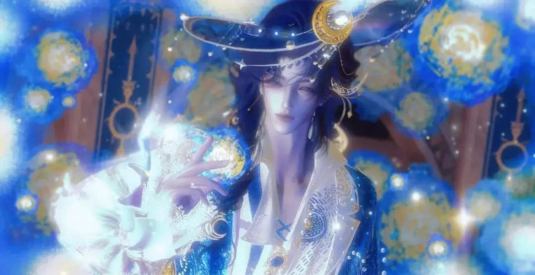他指尖轻触流转的星芒,眉眼低垂,唇线微抿,眼底盛着未说出口的怅然,像在凝望一场终将消散的星夜旧梦。