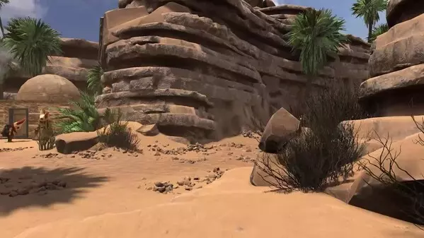 这是一则Colonials Programme的视频介绍,视频呈现了低多边形风格的外星荒漠场景,还有带有青绿色装饰的载具/角色在场景中活动,展现了项目的独特视觉风格与外星探索相关内容。
