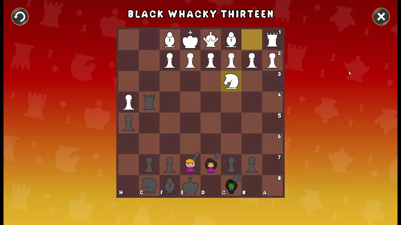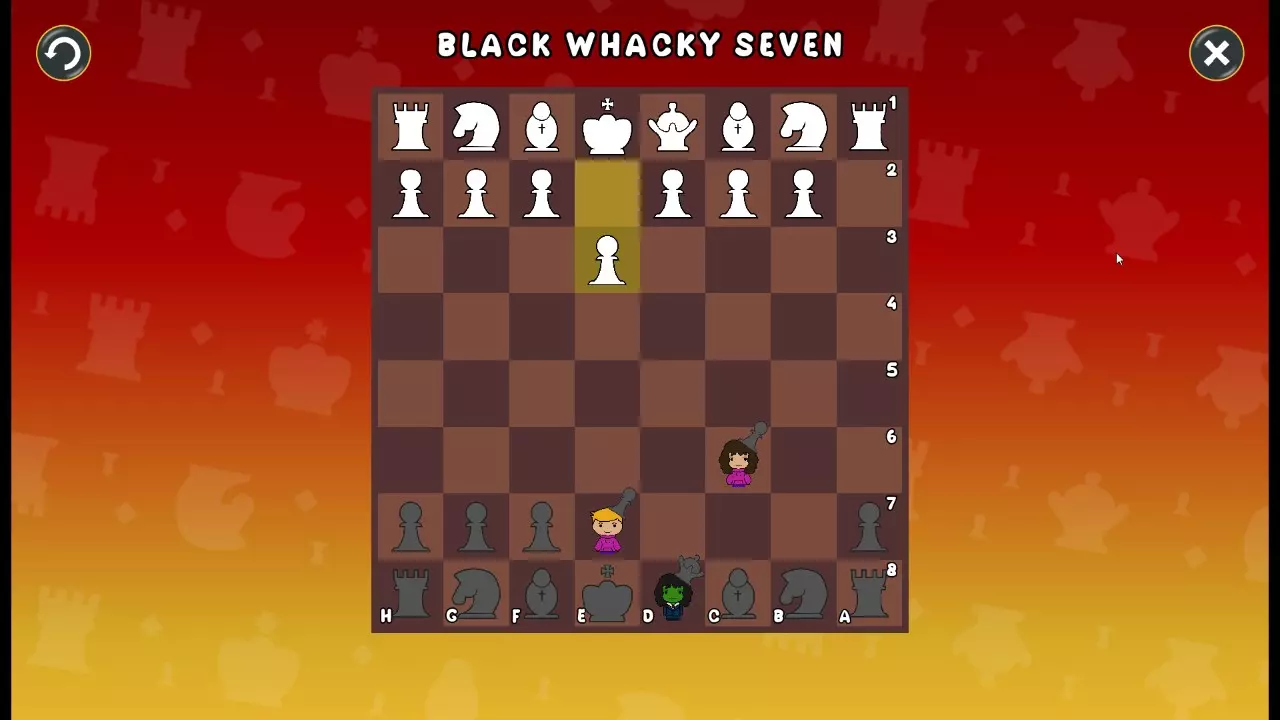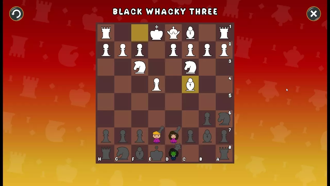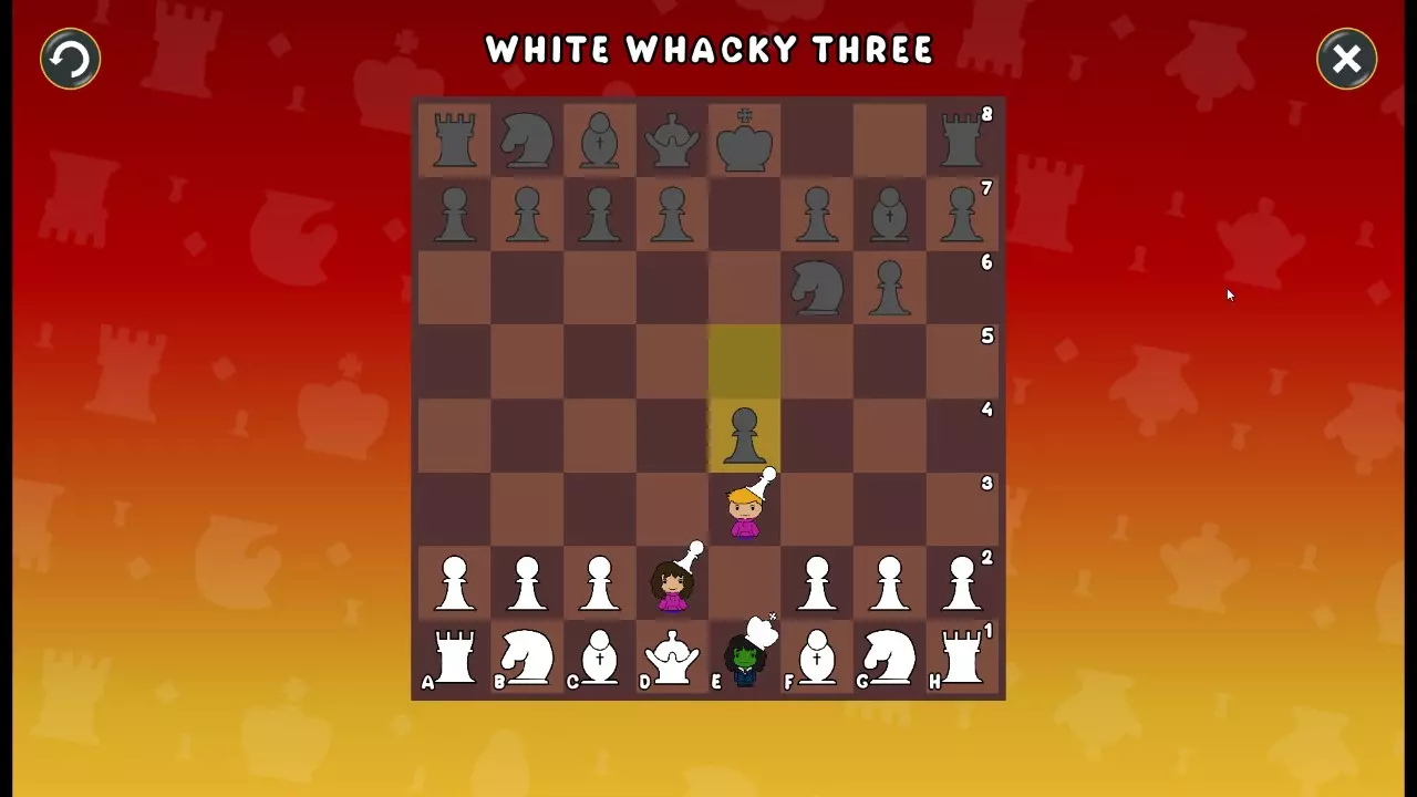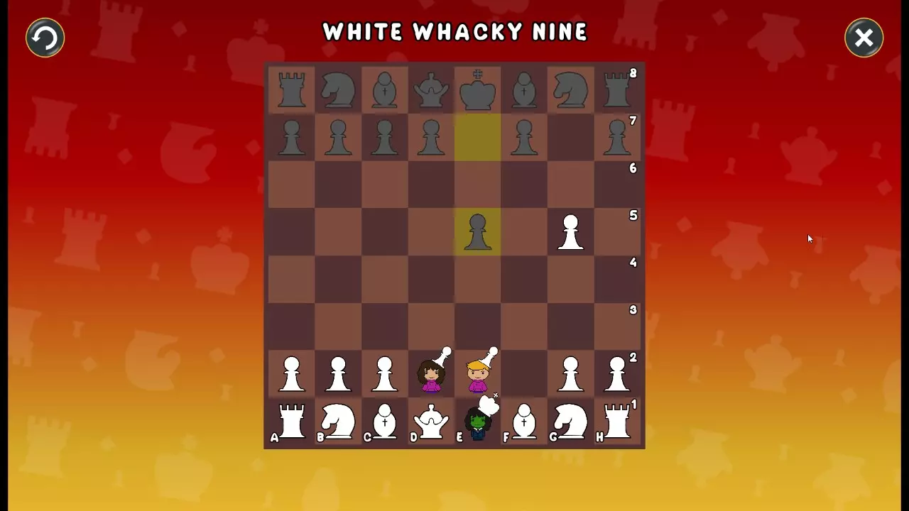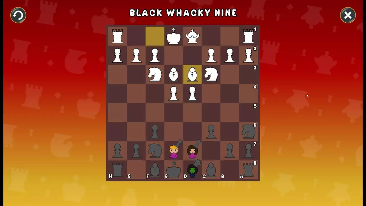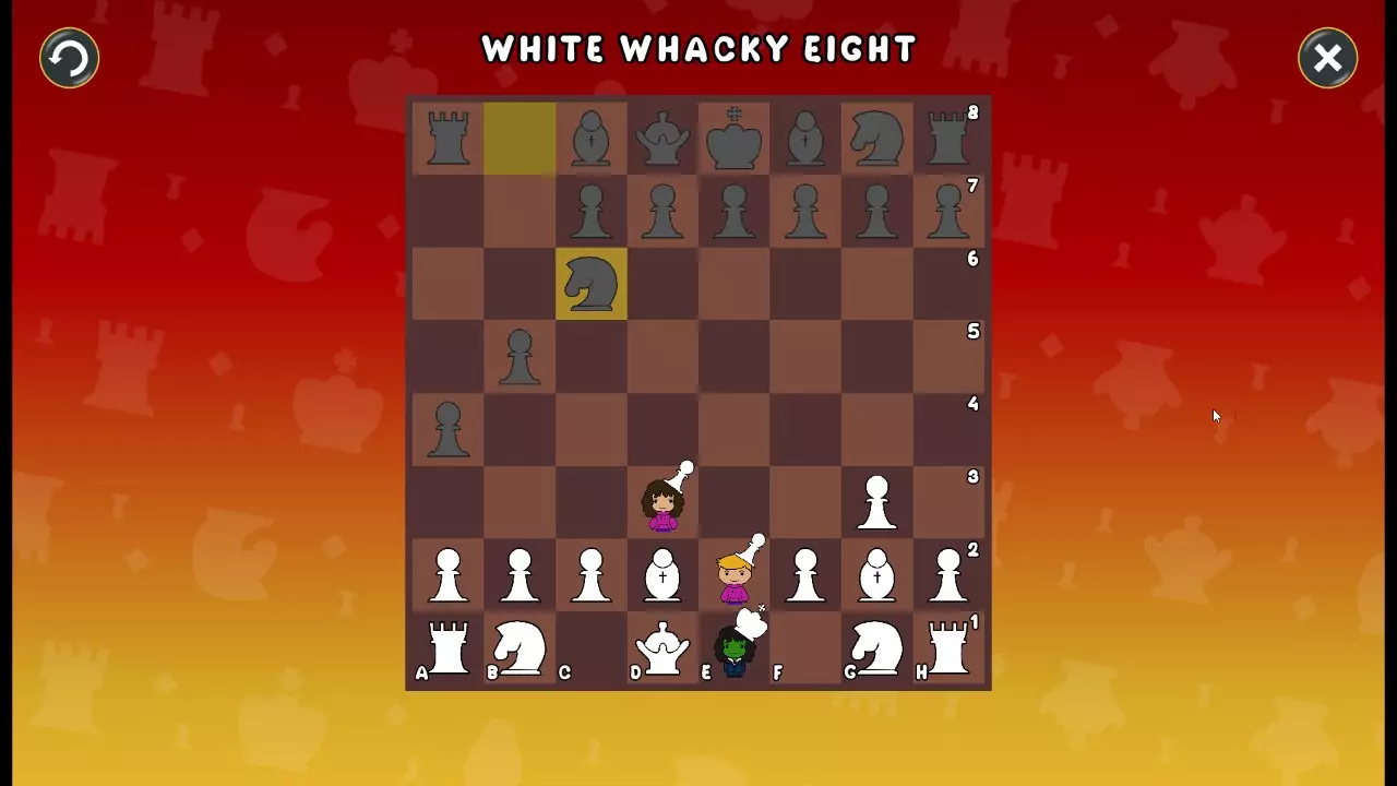 通过所有关卡并收集所有成就。 前言 那么,为我们带来了有趣的国际象棋变体。这里有需要在游戏过程中保护的【孩子棋子】。冒牌特级大师奥斯特洛夫·本德尔下过17盘西班牙开局。而我们则要下足足240盘棋,既执白棋也执黑棋。AI的智能水平并不突出:有时会走出强劲的棋步,有时却显得不堪一击。我们开启最高难度【d10】,然后开始游戏……