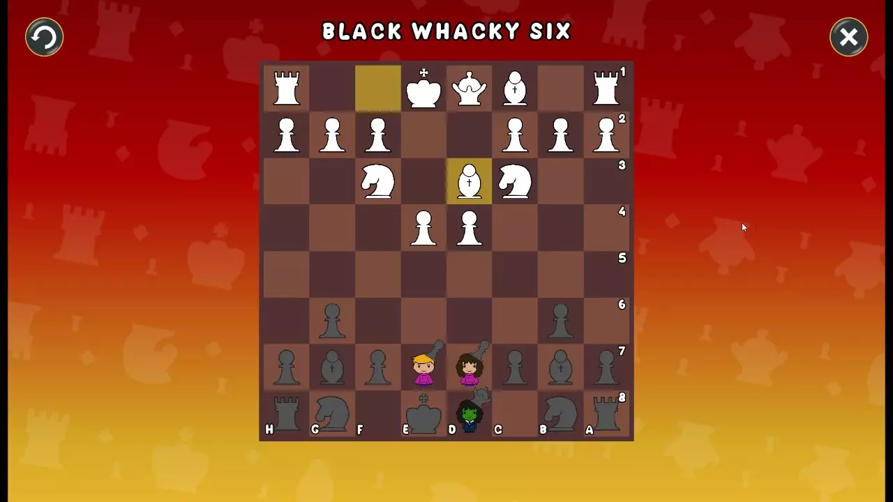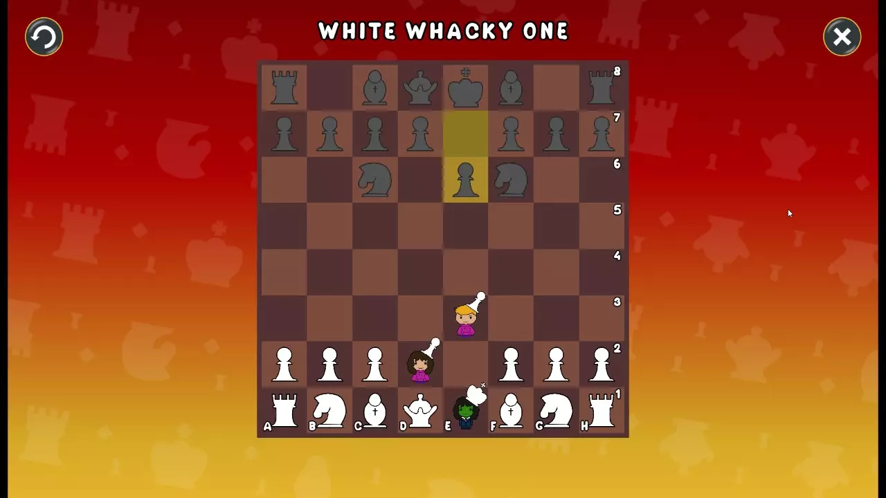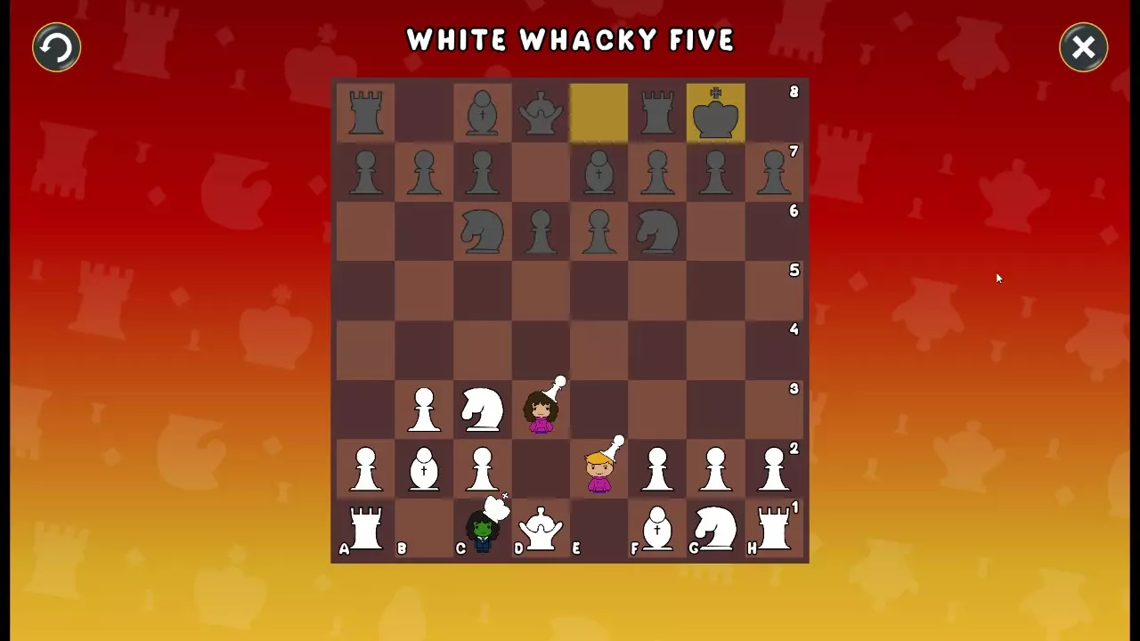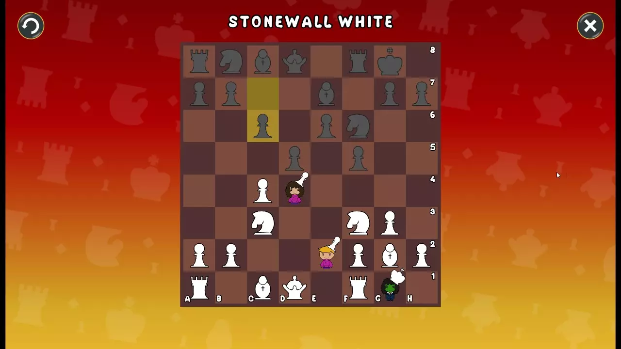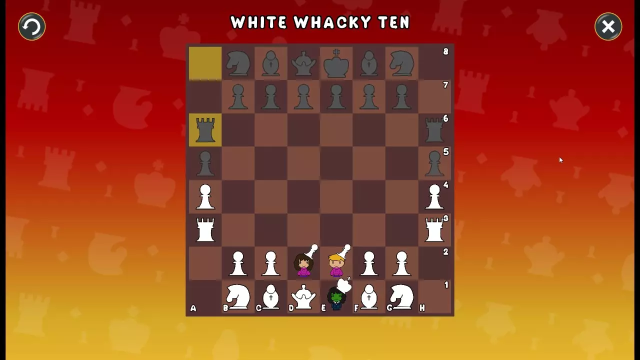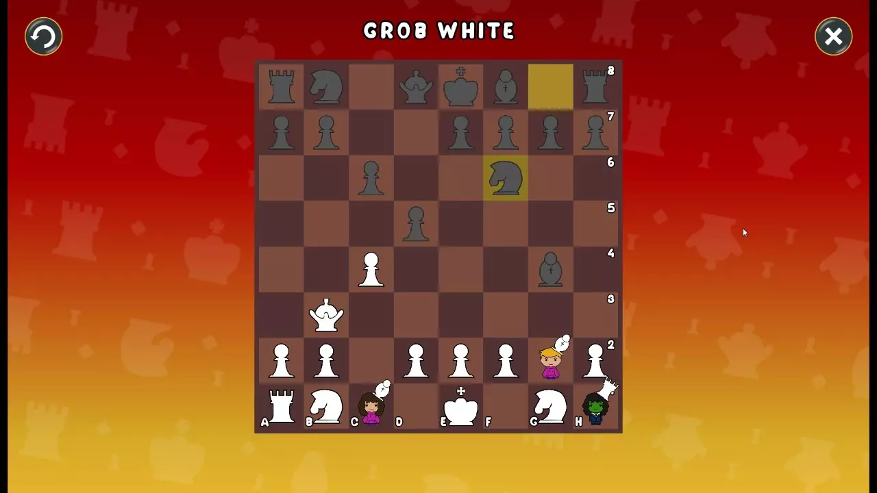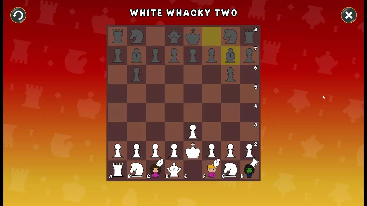 通过所有关卡并收集所有成就。 前言 那么,为我们带来了有趣的国际象棋变体。这里有需要在游戏过程中保护的【孩子棋子】。冒牌特级大师奥斯特洛夫·本德尔下过17盘西班牙开局。而我们则要下足足240盘棋,既执白棋也执黑棋。AI的智能水平并不突出:有时会走出强劲的棋步,有时却显得不堪一击。我们开启最高难度【d10】,然后开始游戏……