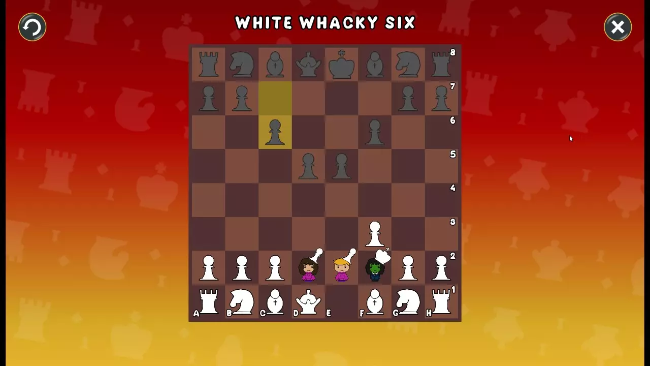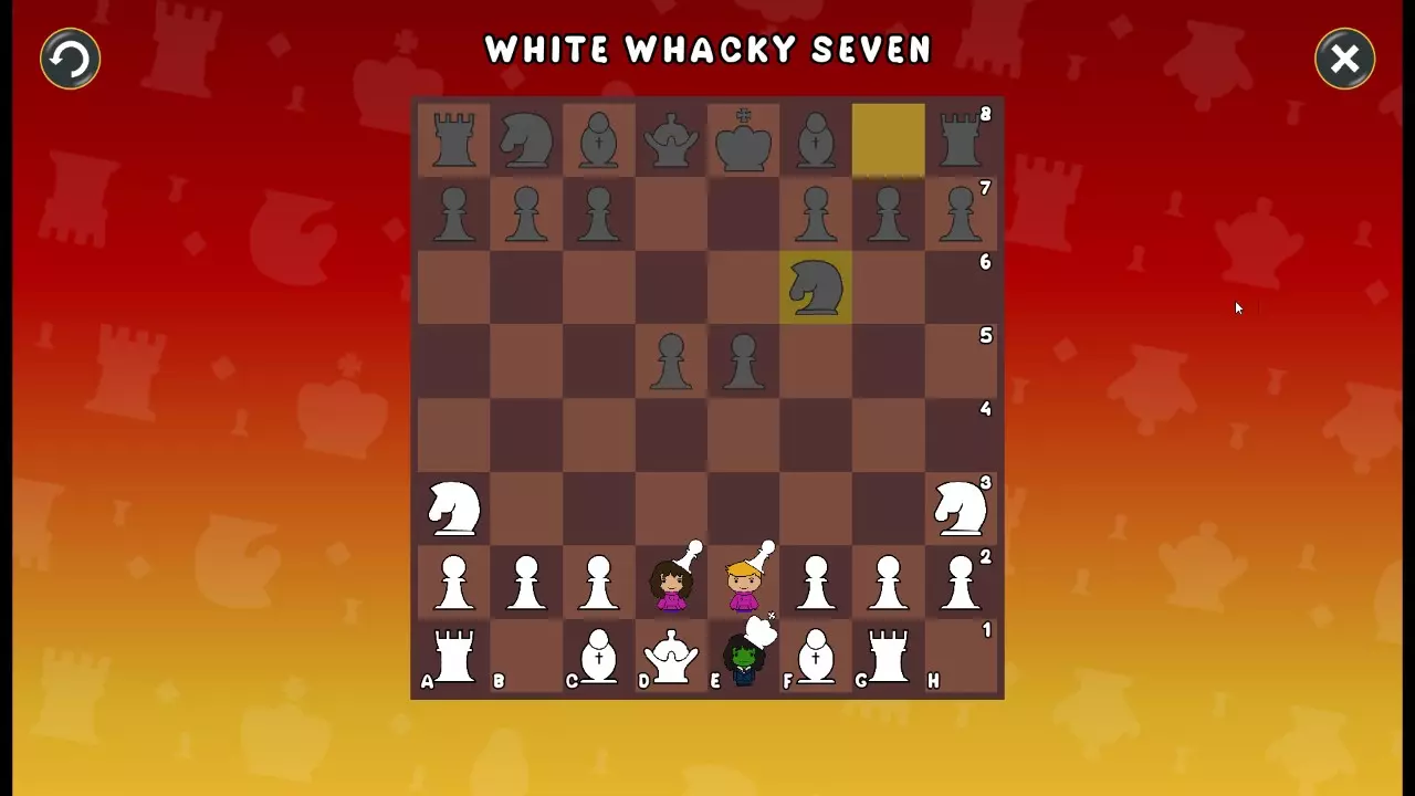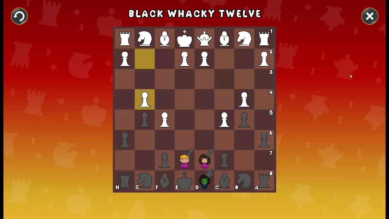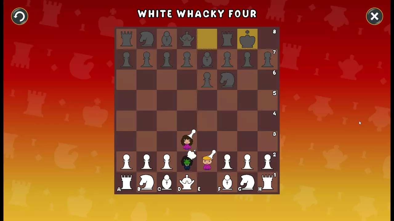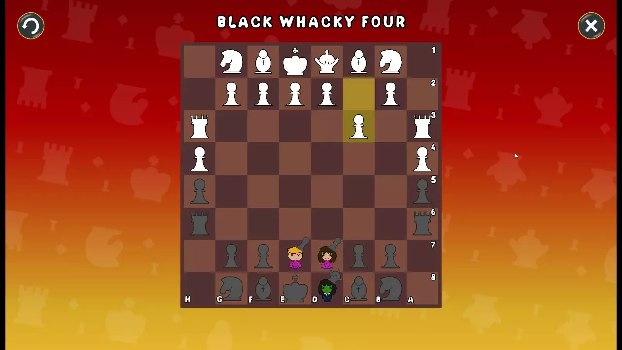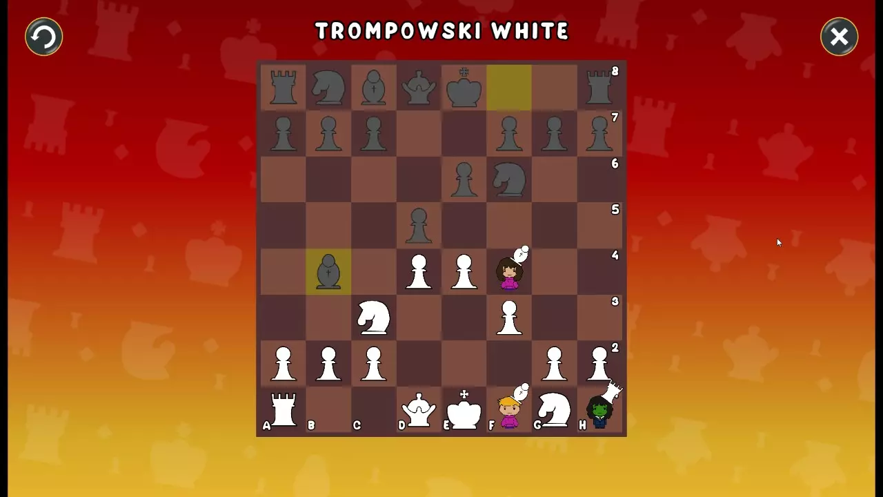 通过所有关卡并收集所有成就。 前言 那么,为我们带来了有趣的国际象棋变体。这里有需要在游戏过程中保护的【孩子棋子】。冒牌特级大师奥斯特洛夫·本德尔下过17盘西班牙开局。而我们则要下足足240盘棋,既执白棋也执黑棋。AI的智能水平并不突出:有时会走出强劲的棋步,有时却显得不堪一击。我们开启最高难度【d10】,然后开始游戏……