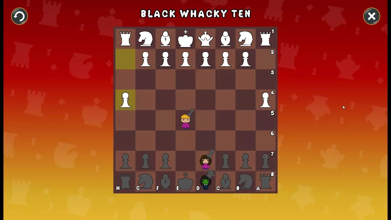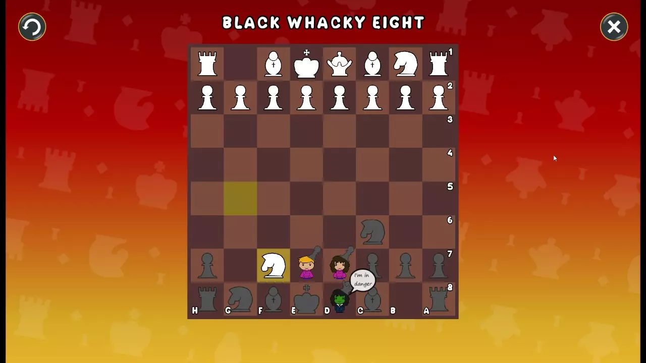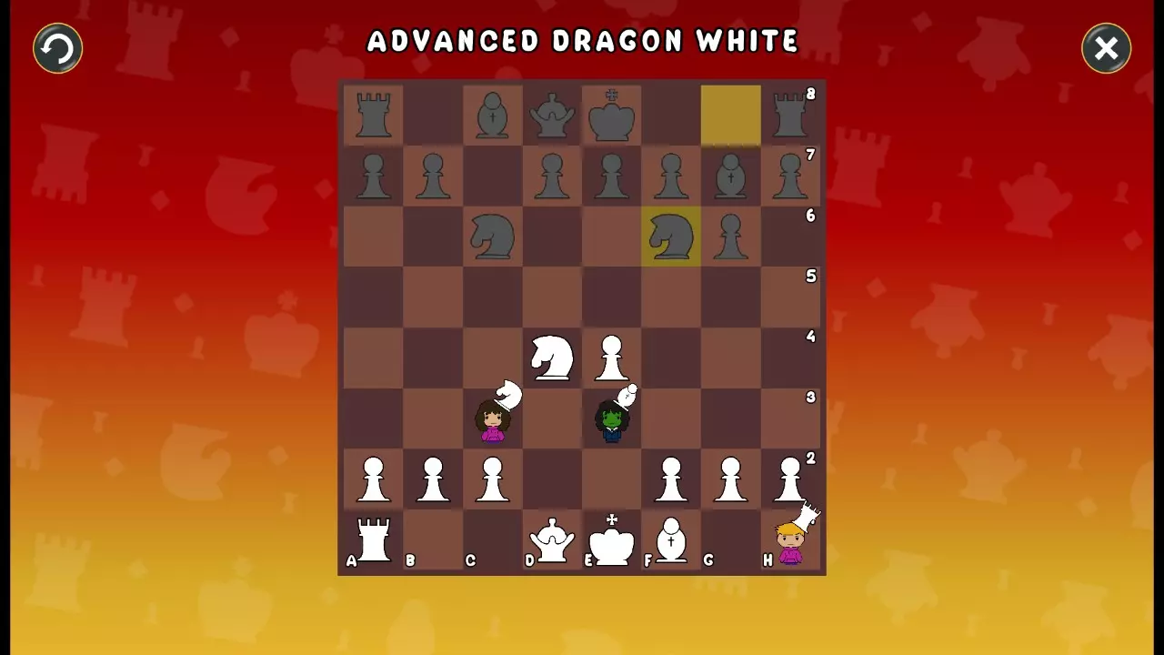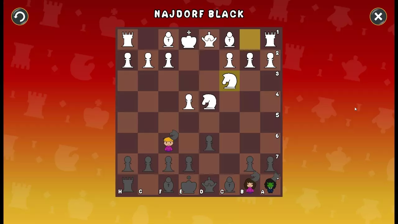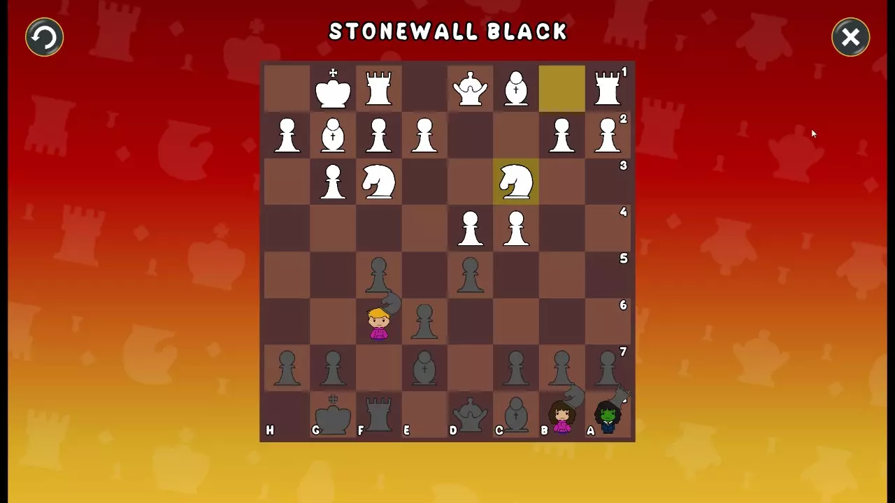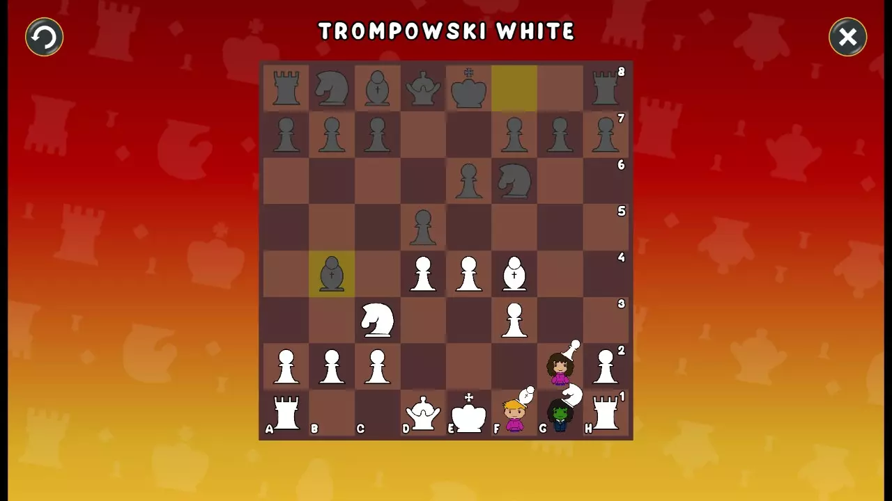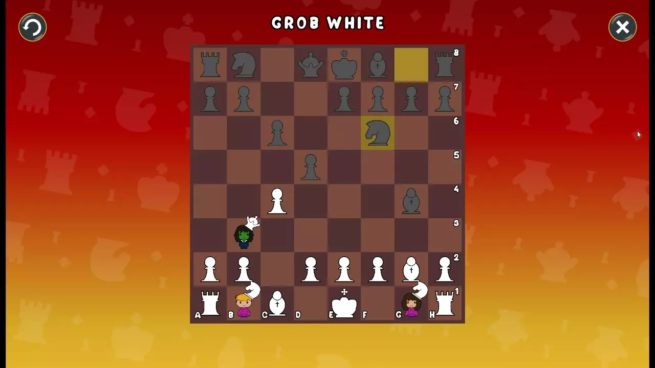 通过所有关卡并收集所有成就。 前言 那么,为我们带来了有趣的国际象棋变体。这里有需要在游戏过程中保护的【孩子棋子】。冒牌特级大师奥斯特洛夫·本德尔下过17盘西班牙开局。而我们则要下足足240盘棋,既执白棋也执黑棋。AI的智能水平并不突出:有时会走出强劲的棋步,有时却显得不堪一击。我们开启最高难度【d10】,然后开始游戏……