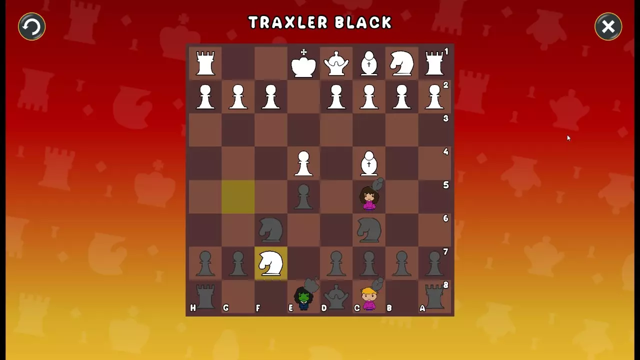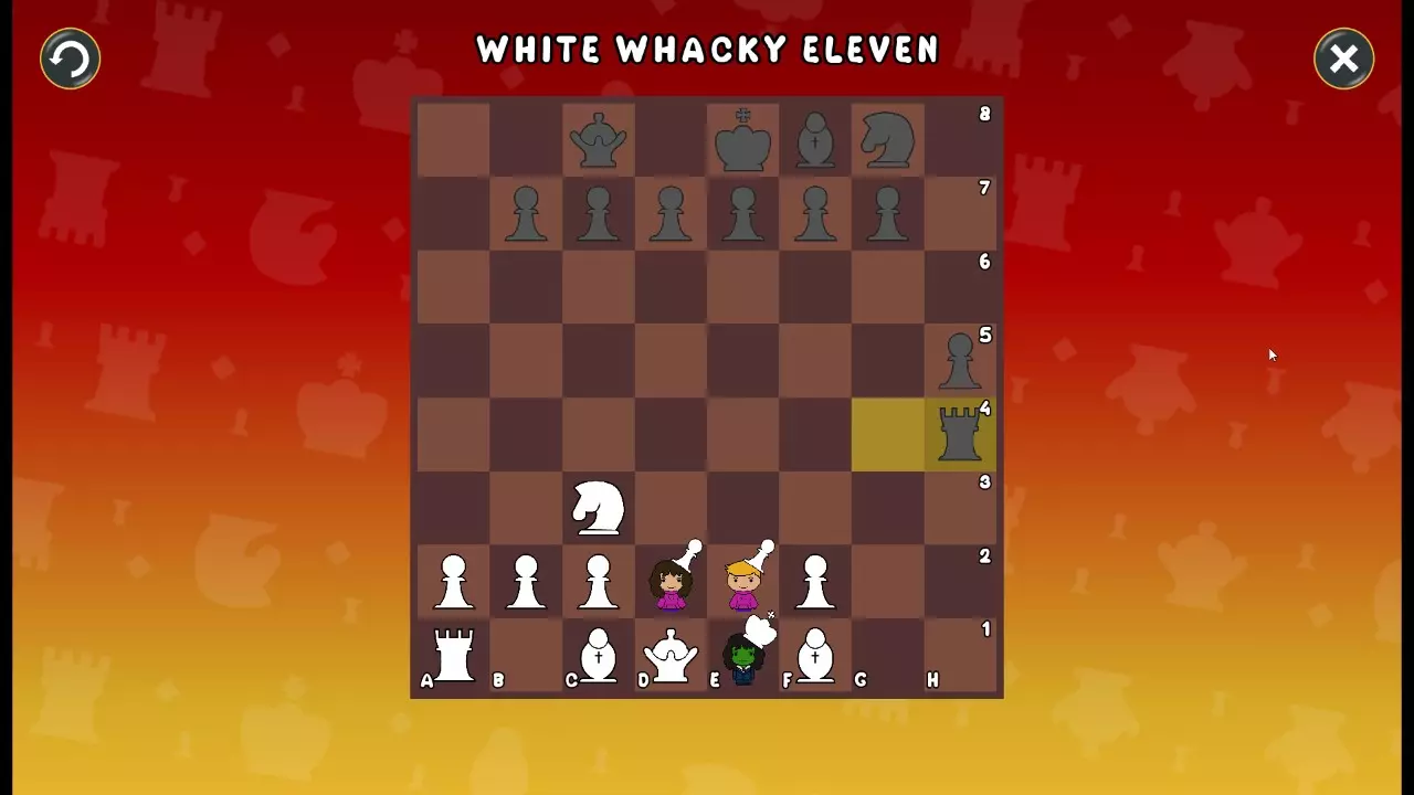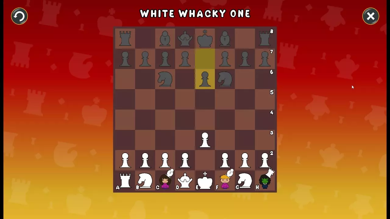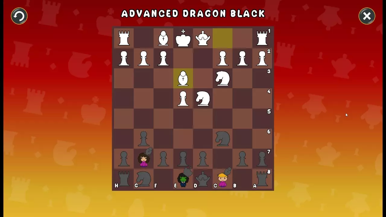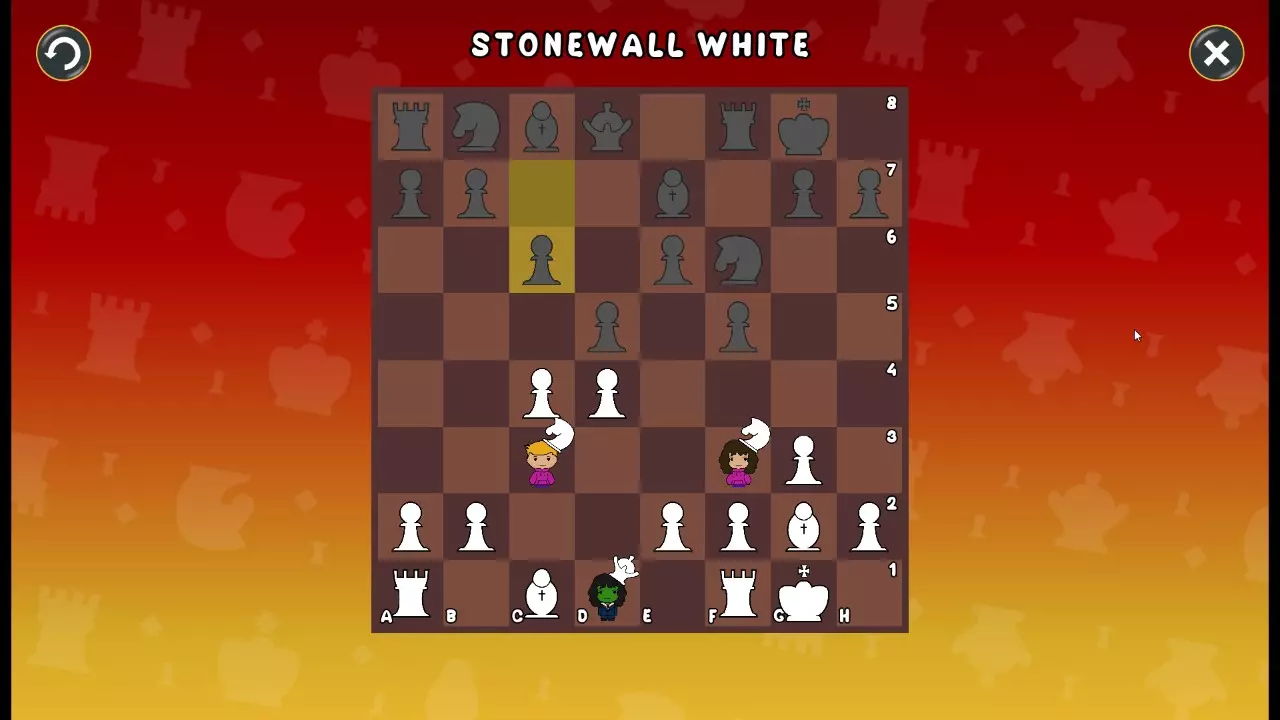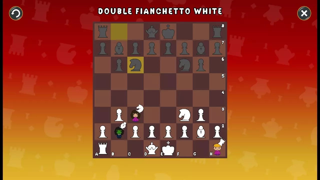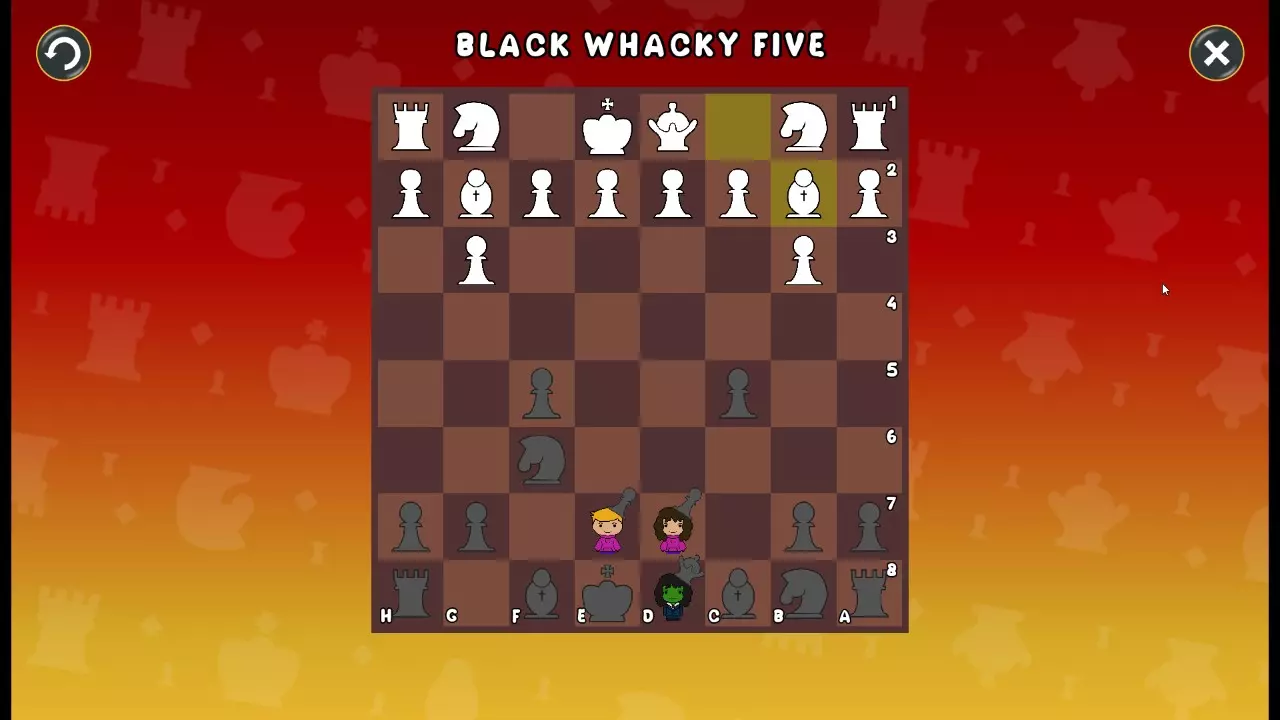 通过所有关卡并收集所有成就。 前言 那么,为我们带来了有趣的国际象棋变体。这里有需要在游戏过程中保护的【孩子棋子】。冒牌特级大师奥斯特洛夫·本德尔下过17盘西班牙开局。而我们则要下足足240盘棋,既执白棋也执黑棋。AI的智能水平并不突出:有时会走出强劲的棋步,有时却显得不堪一击。我们开启最高难度【d10】,然后开始游戏……