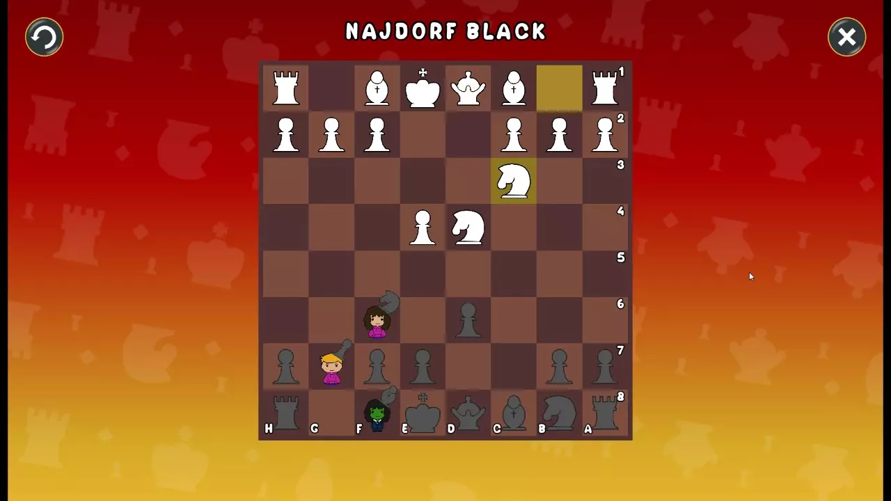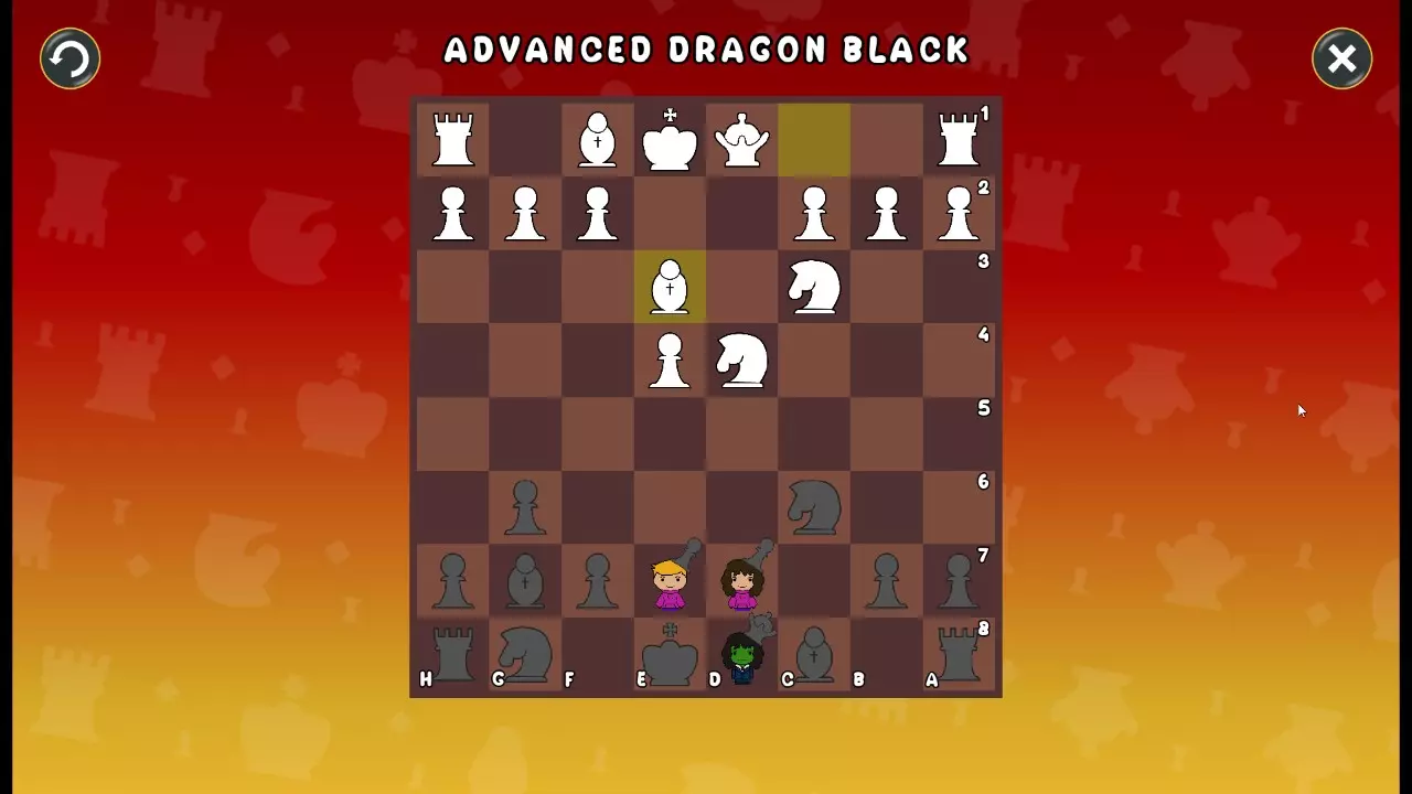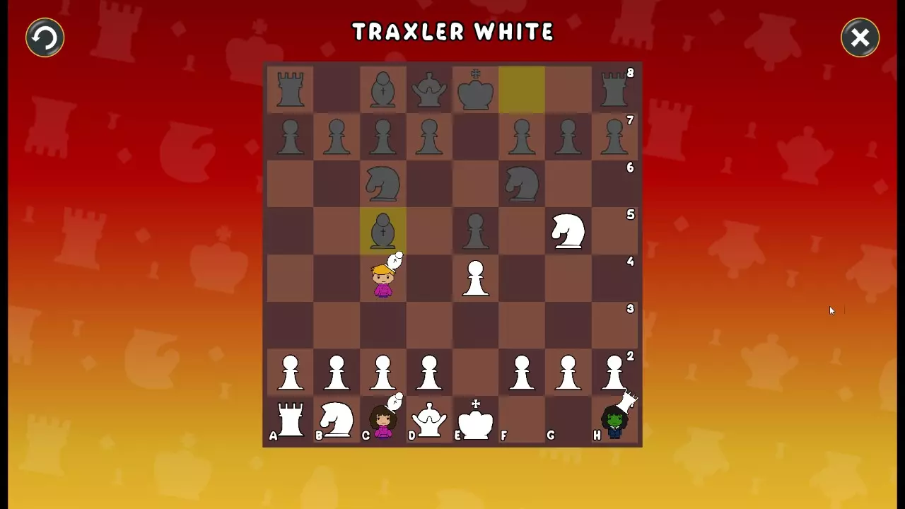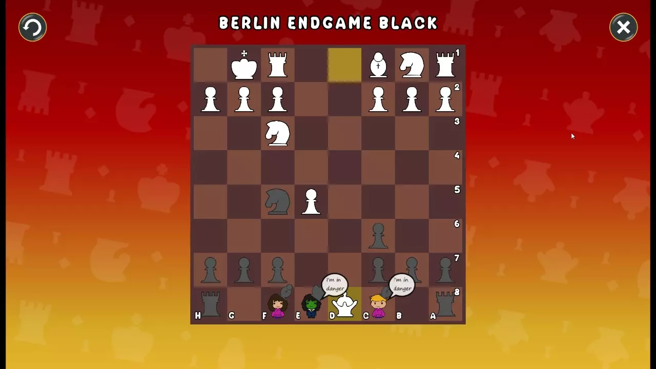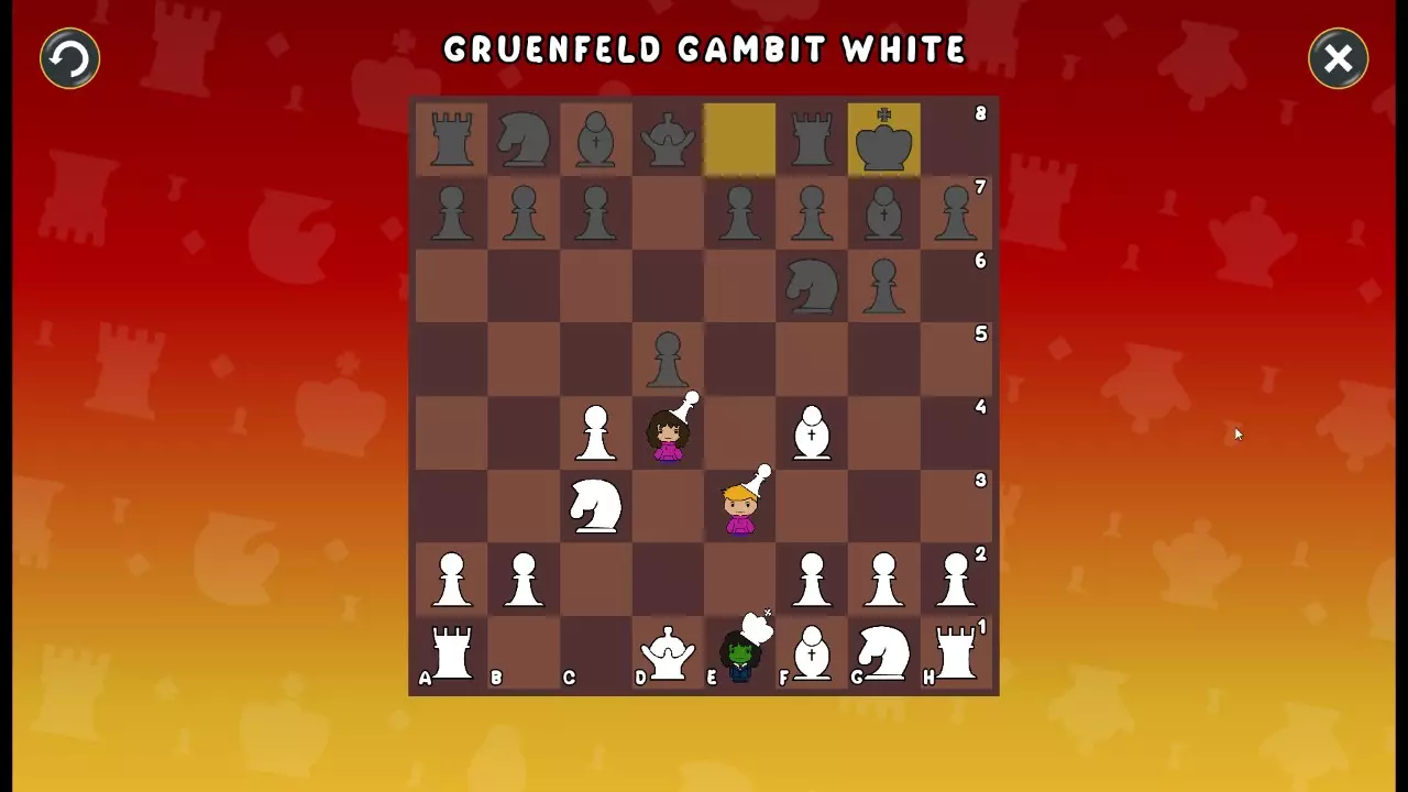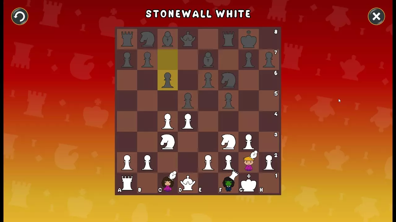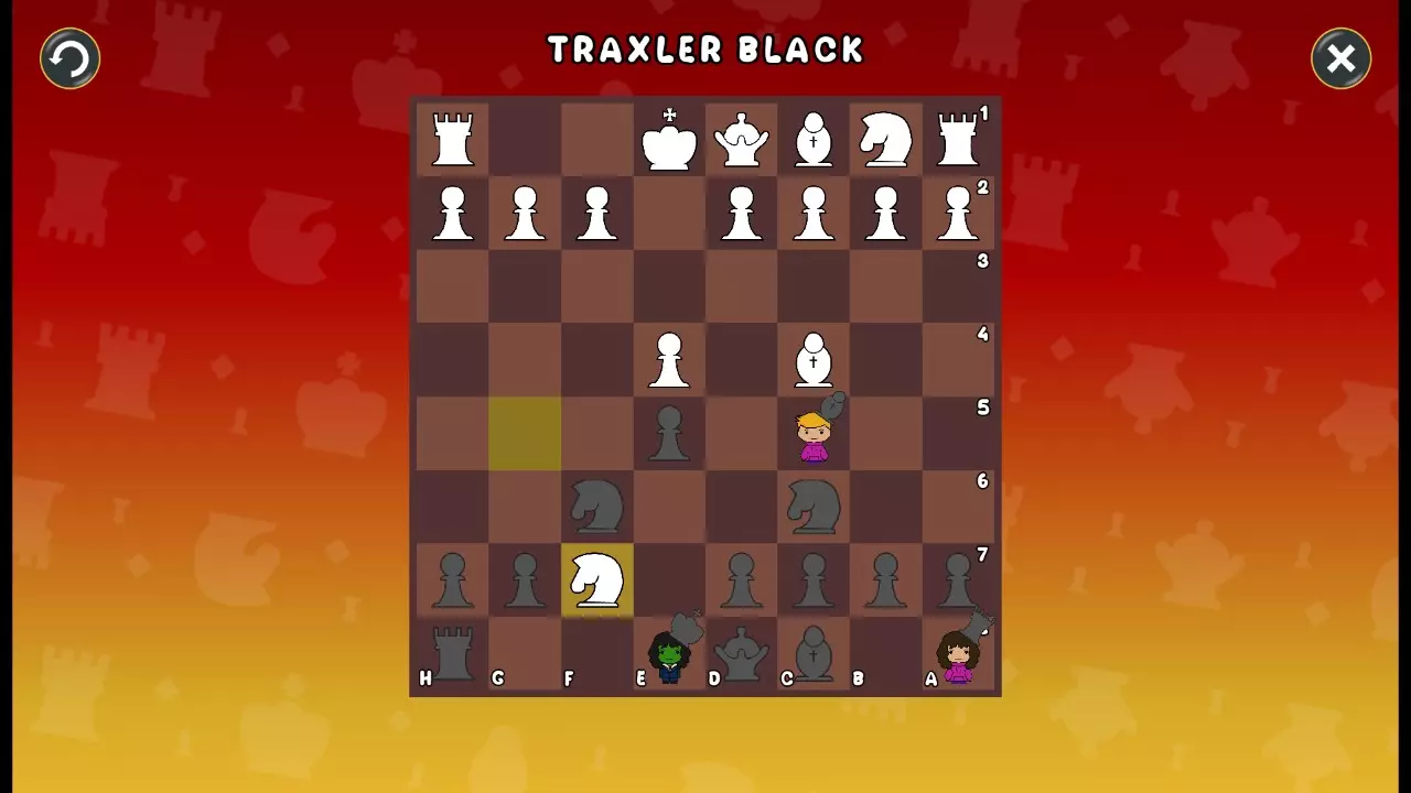 通过所有关卡并收集所有成就。 前言 那么,为我们带来了有趣的国际象棋变体。这里有需要在游戏过程中保护的【孩子棋子】。冒牌特级大师奥斯特洛夫·本德尔下过17盘西班牙开局。而我们则要下足足240盘棋,既执白棋也执黑棋。AI的智能水平并不突出:有时会走出强劲的棋步,有时却显得不堪一击。我们开启最高难度【d10】,然后开始游戏……