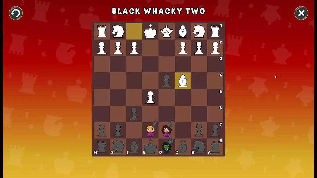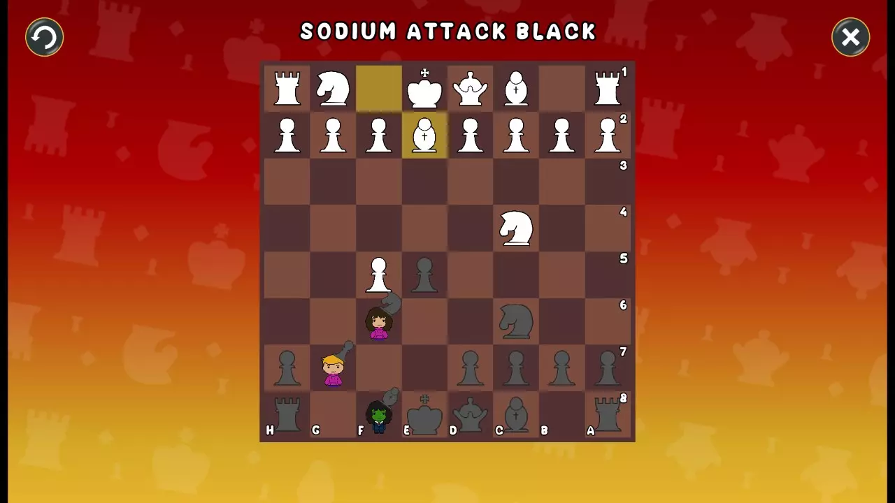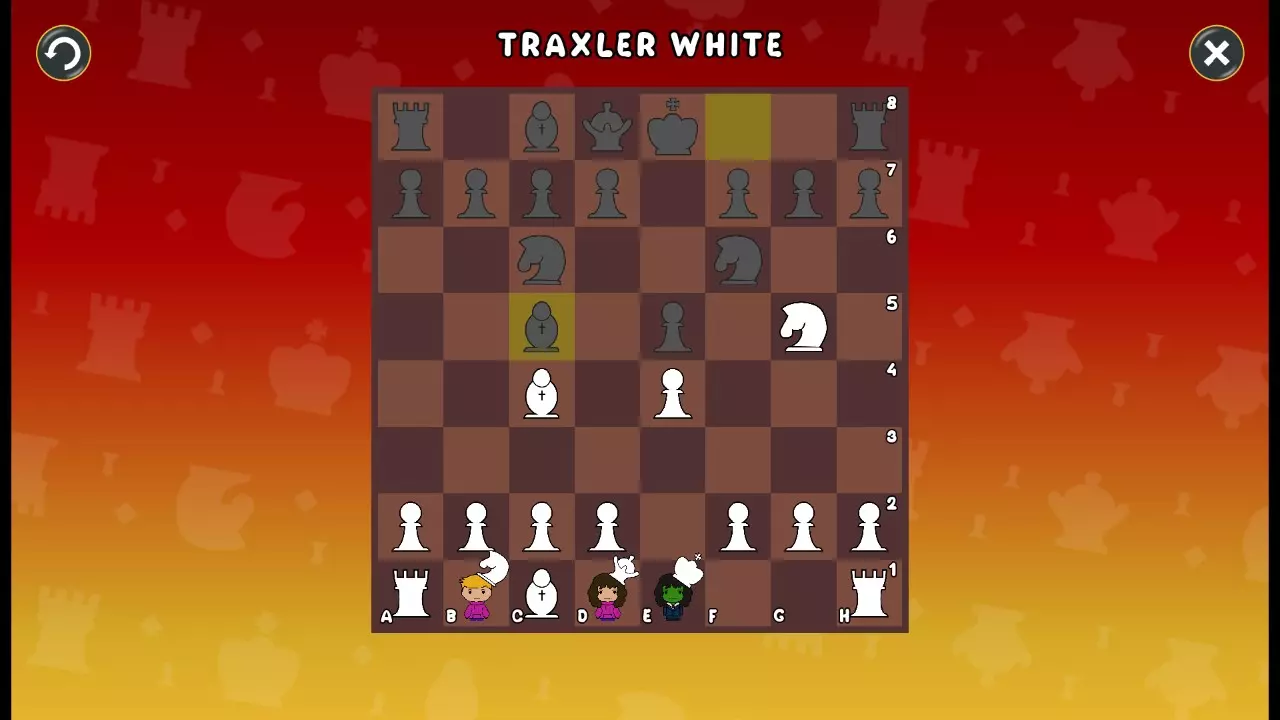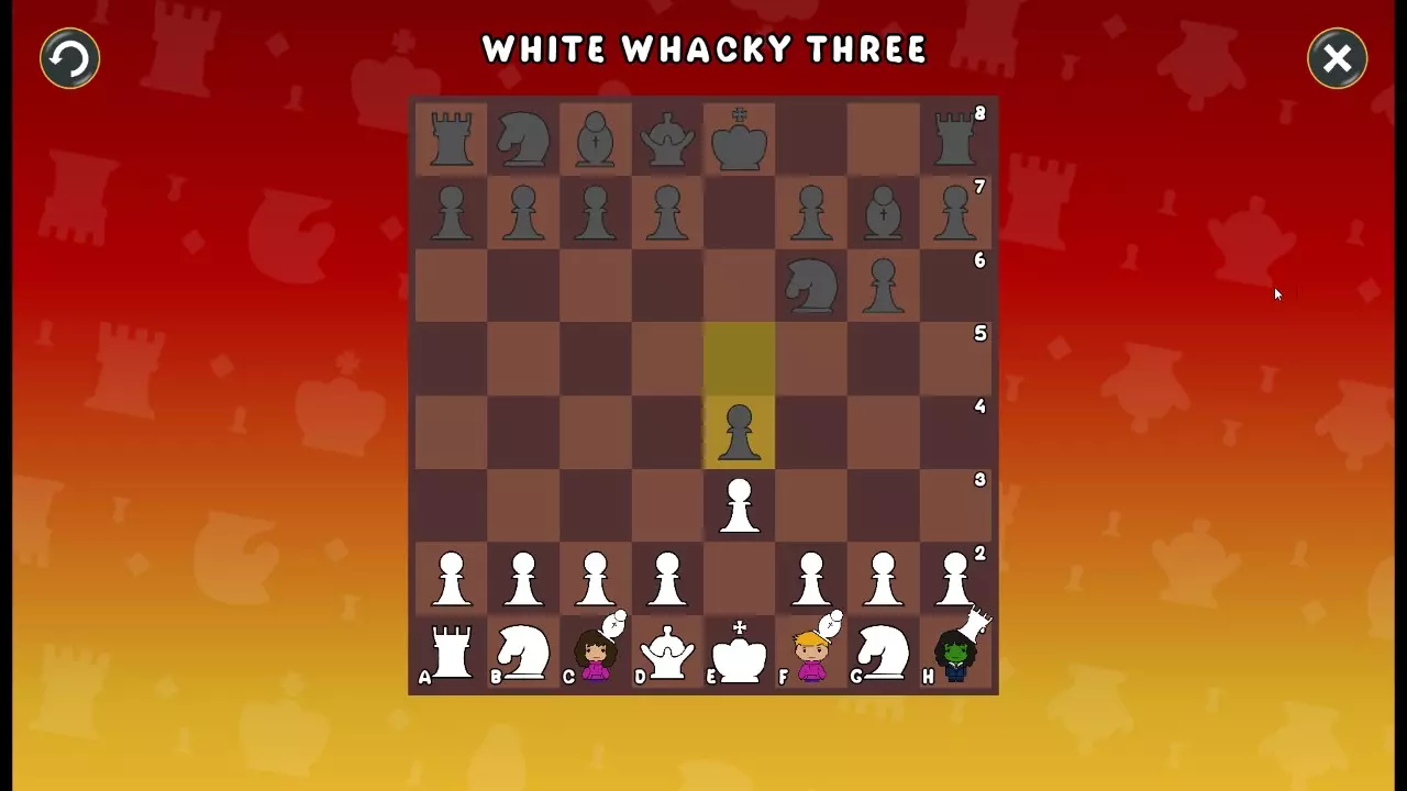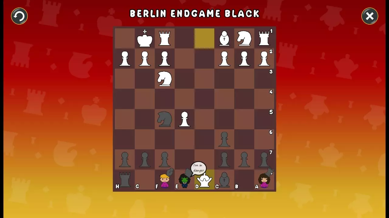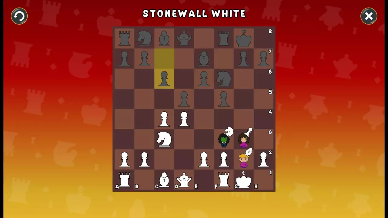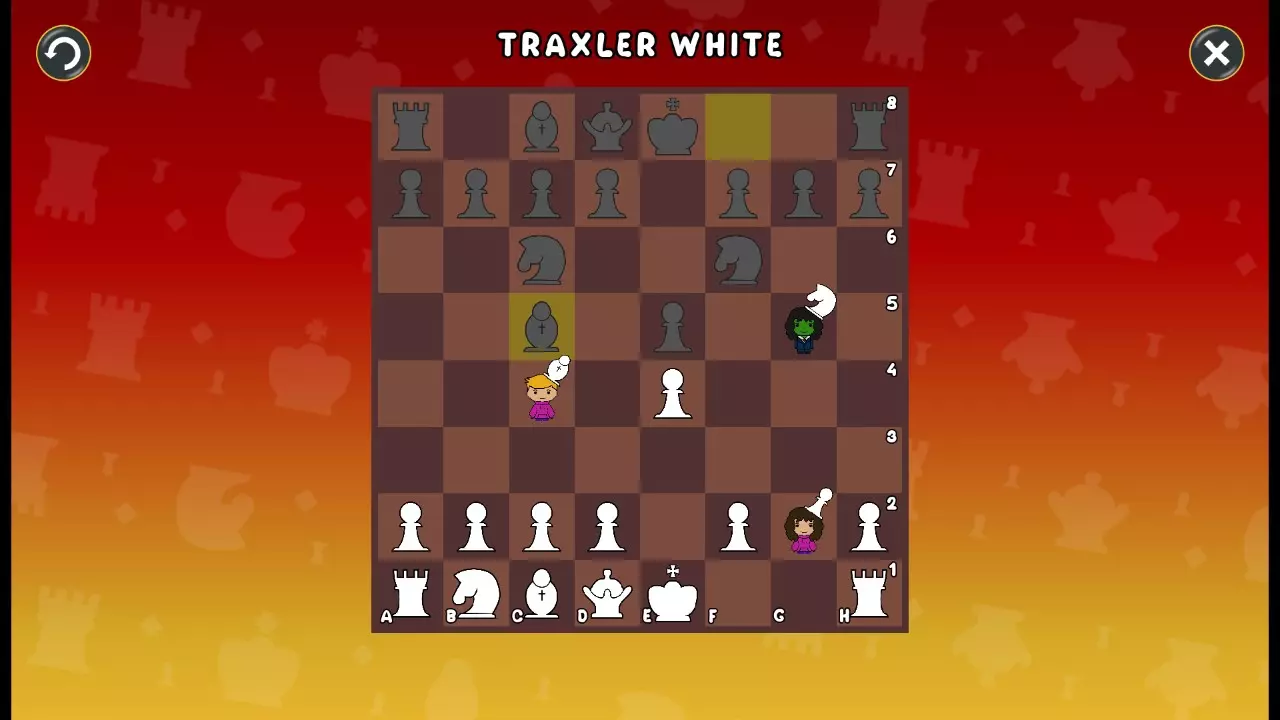 通过所有关卡并收集所有成就。 前言 那么,为我们带来了有趣的国际象棋变体。这里有需要在游戏过程中保护的【孩子棋子】。冒牌特级大师奥斯特洛夫·本德尔下过17盘西班牙开局。而我们则要下足足240盘棋,既执白棋也执黑棋。AI的智能水平并不突出:有时会走出强劲的棋步,有时却显得不堪一击。我们开启最高难度【d10】,然后开始游戏……