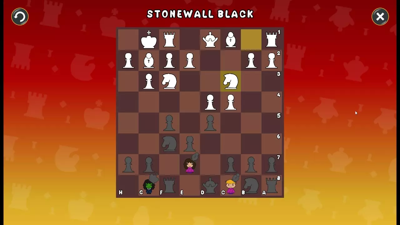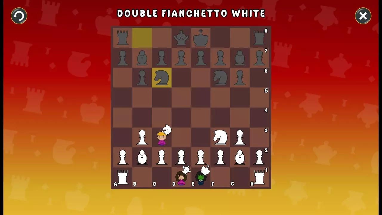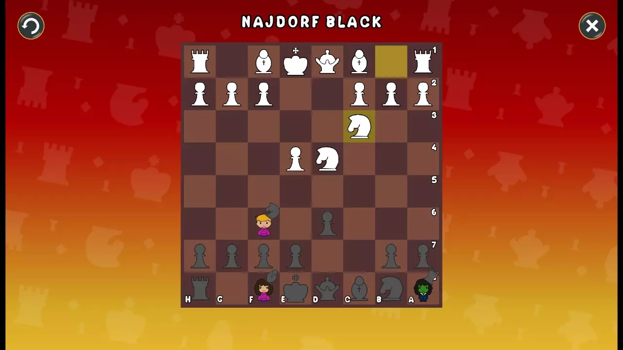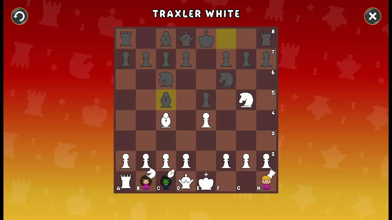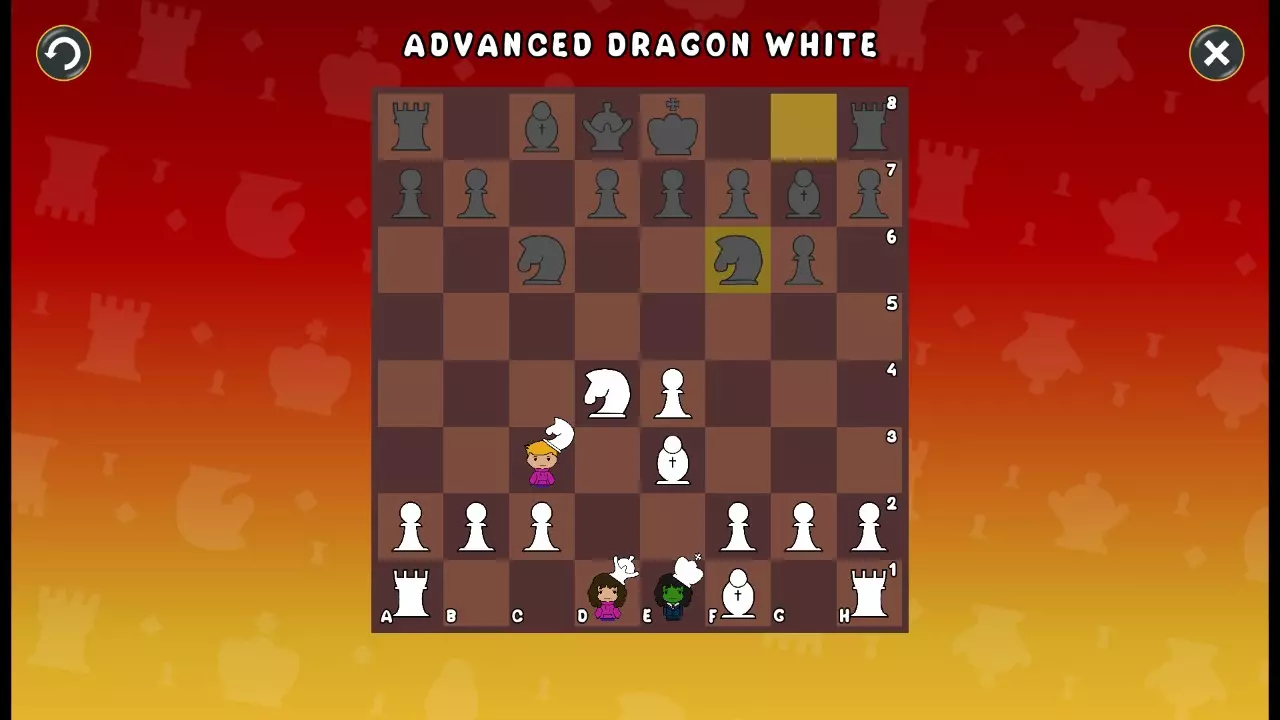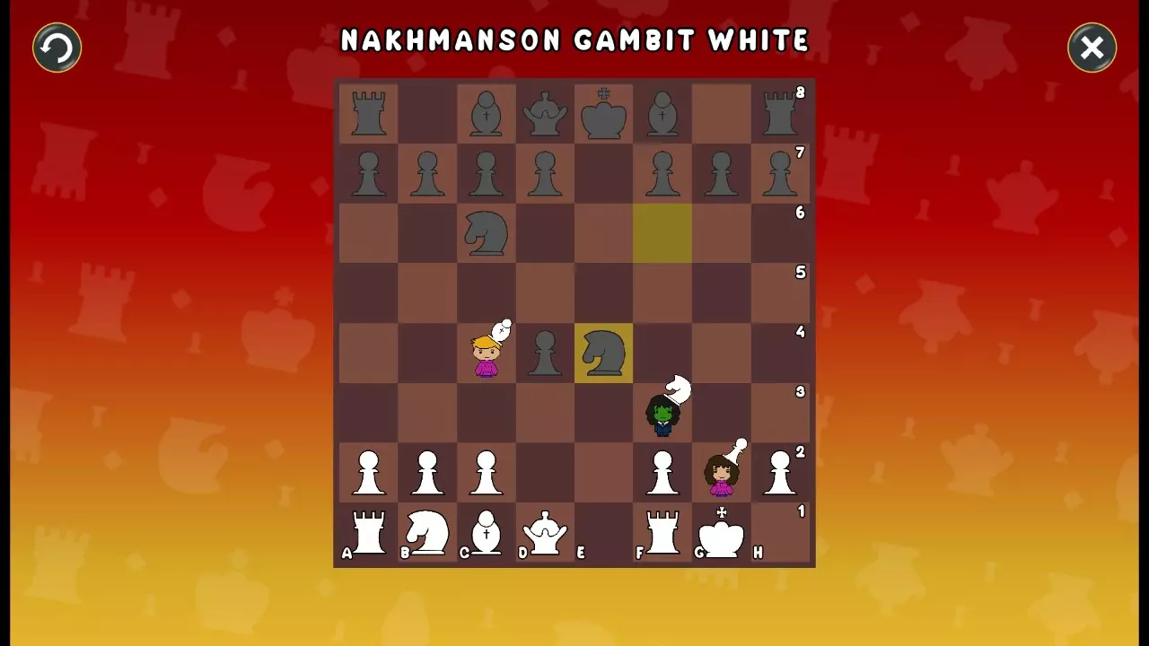 通过所有关卡并收集所有成就。 前言 那么,为我们带来了有趣的国际象棋变体。这里有需要在游戏过程中保护的【孩子棋子】。冒牌特级大师奥斯特洛夫·本德尔下过17盘西班牙开局。而我们则要下足足240盘棋,既执白棋也执黑棋。AI的智能水平并不突出:有时会走出强劲的棋步,有时却显得不堪一击。我们开启最高难度【d10】,然后开始游戏……