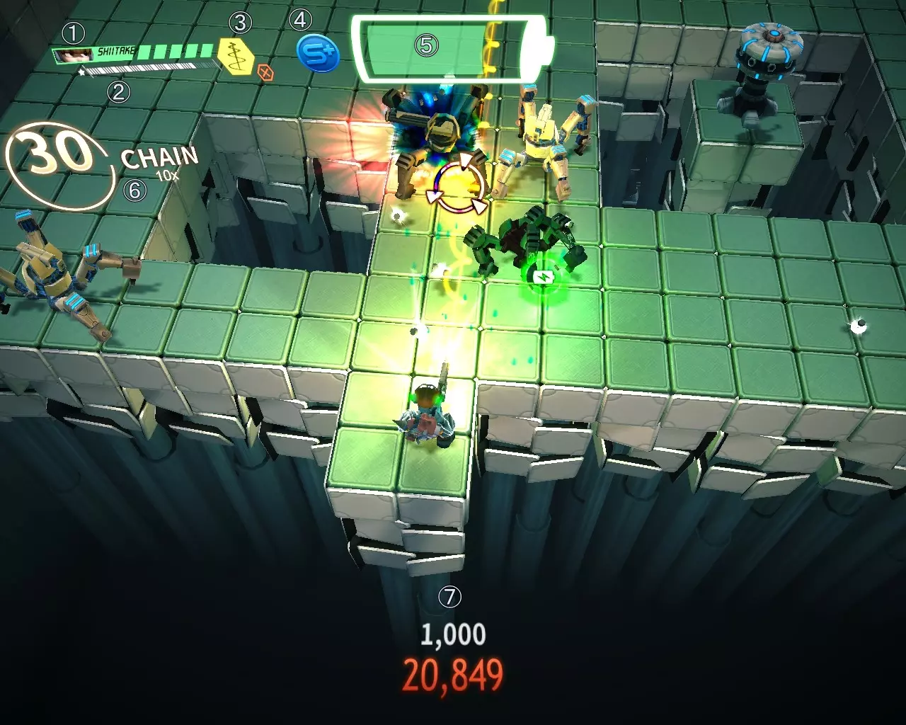 ①耐久力 ②能量提升槽 ③当前使用武器 ④S+指示器 ⑤电池槽 ⑥连击数 ⑦得分层级 基本说明 下面为你介绍本游戏的基本要素概要。 关于游戏结束 虽然一开始就说这个有点奇怪,但本作与同类普通游戏相比,游戏结束的条件略有不同。 玩家角色受到敌人的子弹或近距离攻击后,耐久力(①)会归0并倒下,但无论倒下多少次都不会导致游戏结束。游戏结束的条件只有一个,那就是电池槽(⑤)归0。不过无论是在战斗中还是倒地状态,电池都会以相同速度消耗,所以最好不要倒地,倒地后也应尽快复活。连续按下攻击按钮即可复活。 倒地会导致主武器威力降至最低等级,即时道具效果消失,此外还会扣分并中断连击。 姑且不论分数相关,主武器威力下降和即时道具效果消失会大幅降低火力,一旦被击败,想要恢复状态会相当困难。也常常会发生被敌人一路压制到电量耗尽的情况。 武器 所有安卓机器人都装备有主武器和副武器两种武器,可以随时切换。当前正在使用哪种武器会显示在生命条的旁边(③)。 补充说明一下,在上面的画面中,副武器图标显示为× mark,看起来像是无法使用,但实际上并没有这样的提示信息。这只是当前操作的安卓机器人所装备的副武器图标本身就是× mark而已。主武器可无限使用,击破敌人后会出现白色小胶囊,拾取后可进行最高3阶段的强化。强化状态可通过强化计量条(②)确认,计量条达到右端时提升1个强化阶段。当前阶段会在计量条左侧以☆标记显示。 强化后除了提升威力外,部分武器还会有扩大攻击范围等效果。 副武器相比主武器大多拥有特殊性能,不过也有不少高火力的武器。使用副武器时,自机脚下会显示类似时钟刻度的计量条。这代表副武器的剩余使用次数,当计量条充满时会自动停止使用,武器切换回主武器。 副武器计量条只有在切换为主武器时才会随时间恢复。恢复速度相当快,所以尽情使用吧。 连击与得分 在一定时间内连续击破敌人会触发连击(⑥)。连击期间获得的得分会有大幅倍率加成,对于冲击高分来说是必不可少的。围绕连击数显示的圆形计量条为剩余连击时间,需在此计量条耗尽前击败下一个敌人以维持连击。 画面下方会显示分数和层级(⑦)。 层级(Layer)类似关卡,仅存在于无限驱动(Infinity Drive)和每日驱动(Daily Drive)模式中。将该层级出现的敌人全部消灭即可进入下一层级。 上方画面为战役模式(Campaign)截图,因该模式不存在层级,故未显示。 各类道具 游戏中敌人会掉落道具。道具极为重要,请务必获取。 电池