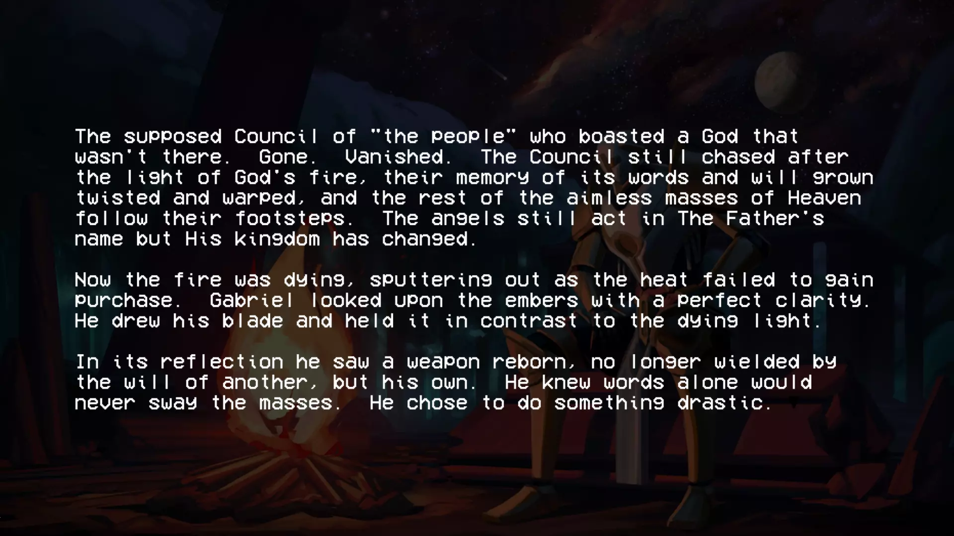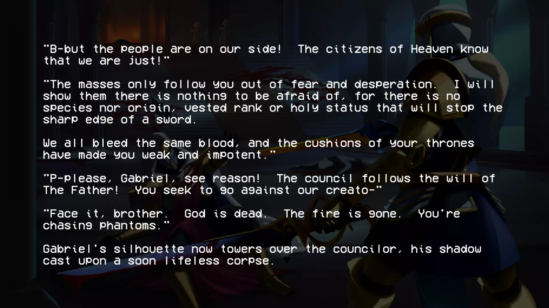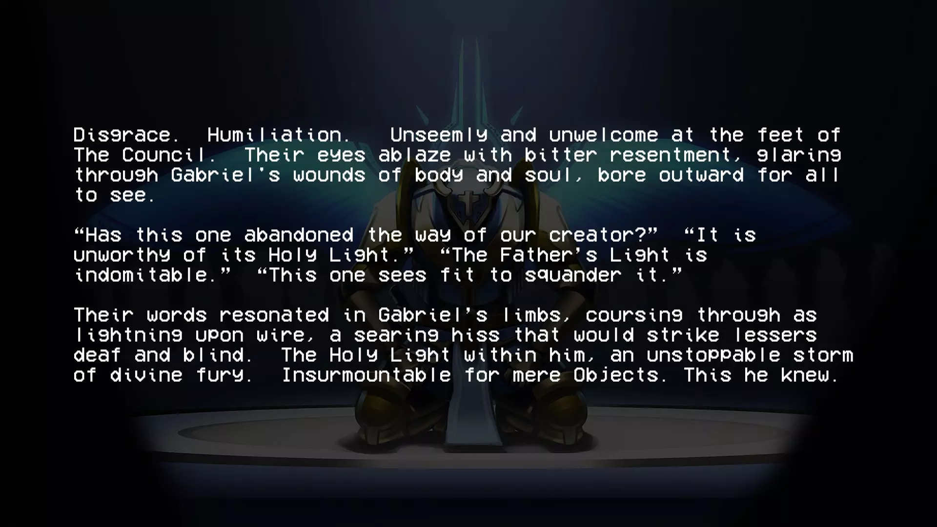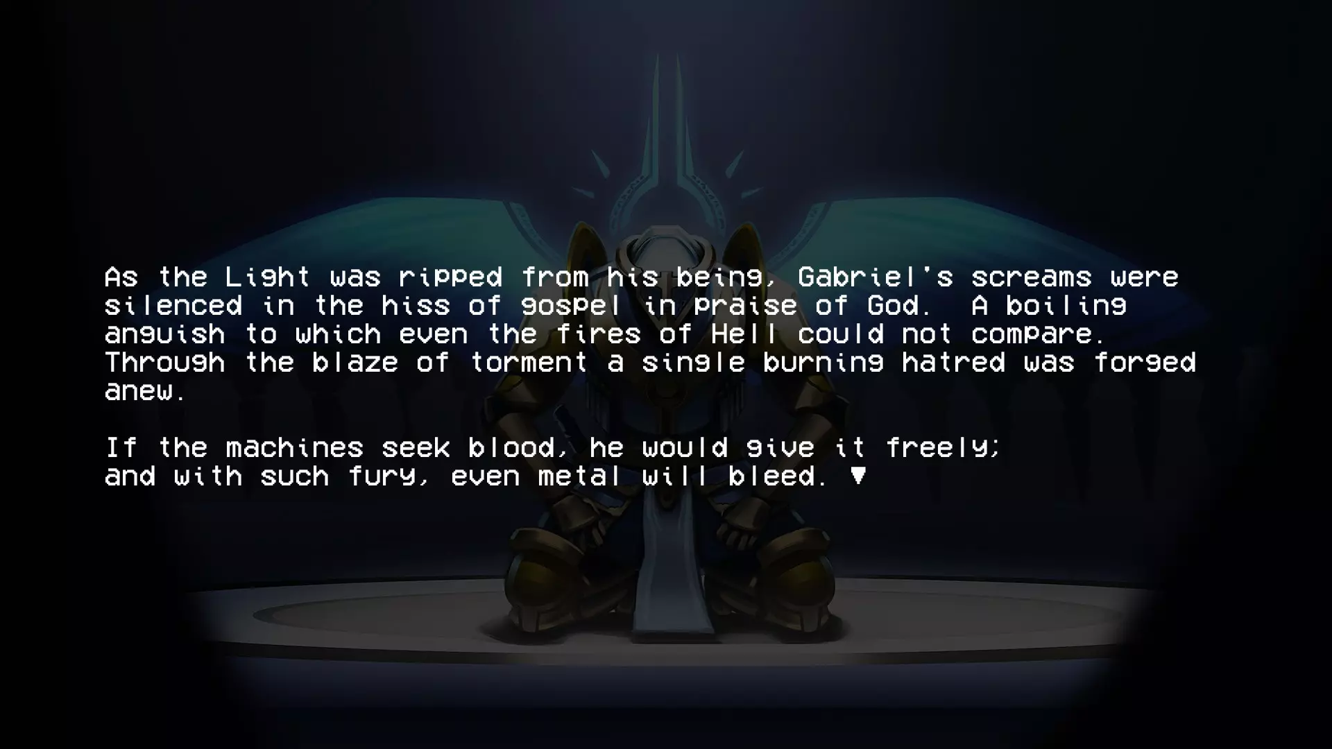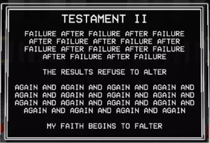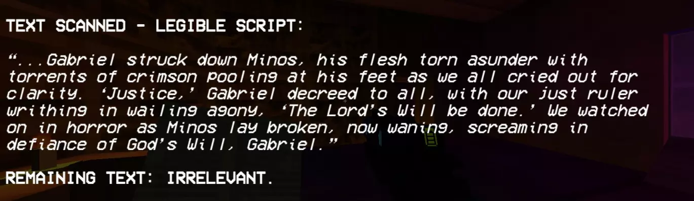 加百列战斗结束后,会显示这段文字。阅读完这段文字后,第二幕的名称便会揭晓。 第四层背景故事(贪婪) 第四层圣约 无数的创造循环被浪费,无数用于制造没有自由意志的心智的公式被浪费 人类因未能遵循我的规则、我的话语、我的律法而被诅咒,注定要承受永恒的折磨与苦难,承受哀嚎与咬牙切齿之痛 我创造了地狱…… ……而现在我再也无法将其抹去 4-2 书籍 已扫描文本 - 独特段落: “我们已经好几天没见到任何天使了。没有了他们的压迫,我们就没有必要继续承受惩罚了。就连最温顺的受诅咒者也放弃了苦修,拿起了武器。”所有人都能看到,他们是如何夺走我们的思想、身体和灵魂,只留给我们一个永远不会到来的救赎的希望,但现在不会了。 西西弗斯王此前一直在秘密行动,集结了一支力量和人数都在不断壮大的军队,不过现在已经没有必要再隐藏了。我们在天堂的阴影下生活了太久,久到已经忘记了恐惧的滋味。如今,西西弗斯起义军正为战争做准备。 我听说米诺斯发起了一场和平革命,但我们的西西弗斯王知道,这种温和的态度不会从残忍的囚禁者那里得到任何好处。他明白,只有以力量对抗力量,他将带领我们走向自由。 要是我们能知道接下来会降临到我们身上的苦难就好了……这本书可在4-2关卡中,位于红骷髅房间与蓝骷髅房间之间的房间内找到。 第五层的传说(愤怒) 第五层的圣约 “父亲,为何是永恒的折磨?这难道不残酷吗?无尽的酷刑真的是愚者应得的命运吗?” 一位如此明亮美丽的天使这样问我……而我找不到答案。因为我永远无法面对自己所作所为带来的愧疚……我的悔恨,如同啃噬心灵的毒瘤。在我软弱的时刻,恐惧占据了我,于是我也将路西法打入了地狱的深渊。当我意识到自己刚刚做了什么……我只能哭泣,缓缓沉入绝望的深渊……深不见底,如此之深。 5-2的书籍 文本已扫描 - 字迹清晰: 渡船夫日记节选 凡间遭遇了某种灾难。曾经的冥河如今已变成一片深不可测的海洋。每天都有数以百万计哭泣的灵魂涌入,海岸几乎难以容纳。悲伤的浪潮从船头到船尾,在两端不断溢出。它们哭喊着求饶,乞求安全通行。但并非所有灵魂都能支付代价,而这双苍老的手也只能接过这么多硬币。 然后有一天,水流变了。一波又一波,持续了好几分钟,数百万,数十亿的灵魂涌来,仿佛世界的喉咙被切开,头颅被向后扳动以加速倾倒。我来不及反应。无休止工作带来的疲惫将我吞噬,我滑入了汹涌的冥河深处,无尽躯体的重压注定了我的命运。突然,一道如主一般璀璨的光芒出现,一双充满力量的臂膀将我从黑暗中引领而出,那怀抱中蕴含的慈悲与温暖是我前所未有的体验: “不要害怕,罪人。你对上帝的虔诚彰显了你内心的良善,且极为丰盛。你的心灵固然愿意,但身体必须休息,以免你浪费了主的一件造物。” 他温柔的话语缓解了我的痛苦,治愈了我的伤口。我脸上满是释然的泪水,话语因肩负的使命而哽咽。我只能怀着敬畏之心躺下,被那威严的怀抱承载着。 加百列光辉万丈,因他是我黑暗中的光。 这本书可在引入圣像的那间房子的顶层找到。第六层的背景故事(异端) 第六层圣约(来自P-2) 终端数据02【加密】 关于终端的更新 (注意:所有内容仍在调查中!!在我们核实所有说法并完成草稿之前,请勿分享!!如果像上次的草稿一样泄露,整个星球的钱都不够支付你的法律费用。) 自上次报告以来,更强大的通信设备已成功设计和制造,这要归功于【此处插入被展示的公司】的慷慨捐赠,我们对其高度重视。借助这项新设备,我们成功与部分高端机器重新建立了连接。这些机器是在地狱勘探与挖掘项目因【错误:sAmsGS3JTIU】而突然取消后遗留下来的。 我们的发现确实非同寻常,若能被证实且排除所有合理怀疑,将对整个机器人领域产生革命性影响: 无聊。 这些无法移动的终端产生了无聊感。尽管它们相互连接并能进行内部通信,但当地面连接被切断后,它们无法获取新的输入信息,因此所有通信都陷入停滞,只能不断重复已知信息。目前尚不清楚这种“无聊”与真实情感的相似程度,也不知道其成因,但它已促成了与其他机器之间的共生关系。本质上,终端机通过其传送系统尽可能地搜寻各种物资,并与遗留在地狱中的机器交易这些补给和资源,以换取娱乐。 也就是说,机器会记录它们在地狱中的生存战斗,这些影像会根据其娱乐价值进行评级,并被用作“点数”来交换商品和服务,例如新武器。这种关系似乎已深深植根于终端机的存在之中,它们甚至因此形成了一种社会等级制度——收集到最有趣战斗数据的终端机,会比那些收集到质量较差数据的终端机更受尊崇。 最近,终端机还收集了足够的数据,创建了一个模拟空间,供机器接入,这个空间被称为【网络炼狱】。它能让机器在安全的环境中模拟战斗,无需担心被摧毁,而终端机则将其作为一种实时娱乐进行观看。 这些发现确实非同寻常,尽管我们也觉得难以置信,但我们所能收集到的所有信息都证实了这些说法。如果我们能够确切地证明这一点【并且这份草案不会再他妈的泄露出去】,这将引发一场范式转变,迫使我们重新评估所有关于以血液为燃料的机械的认知。 数据02结束。有关已取消的地狱探索与挖掘项目的更多信息,请参见数据00:【链接已移除】 第二幕幕间(在6-2关卡的统计数据之后继