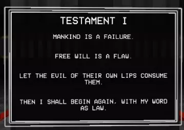 在《ULTRAKILL》中,圣约(Testament)可在秘密关卡中找到,其中包含游戏背景故事。 正如Hakita所解释的:“其设计理念是每个秘密任务的末尾都会有一份由神明撰写的‘圣约’,暗示游戏世界中已发生的事件。”这进一步拓展了游戏的宇宙观。 请自行解读。 第一层背景故事(Limbo) 第一层圣约: