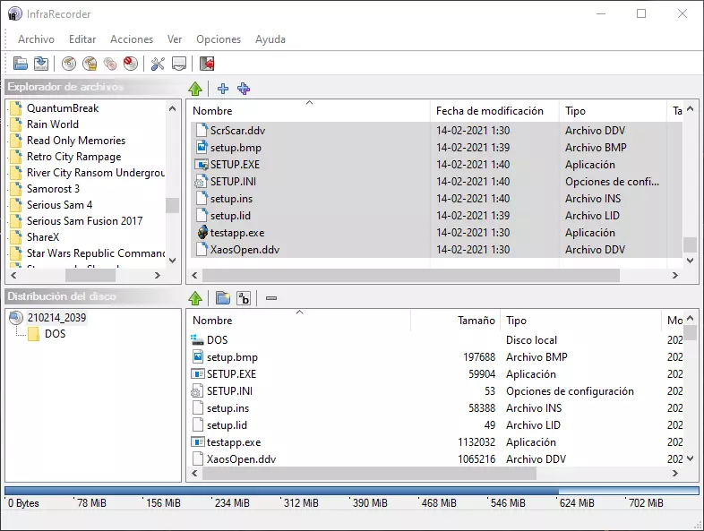 现在既然大家已经知道游戏安装在哪里了,就打开InfraRecorder,选择创建数据CD的选项,直接点击【数据光盘】按钮。 在上方会出现一个浏览器,大家需要找到游戏安装的文件夹,然后选择所有文件以及DOS文件夹。【桌面主题】和【DirectX】文件夹不是必需的,除非你确实想把它们保存在真正的CD里作为备份或纪念。 注意要从游戏文件夹内部选择文件,选中后只需拖动内容,结果会类似图片所示。