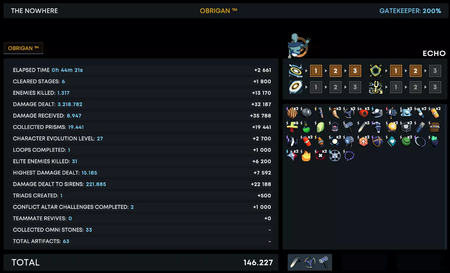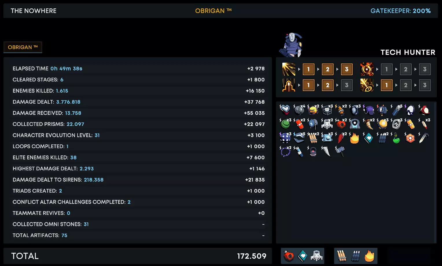 使用科技猎人角色在200%难度下获得全功能套装。根据我的经验,这是一个后期角色,所以前期游戏可能会有些棘手。我建议第一个技能选择元素和/或血液相关,并搭配攻击速度。你存活和刷怪的时间越长,就能清理越多的东西。实际上我用他搭配出了最强的build。这是我的build。