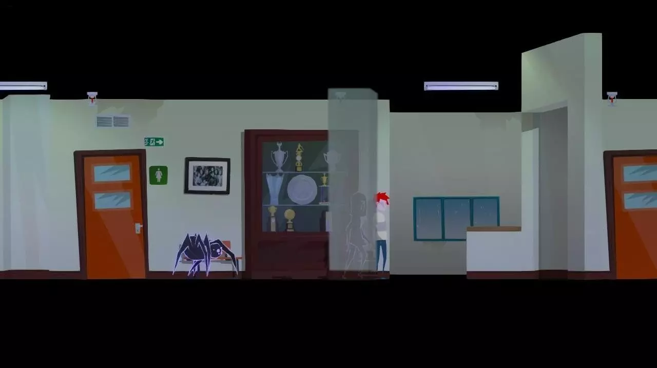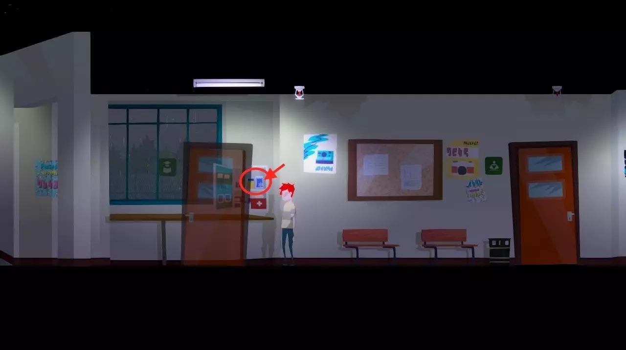 跟随女孩的幽灵。进入储藏室。 注意海报上的空白处,需要放置五张贴纸(额外任务)。这里还有一个上锁的柜子,柜子的钥匙(“抽屉钥匙”)可以在教师办公室拿到(也是额外任务)。其他现有物品没有什么价值。 离开储藏室,向左走。打开挂在教师办公室入口处的急救箱。