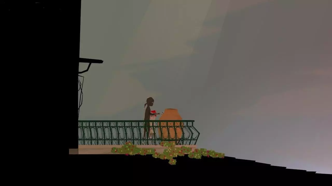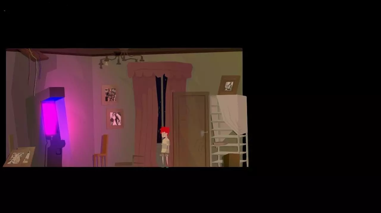 打开下层区域的门,拿到播放器的一部分。将长凳向右移动,站到上面,拿到时钟指针。离开房间。 前往右侧的门,来到阳台。发现沉重的花瓶下有第二根指针,但我们搬不动花瓶。回到走廊,向左走,前往哥哥的房间(屏幕深处左侧第二扇门)。