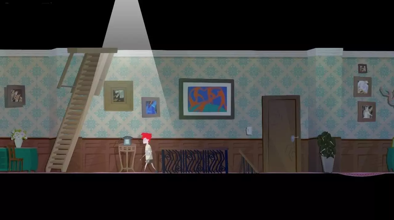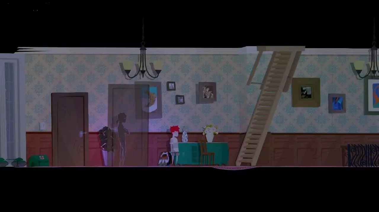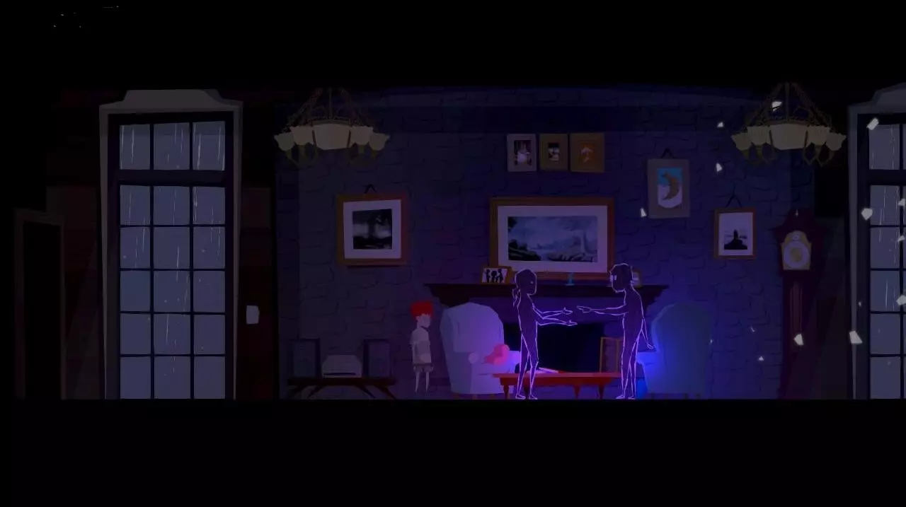 突然,架子上的花瓶掉了下来,出现了父母争吵的鬼魂。 注:如果在此之前,我们查看走廊里弟弟房间旁边桌子上的花瓶,角色会想起“自己打碎过一个一模一样的花瓶,父母因此责骂了他”,这样就不会有这段动画了。