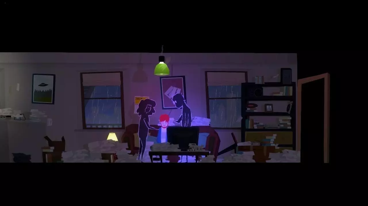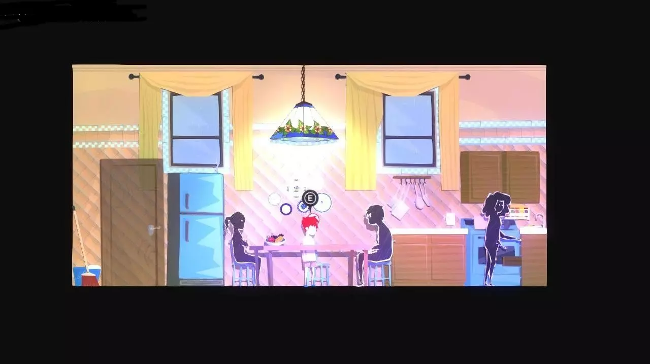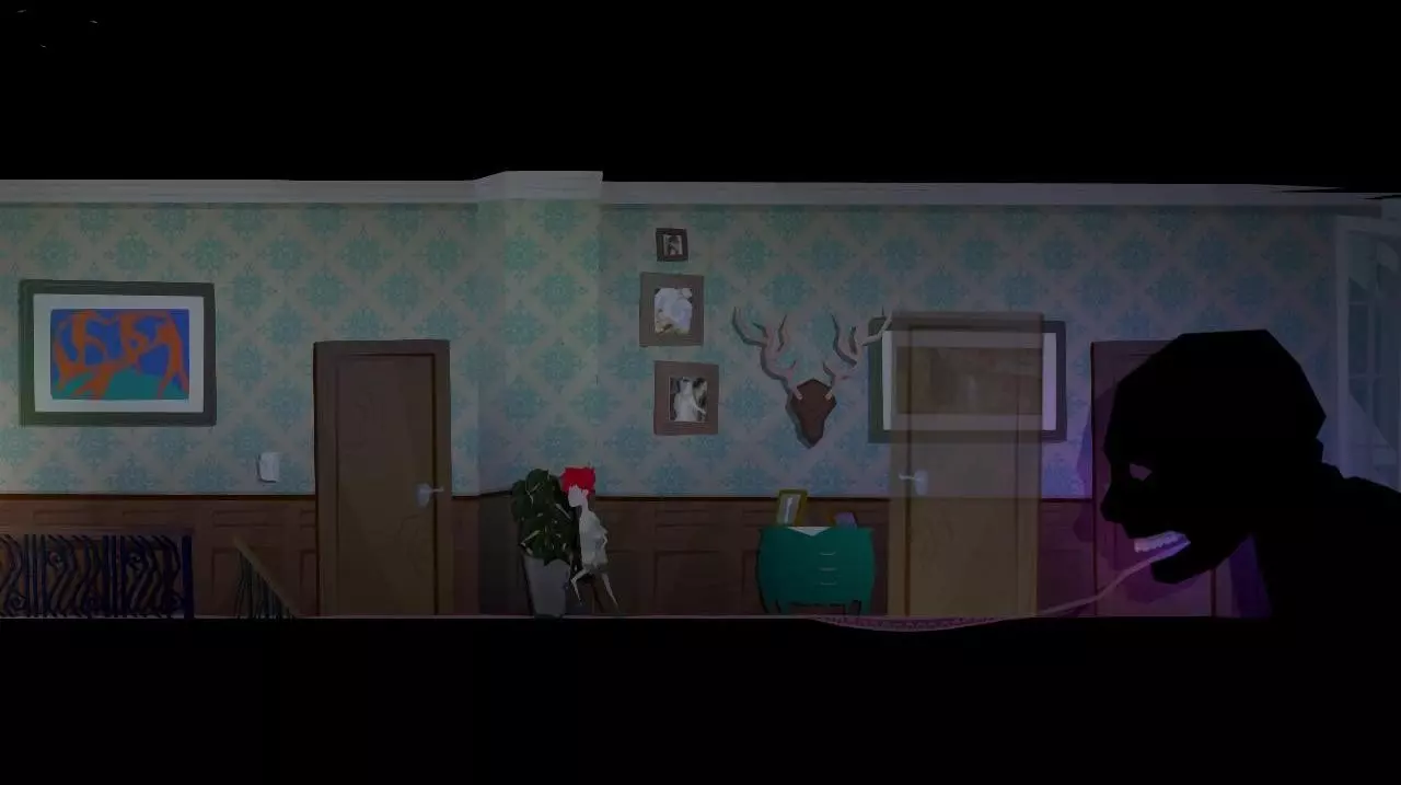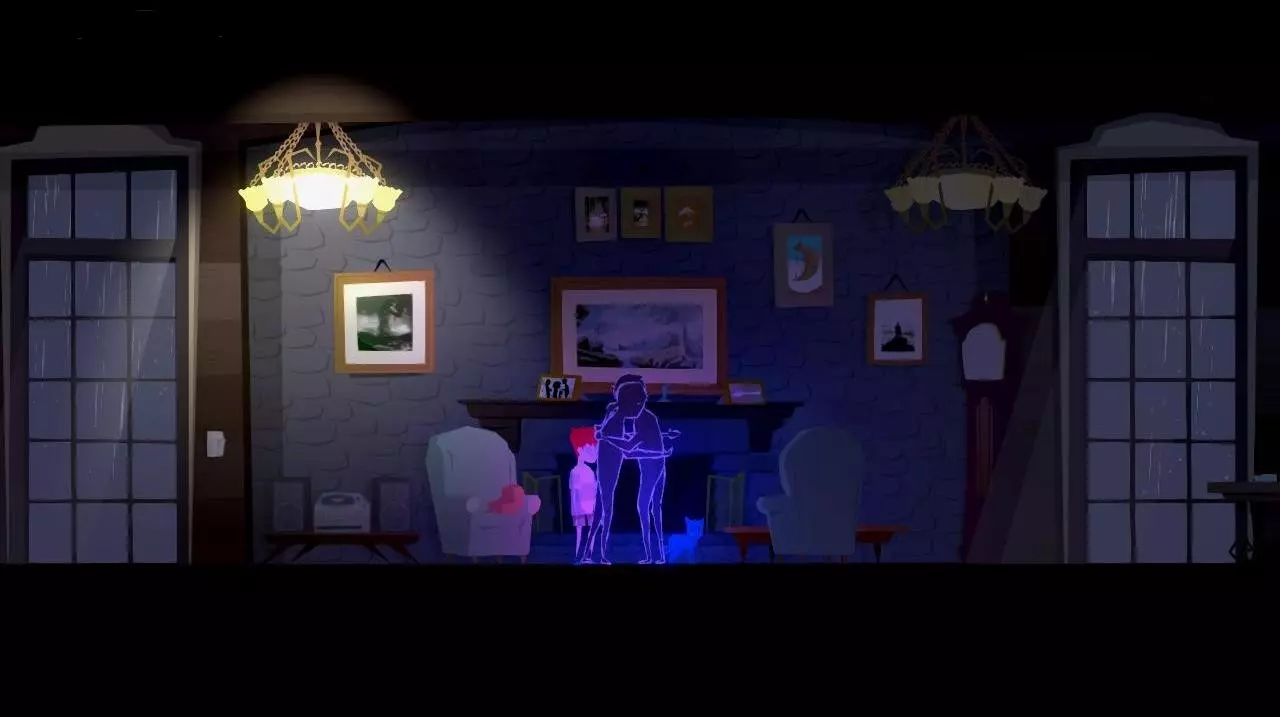 突然,架子上的花瓶掉了下来,出现了父母争吵的鬼魂。 注:如果在此之前,我们查看走廊里弟弟房间旁边桌子上的花瓶,角色会想起“自己打碎过一个一模一样的花瓶,父母因此责骂了他”,这样就不会有这段动画了。