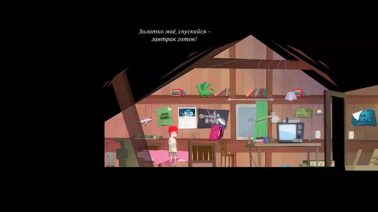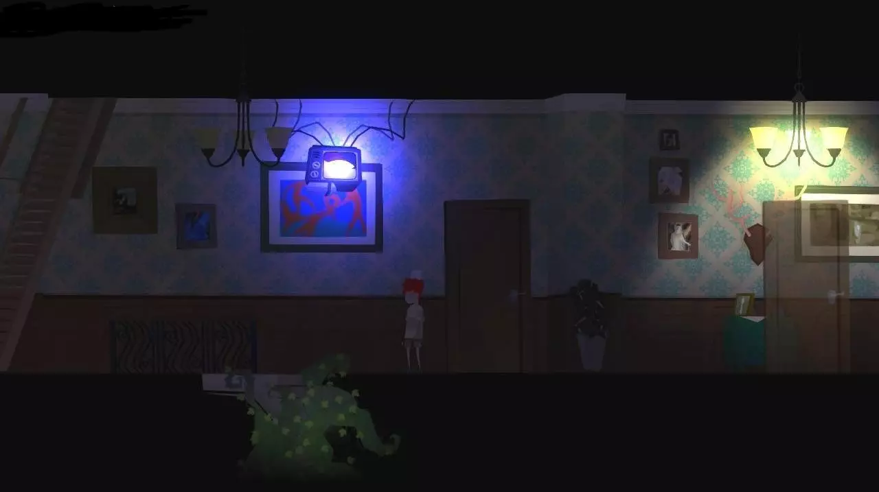 无论游戏结果如何(但如果通过3个关卡会获得成就【Чем сложнее, тем лучше.】),电视会变成行走的怪物,并打开地板上的活板门。我们向下走。到达一楼后,向右走。查看固定在天花板上的电视。