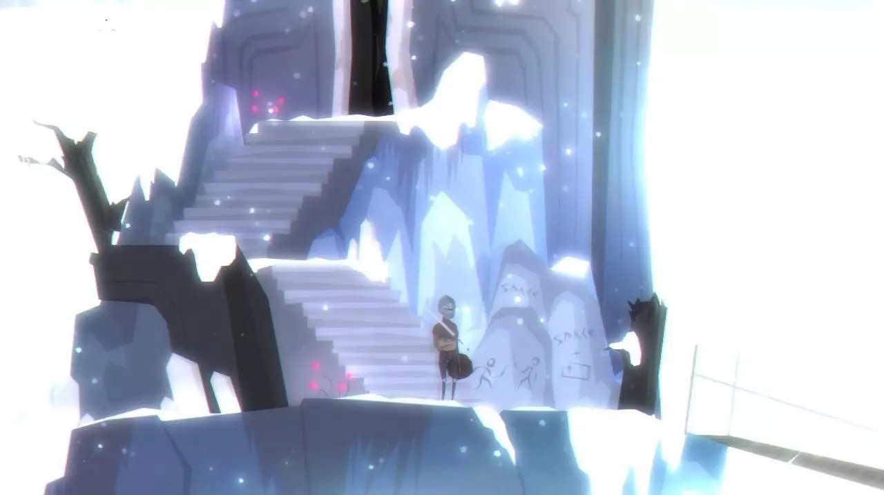 动画开场后,从上方某处落下,向右走(D键)。若要切换至奔跑状态,按住方向键的同时按住Shift键。穿过门,下楼梯(S键)。继续向右移动(D键)。