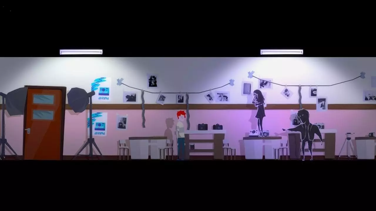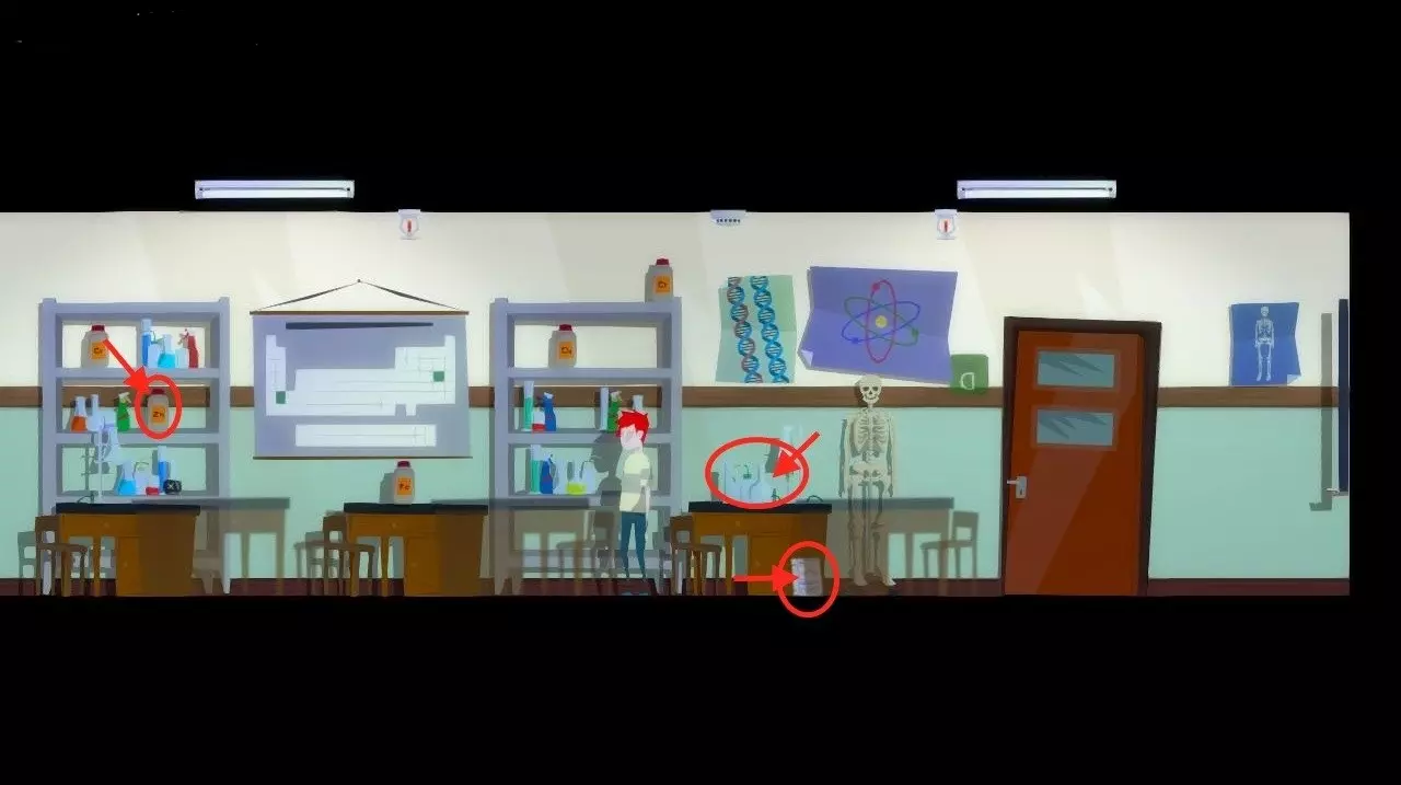 在骷髅的左边,桌子上摆放着一些设备(角色注意到只要有“合适的材料”,他就可以使用这些设备)。阅读掉落在地上的书页上的提示。向左走,将椅子向右移动,站到椅子上。取下装着锌(或“类似锌的东西”)的容器。先将“瞬间冰块”用于设备,然后再使用锌。 角色点燃了喷灯,随后发生了排气现象。消防系统启动——消防栓开始喷水。 我们跑到走廊,赶紧向右,前往消防出口。走出消防出口来到楼梯。 到了屋顶后,向左走。发现一个被丢弃的相机。下到二楼,然后前往地理教室,根据照片拿取书籍。走出教室来到走廊,向左走。进入之前不让我们进的那扇门。我们来到了暗房。