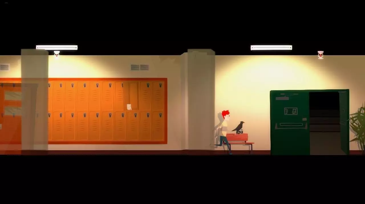 我们追赶乌鸦,但它成功飞进了紧急出口的门,门在我们面前关上了。注意天花板上的火灾警报器指示灯。 来到走廊。向右走。进入实验室(要进入之前锁着的实验室门,需要拿起钥匙并从门的右侧走过去)。