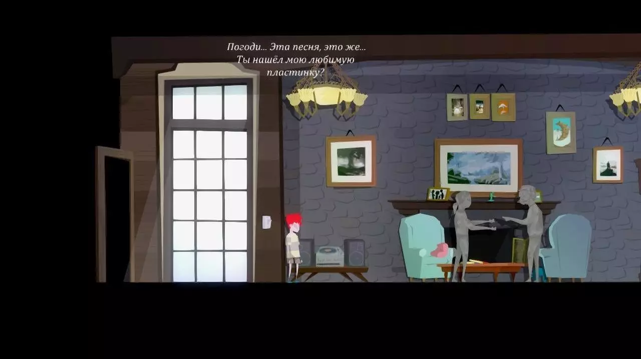 将门边的桌子向左移动(鼠标右键+D)。拿起桌子后面的唱片。向下走,向左走,进入客厅。 靠近唱片机,放入上半部分并播放从桌子后面找到的唱片。