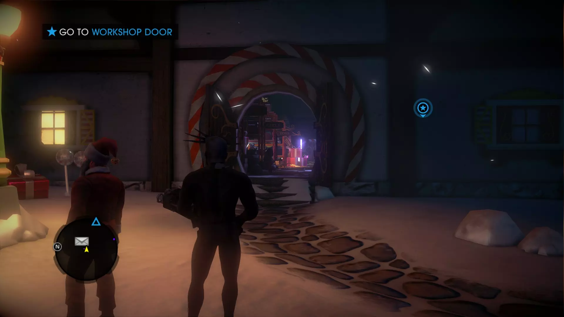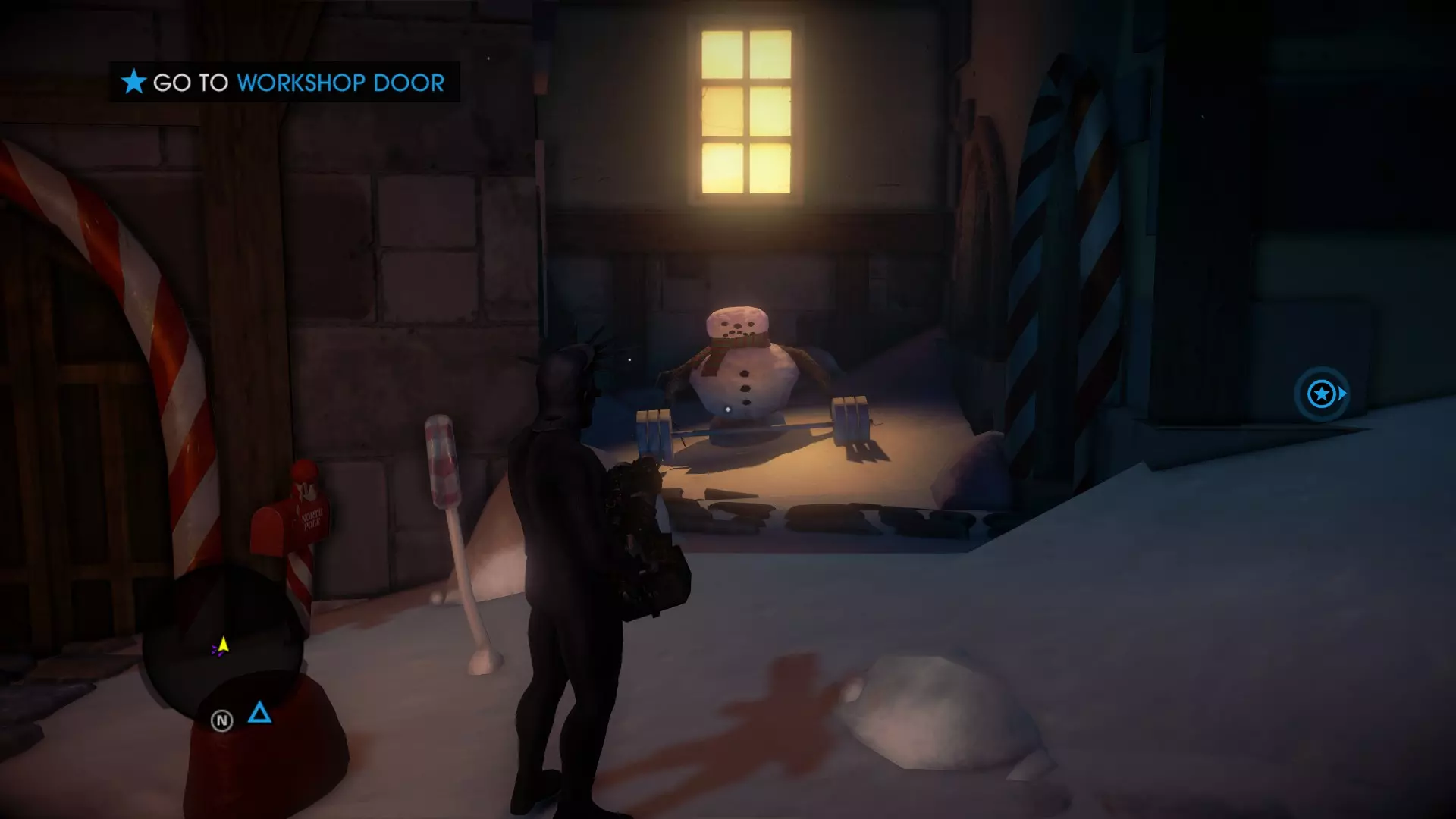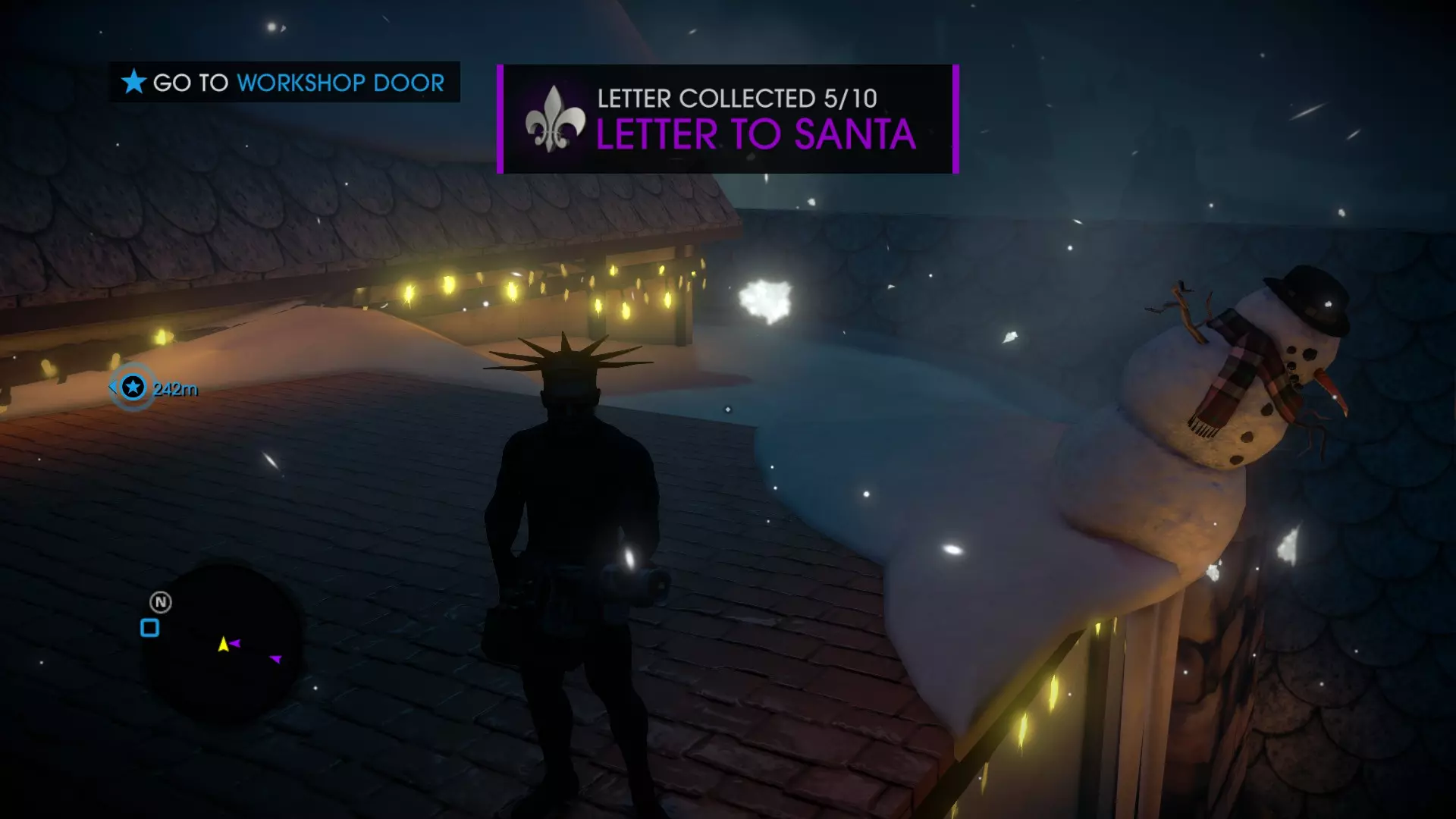 任务:圣诞前的战斗 当你重生后,穿过北极的入口大门,继续沿着建筑物外侧向右走,最终会在一栋建筑下方的圣诞树周围发现3个雪人(其中一个拿着扩音器)。抬头看向一栋建筑的屋顶,你会看到一个雪人正要从屋顶跳下,在那个屋顶上你能找到一封信。 7. 工坊信件