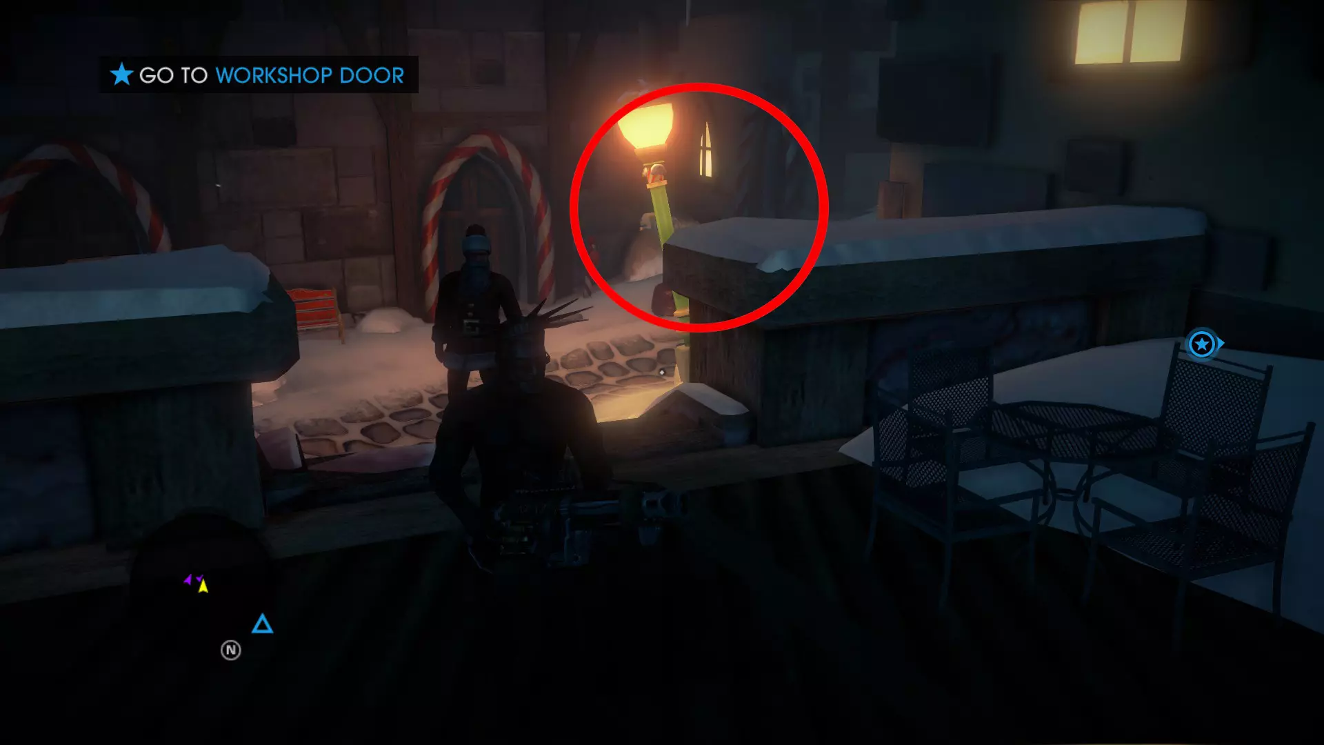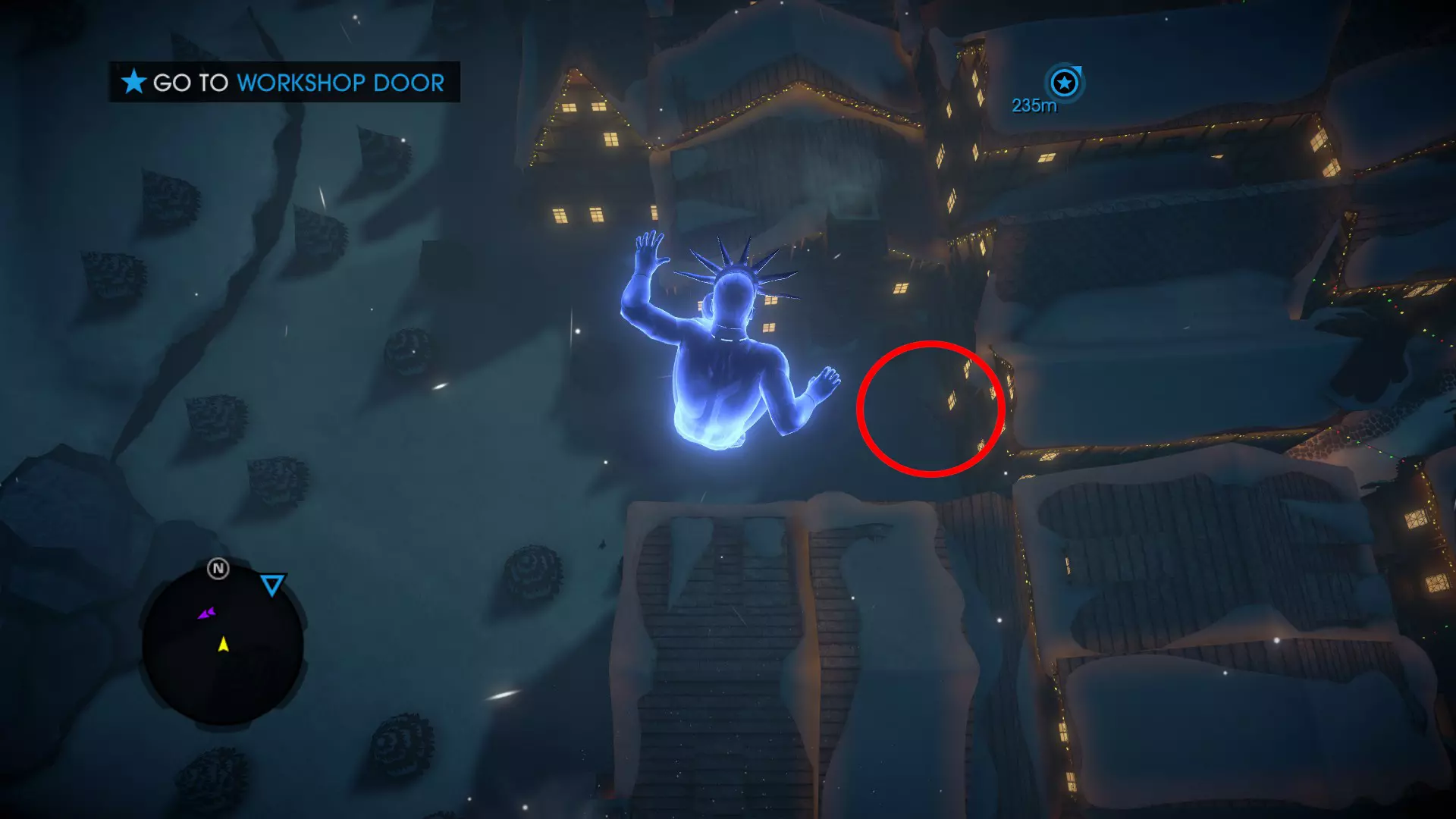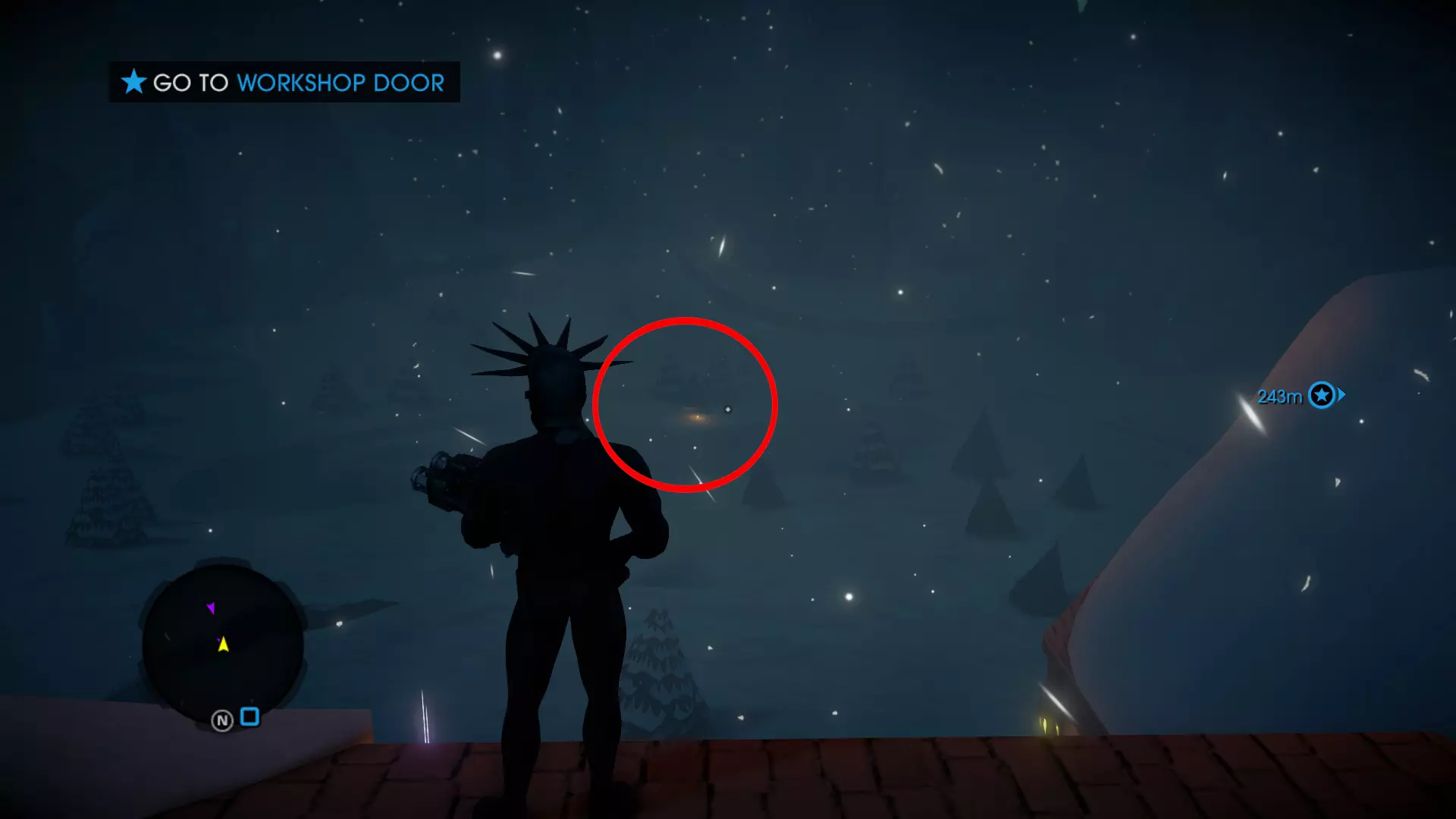 任务:圣诞前的战斗 当你重生后,穿过北极的入口大门,继续沿着建筑物外侧向右走,最终会在一栋建筑下方的圣诞树周围发现3个雪人(其中一个拿着扩音器)。抬头看向一栋建筑的屋顶,你会看到一个雪人正要从屋顶跳下,在那个屋顶上你能找到一封信。 7. 工坊信件