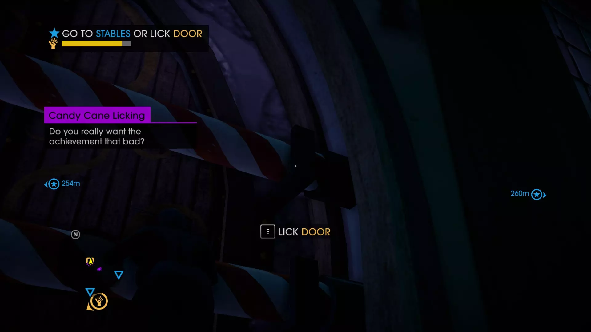 【清新薄荷!】 在【圣诞前的战斗】中一路舔完拐杖糖路障。 如何获取成就 任务:【圣诞前的战斗】(DLC的第二个任务) 在清理完圣诞老人办公室周围的敌人后,你会被要求前往入口处,届时会出现以下选项。