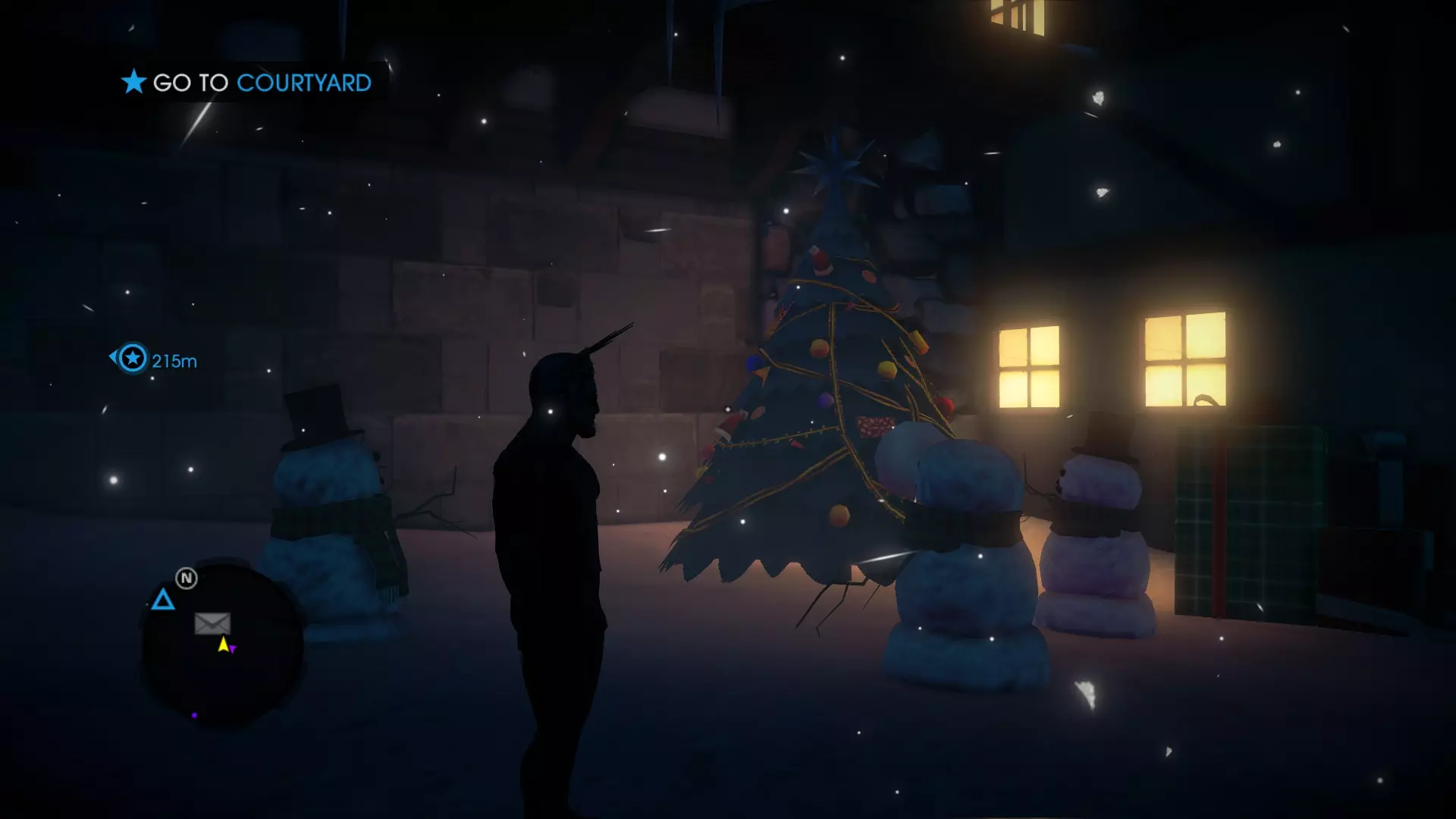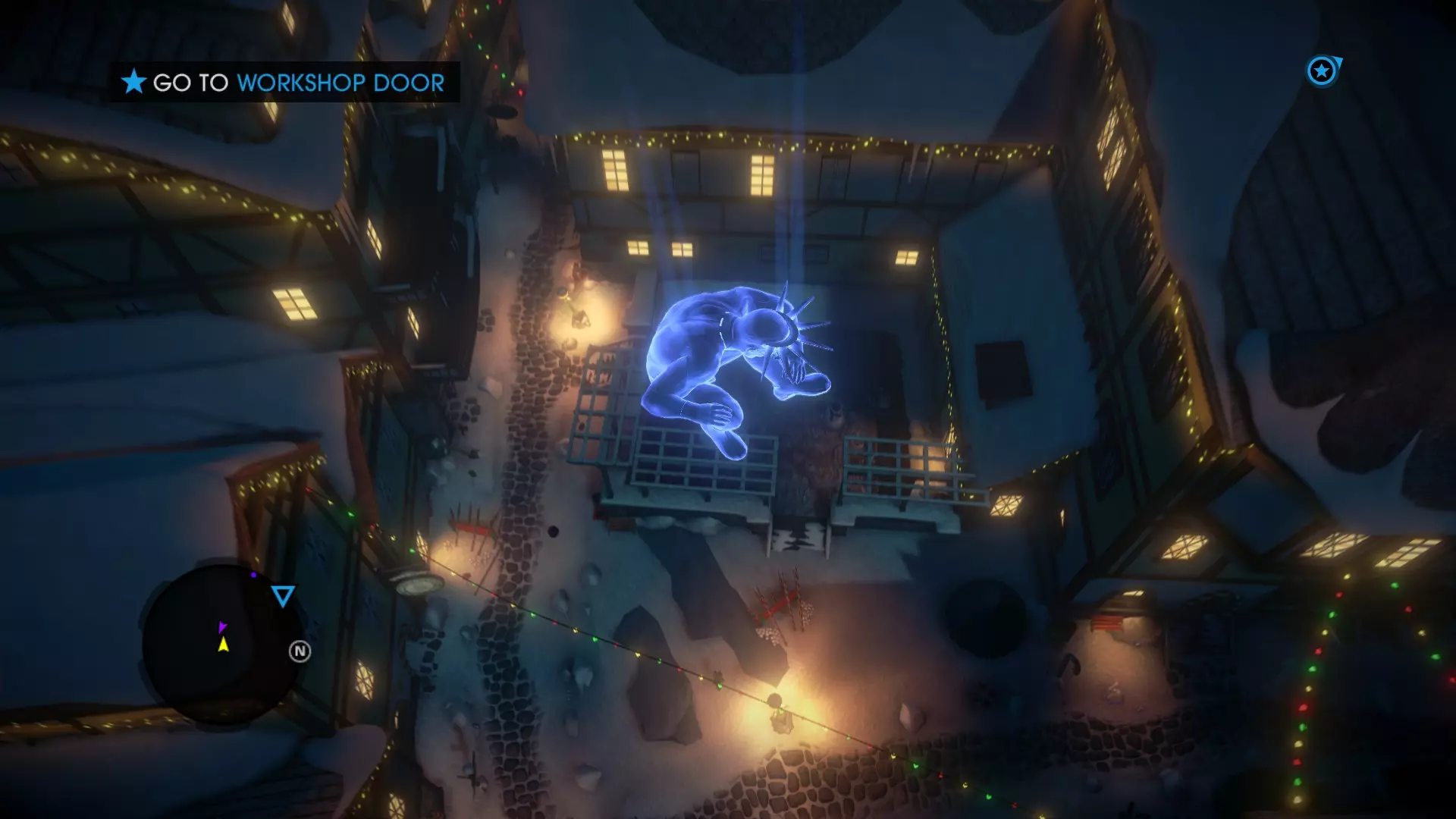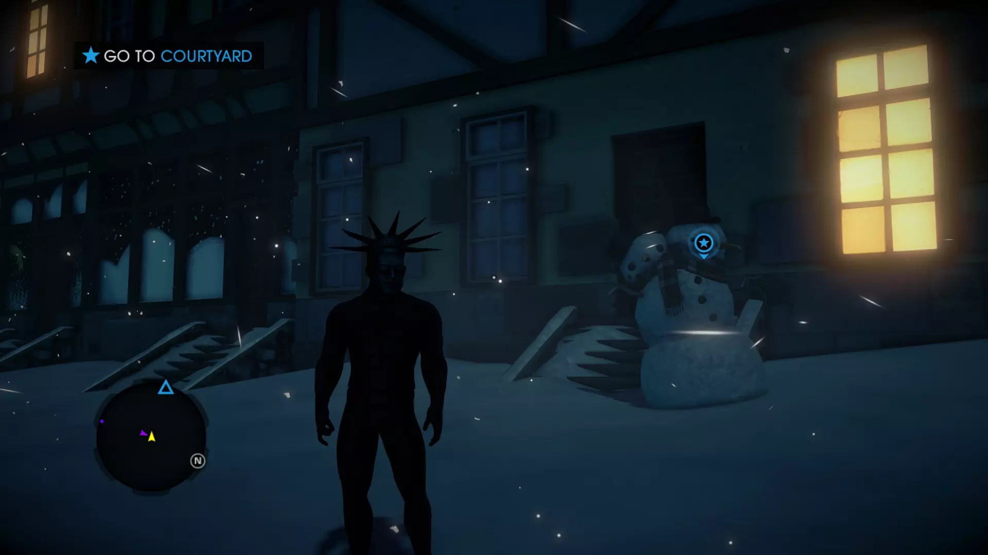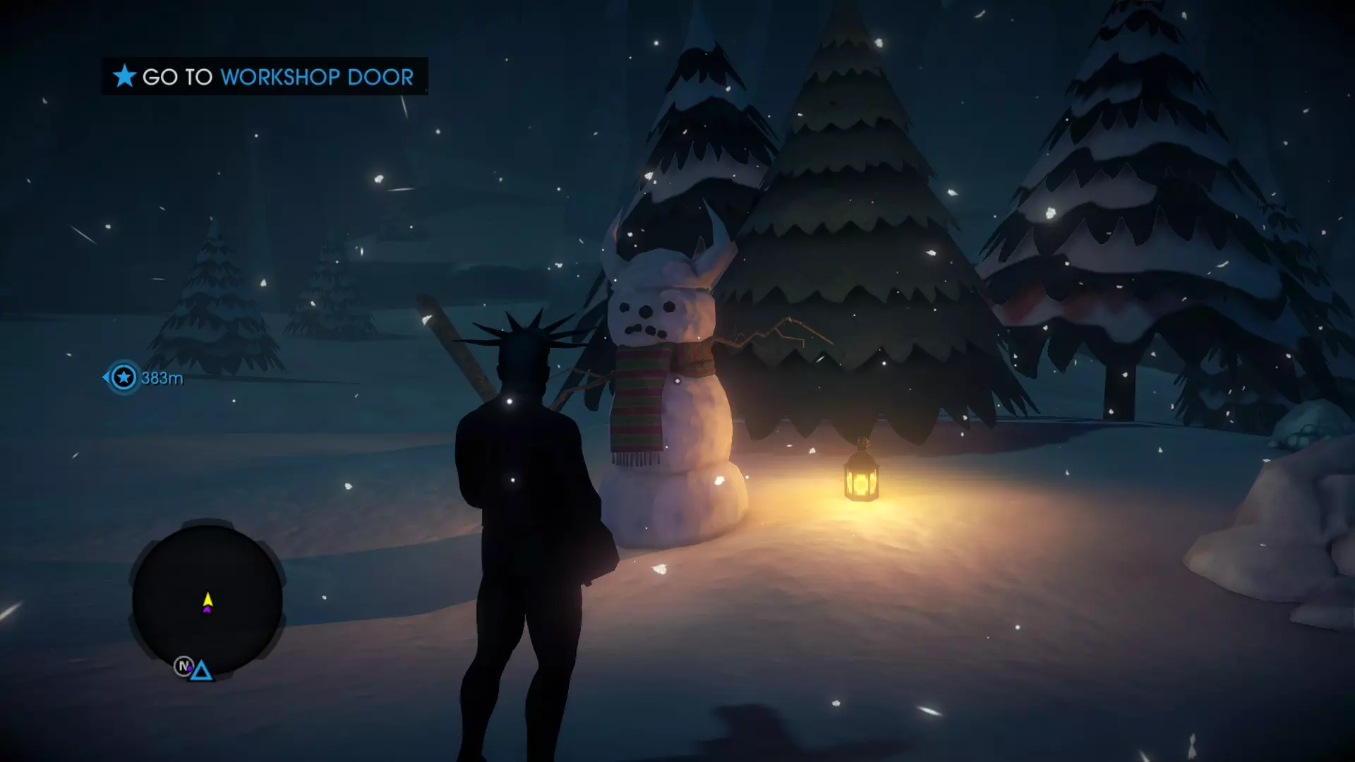 待在与之前雪人跳跃截图中所示的同一屋顶位置。如果你转过头,会看到一盏小灯。那就是维京雪人的位置。走向他,体验他那迷人的北欧口音。 5. 双头雪人