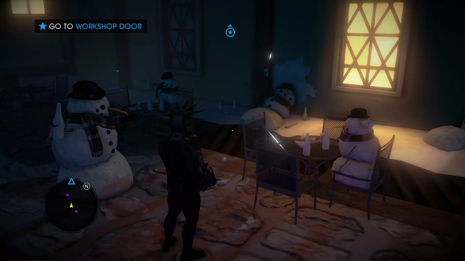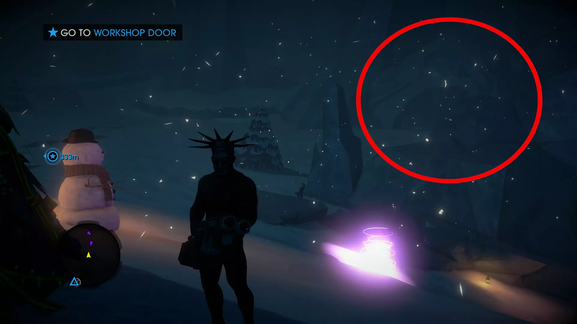 从维京雪人所在位置出发,朝着最近的建筑外围前进,然后继续向右(东方)走。沿着外侧一直走,你会找到双头雪人。 6. 黑帮雪人