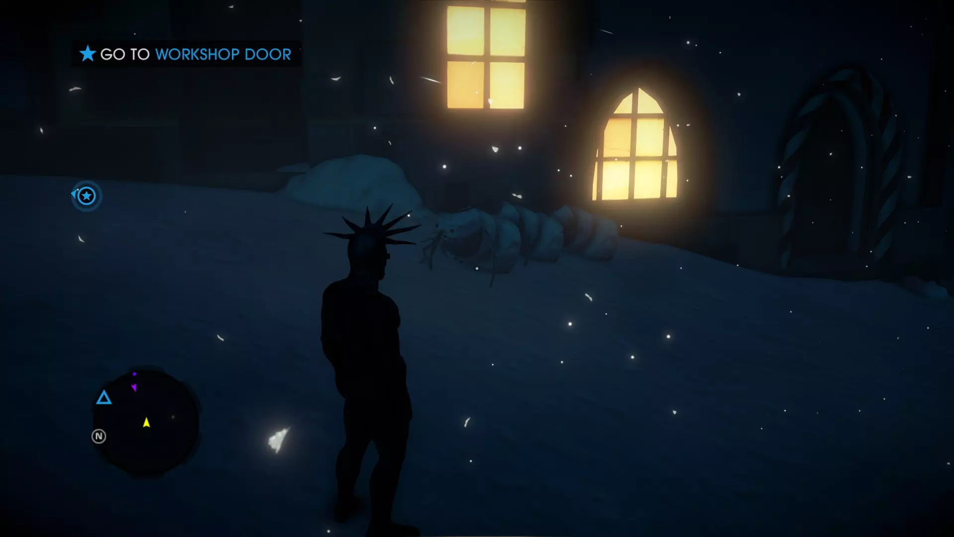 最后一个雪人遗憾地没有出现在之前那些雪人的附近,而是要回到有胡子雪人的北极入口大门处,然后向左(南)走,绕着每栋建筑的外围,接着超级跳跃。可能很难看到它,因为它看起来和普通雪人完全不一样,而且这个区域光线也不太好。如果你看到一堆雪球,那很可能就是它了。 圣诞收藏品 - 文字冒险