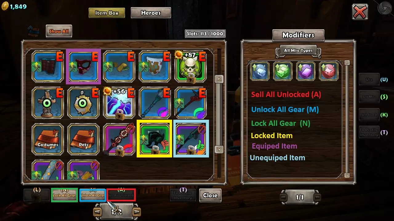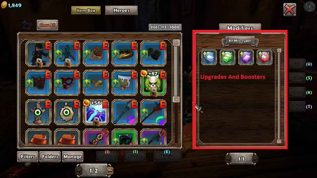 快速菜单显示在上方 物品箱(文件夹) 物品箱是你进行大部分物品管理的地方。你可以通过点击位于 inventory 屏幕上方的物品箱标签来访问它。在这里你可以查看你的物品和增益道具。 让我们开始吧! 文件夹 在物品箱菜单的底部应该有一个文件夹按钮,它们允许你按标签创建、重命名和删除文件夹。 物品箱的左上角允许你退出当前查看的文件夹。 要将物品添加到文件夹中,只需将其拖入即可。为皮肤和技能创建文件夹是很理想的,因为将它们保留到以后的日期和情况中很有必要。为宠物创建一个文件夹可能也很有用,用于存放你的 Genies 和 Propeller Cats。物品箱(强化道具) 强化道具和属性强化道具显示在物品箱界面的右侧。以下是这些物品的使用方法和获取途径: 强化道具 强化道具可在游戏过程中获得。它们能为英雄提供经验值增加、战利品增加以及更好的战利品等效果。强化道具的持续时间为5波,因此在还剩5波时使用效果最佳。使用强化道具只需双击即可。强化道具可能对其他玩家也有效,但这一点尚未确认。 属性强化道具 属性强化道具是击杀 bosses 的奖励,也可能通过特定挑战获得。它们能永久提升角色的属性。虽然单次提升幅度较小,但累积起来效果显著。使用属性强化道具时,只需双击它,然后点击你想要应用的角色即可。感谢Warlock_Holmez和Leoft的修正。