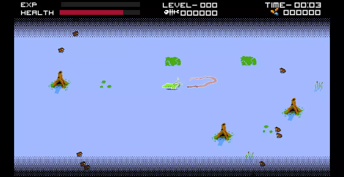 敌人 游戏中有许多可被攻击且会反击的敌人,从小型的普通鱼类到巨大的海洋生物,这些生物在现实中若遇到,你定会尽可能远地逃离。 小型敌人会不断生成,它们有几率掉落经验值(用于单次游戏内获取升级)或铜币(用于在商店购买永久升级)。