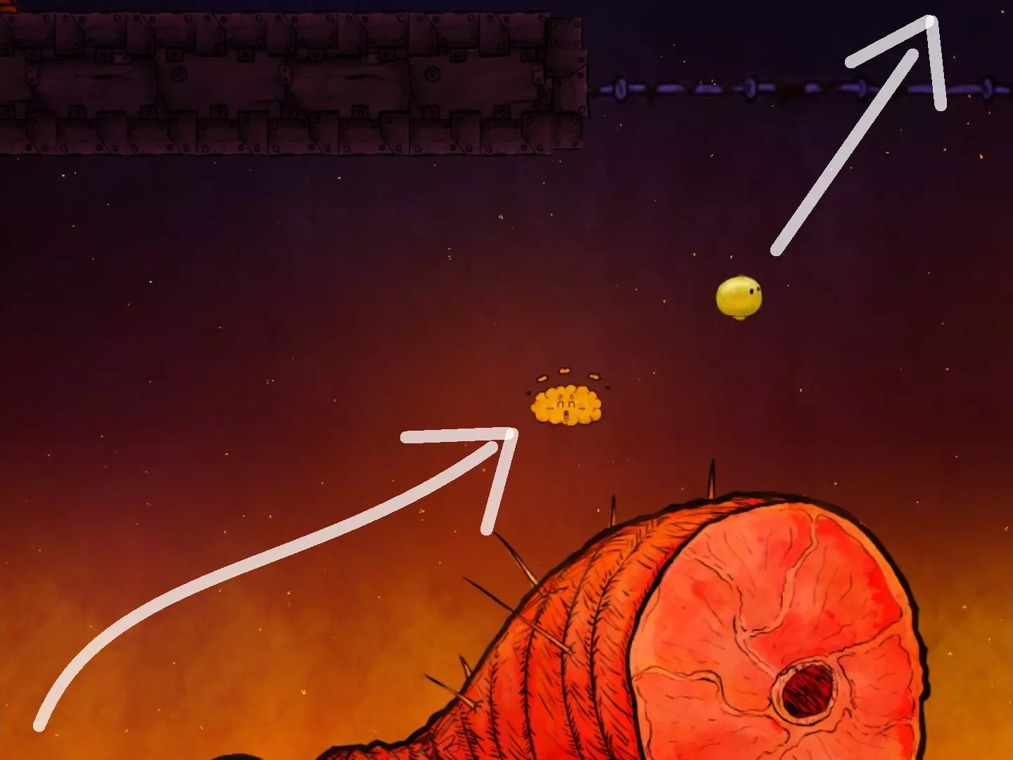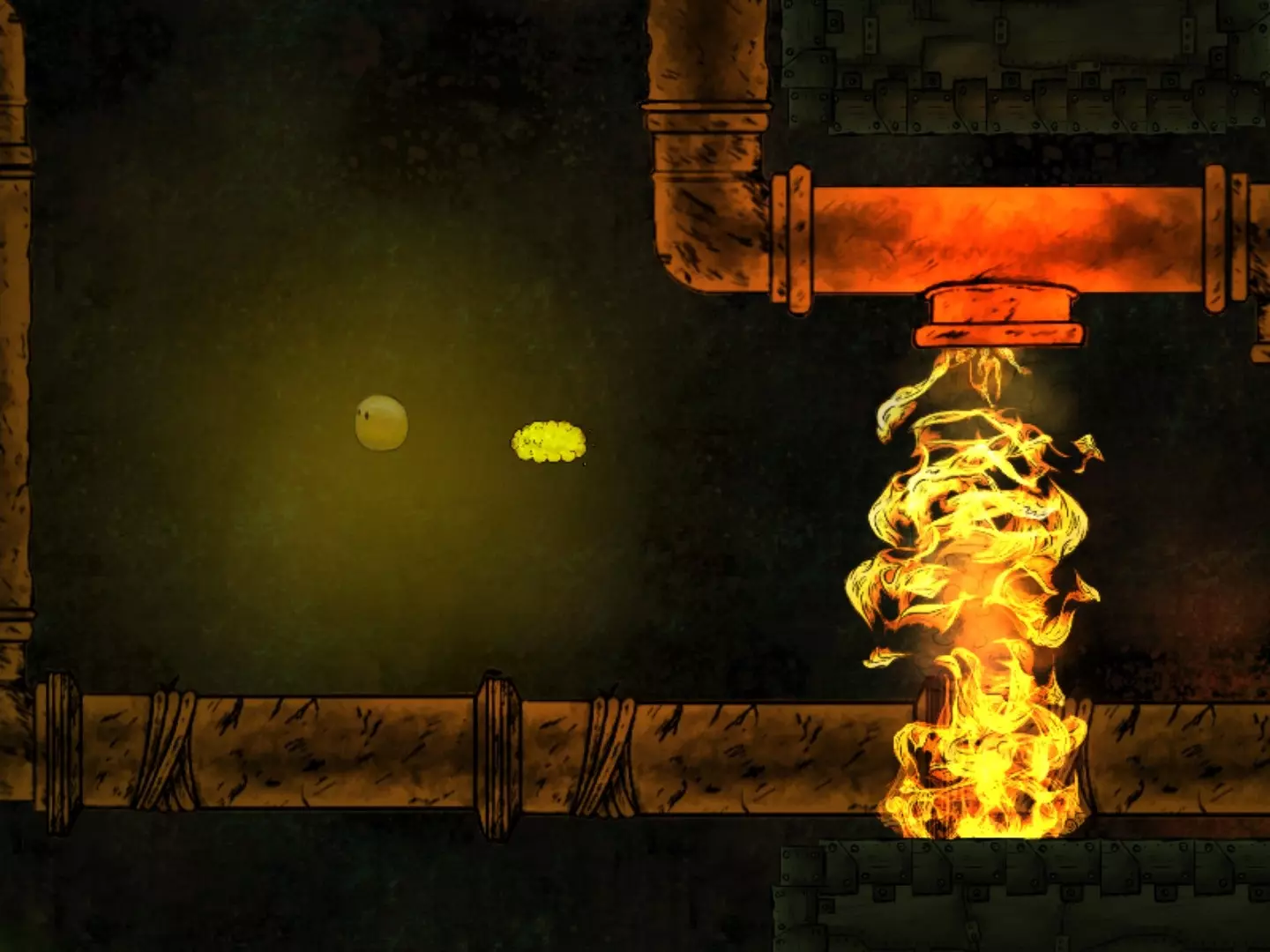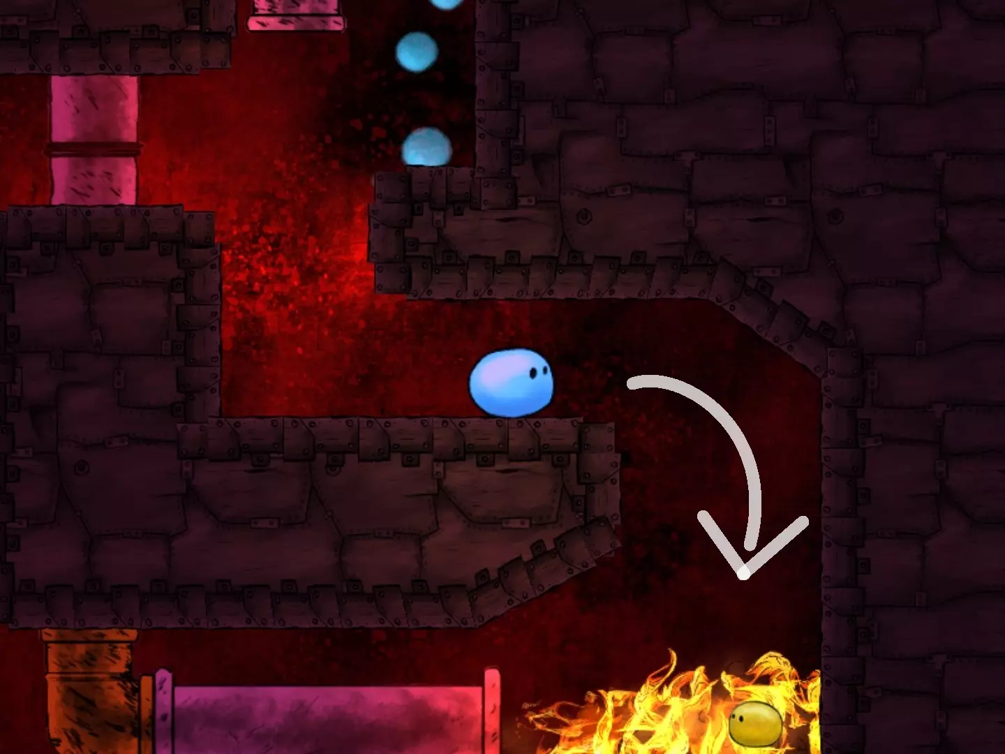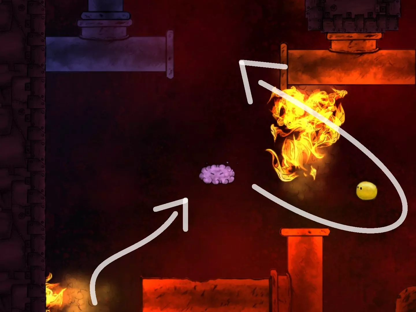 在焕然一新后,把握好火焰的时机,跳下去拿到第二个代币。之后,从下方返回关卡起点(向下走并一直向左)。