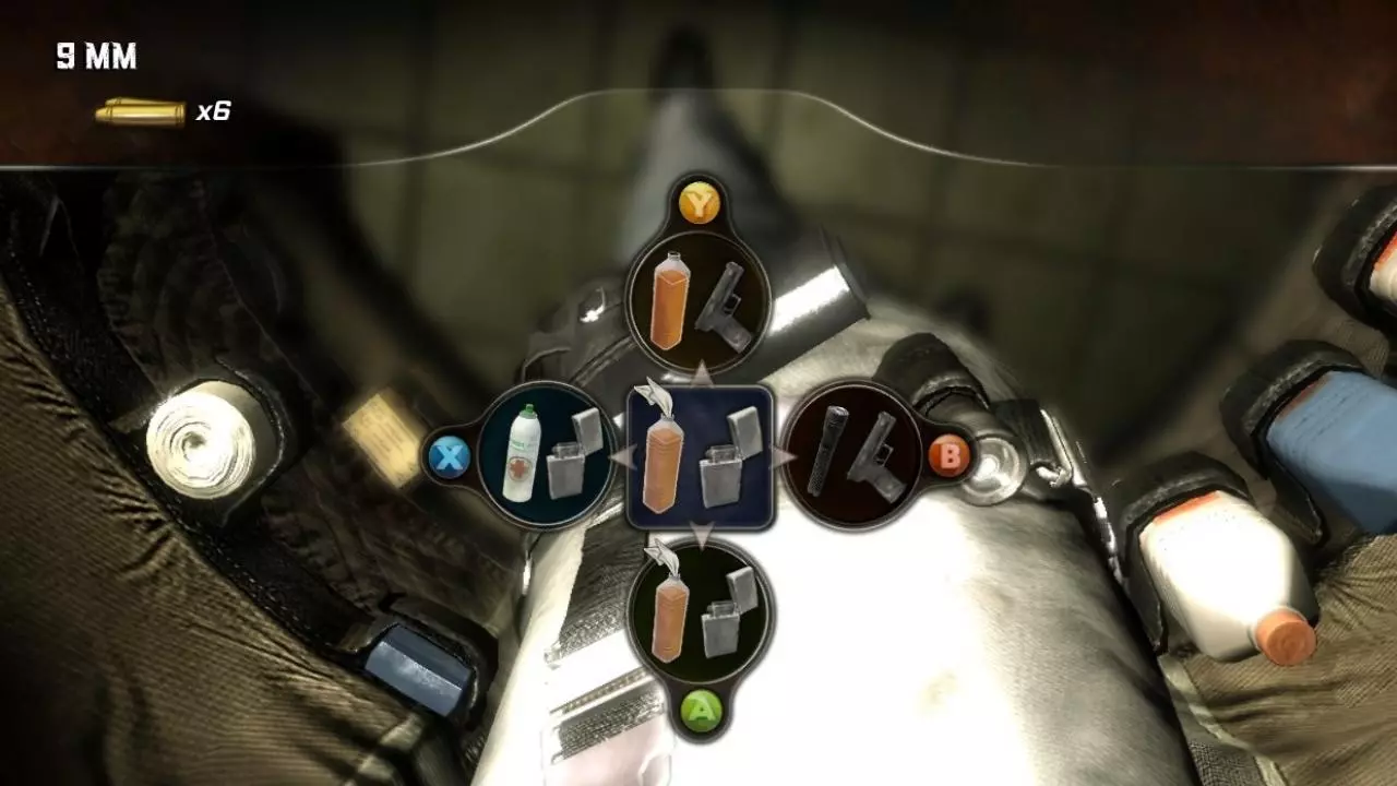一切就从这里开始了。 真正让我印象深刻的是开发者对细节的关注。很多人可能觉得这些细节无关紧要,但我认为这是游戏中最重要的元素之一。它们能让玩家更沉浸在游戏中,让游戏体验更加丰富。举个简单的例子:游戏中加入了外观损伤系统,也就是说,当角色受到伤害时,我们能看到角色身上的伤口。通常情况下,我们会使用急救包然后继续前进,但在这里却并非如此。我们可以实时检查伤口、用消毒剂处理伤口,甚至包扎伤口,这在现在看来也非常特别。即使是从物品栏中丢弃物品时,玻璃瓶会摔碎在地上,而塑料瓶则会保持完好。正是这些细节让《鬼屋魔影》(2008)与其他游戏有所不同。