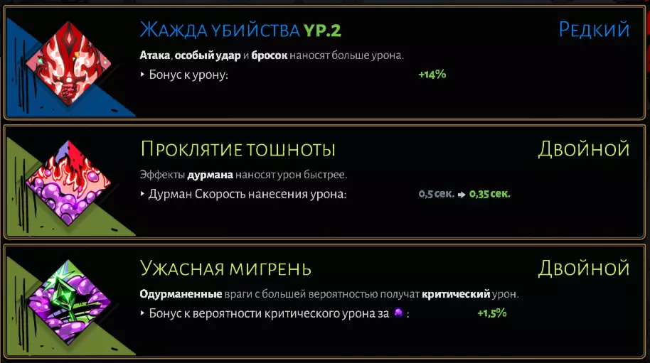 游戏前期使用倔强不屈,后期使用3级不屈充能。关于血石,主要强化效果为对目标造成+50%伤害,另一种选择是降低被血石困住的敌人的伤害和攻击速度。两种效果都很出色,对 boss 和小 boss 都很有用,可根据自己的游戏风格选择。我个人更喜欢+50%伤害,另外一个有趣的组合是【得墨忒耳】+【深渊之血】(总计可造成高达65%的减速效果)。其他恩赐与代达罗斯之锤 好了,我们已经确定了用于 Zagreus 主要攻击的恩赐选择,现在来看看那些能让你的流派在昏暗的冥界中真正大放异彩的恩赐。 如果你选择了狄俄尼索斯,那么之后尝试在流派中加入阿尔忒弥斯会是个不错的选择——尤其是她的火焰支援会非常及时。而阿瑞斯则能为我们提供伤害加成,这也相当不错。而且双重恩赐也不会多余,同样能提升伤害: