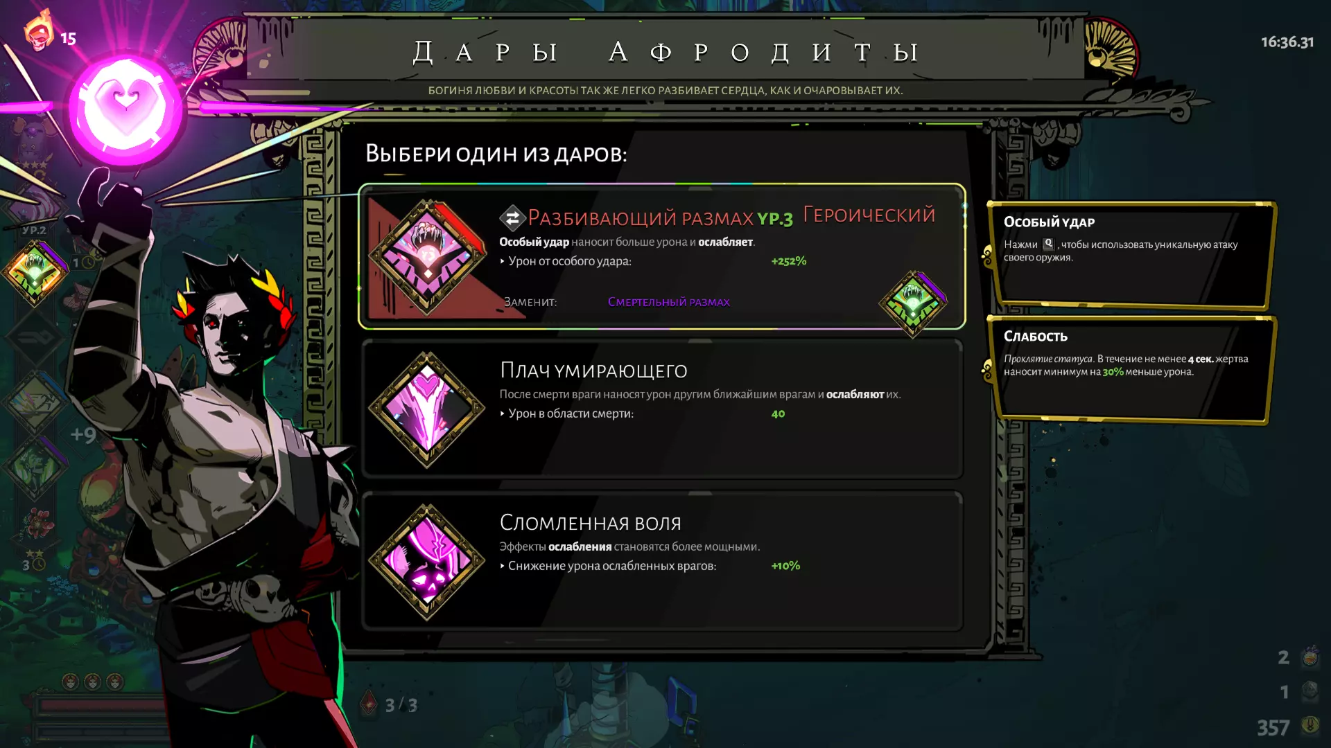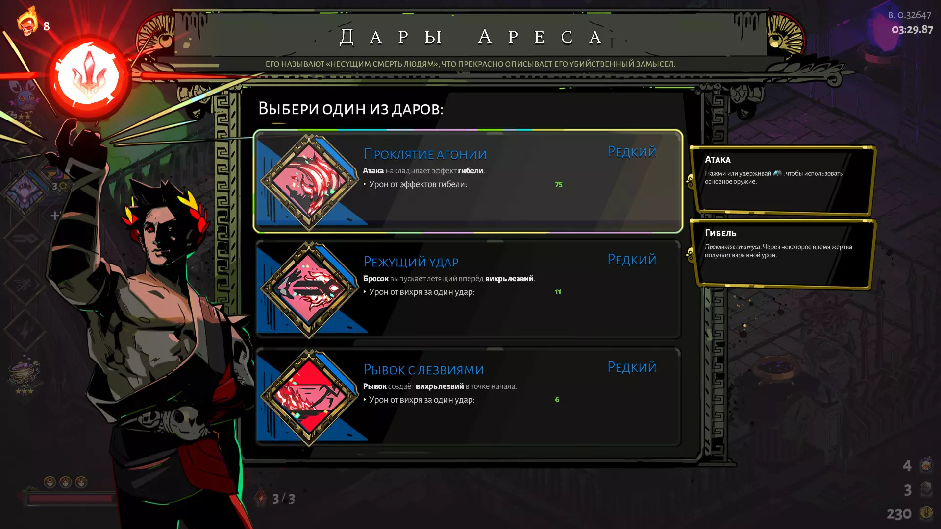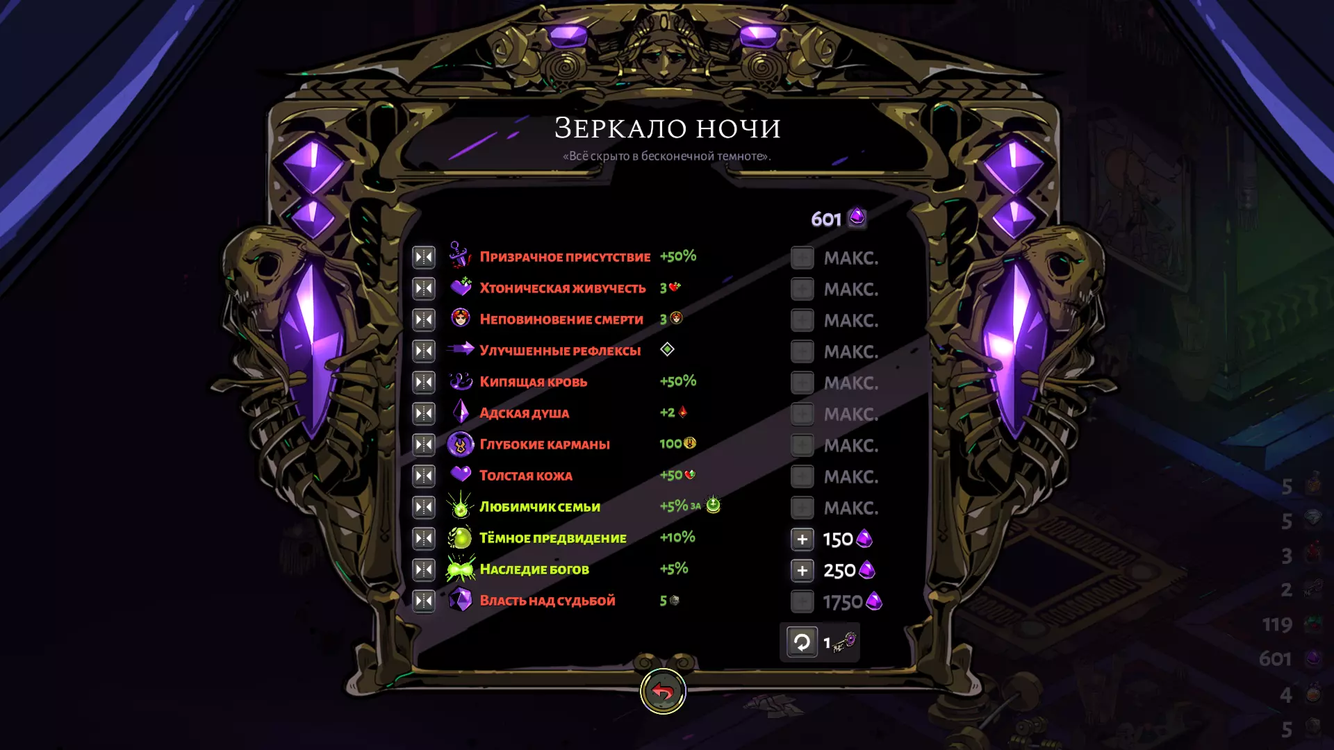 逻辑很简单:你不会太频繁地使用普通攻击,所以至少升级到100伤害的【阿瑞斯的诅咒】能造成不错的伤害,而且叠加它也没什么用。选择它非常重要,因为几乎所有其他选项都效果不佳——阿耳忒弥斯的暴击效果对普通攻击来说用处不大,因为普通攻击的使用频率不高;波塞冬的技能则明显有害,因为它会击退敌人,导致你无法用射击命中他们;宙斯的技能只提供微不足道的伤害加成,等等。玩高热度《哈迪斯》的主播们,喜欢选择阿芙罗狄忒作为主要攻击手段,以便能在一定程度上降低来自 Boss 攻击的高额伤害。凭借这种构筑,借助双重恩赐能够造成真正巨大的伤害,但这已经是完全另一个话题了。建议将其留到后期更高热度的闯关使用。 镜子的升级——这里一切都很简单: