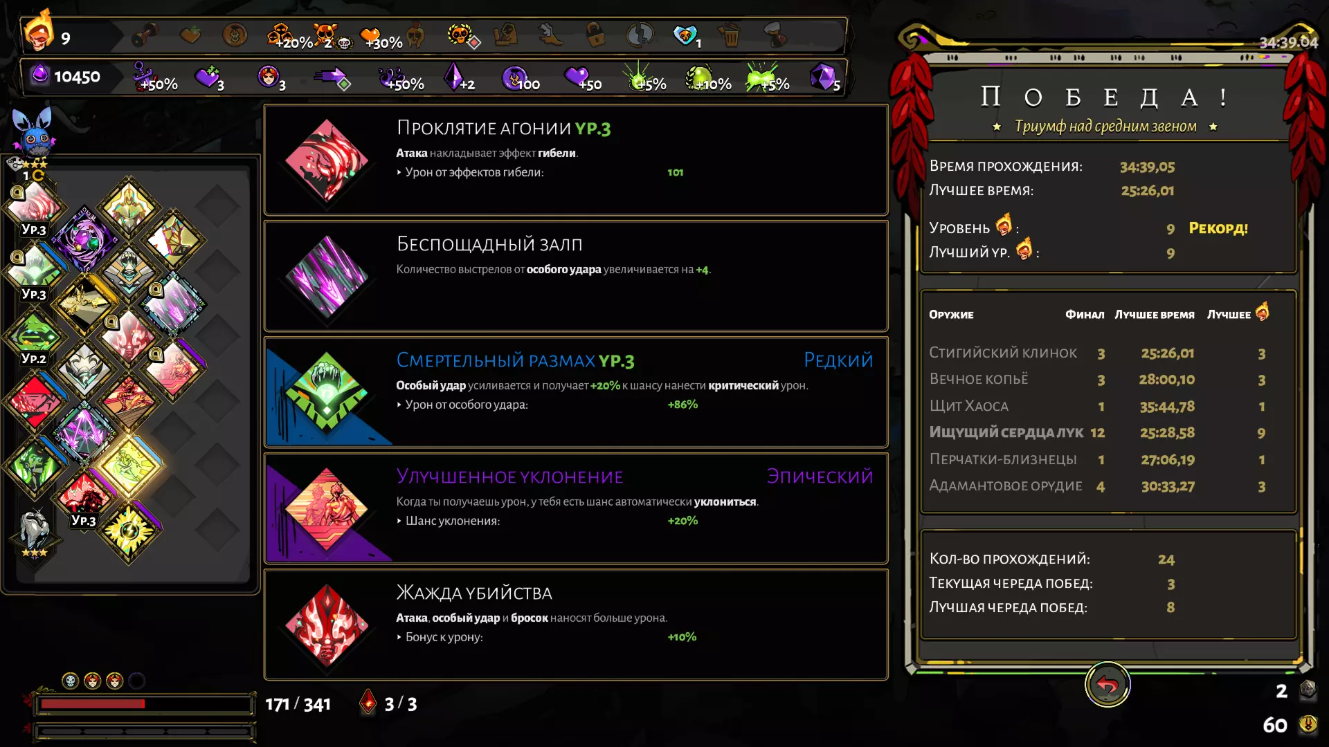 总体来说,通用建议是尽量提高特殊攻击的伤害——比如【诸神之镜】中的【神明宠儿】、阿瑞斯的【杀戮渴望】等。赫尔墨斯的恩赐也很有用,尤其是那些能提升特殊攻击的施展速度和冲刺效果的恩赐,而且他的恩赐普遍都不错,这也是他的优点所在。关于冲刺、冥府伙伴和饰品选择 在准备房间中,佩戴你为特殊攻击所选神明(狄俄尼索斯、阿耳忒弥斯或得墨忒耳)的饰品——这样就能在塔尔塔罗斯获得特殊攻击。少数情况下可能会失败,无法获得所需的强化——此时需随机应变(可以选择该神明的任意强化并稍后再获取,或者先拿现有的强化,之后再出售)。原则上,不升级特殊攻击也能通过塔尔塔洛斯,尤其是如果运气好拿到了【代达罗斯之锤】,并且获得了额外的4支箭。 在进入阿斯福德斯之前,装备上阿瑞斯的信物。进入极乐境之前,如果你已经收集到了所有必要的东西,可以选择雅典娜的冲刺,或者刻耳柏洛斯的项圈来增加生命值。最后,在进入冥河神殿之前,将信物换成斯基拉之牙。来自冥府卫星的伙伴——你可以根据喜好选择任意一位,我个人偏爱墨纪拉的伙伴。虽然需要近距离使用,但她的【狂怒冲击】能造成2500点伤害,在对抗冥河神殿里那些烦人的小Boss时非常有帮助,建议你留着能量到那里再用。 我建议只在 Tartarus 和 Asphodel 区域召唤混沌。到了 Elysium 就最好别这么做了,尤其是在地狱热度较高的时候,特别是如果你已经获得了混沌对特殊攻击的伤害加成。对于一些速度过快但实力较弱的敌人,最好使用无瞄准的箭雨连射,再配合冲刺和召唤造成的伤害来解决。最后,附上使用这套构筑进行一次游戏的结果作为参考:
