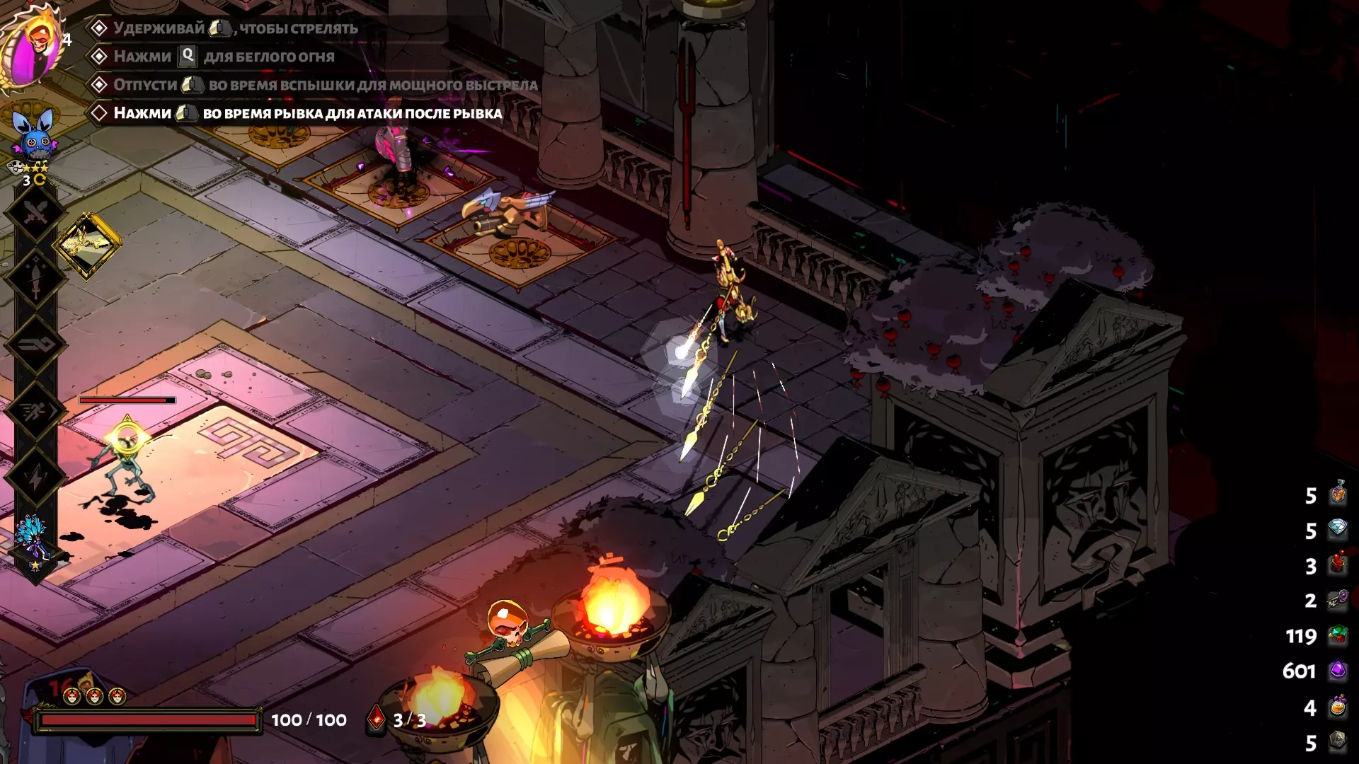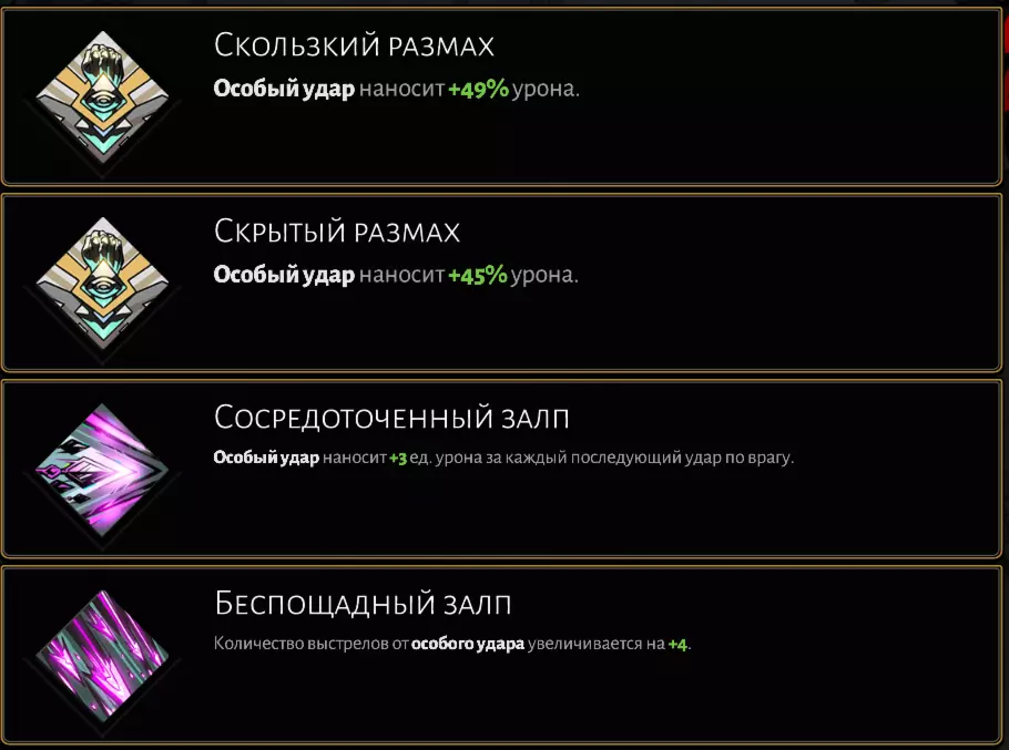 如果你想通过阿尔忒弥斯打造特殊攻击,那就更简单了,只需选择她的强化:火焰支援、猎人标记、额外破甲伤害、增加暴击伤害、被动暴击几率——这些恩赐都能提供不错的加成,显著提升构筑的效果。一定要带上她的召唤或投弹。 通过得墨忒耳构建时,【绝对不要】选择那个移除她的减速层数以换取伤害的强化。伤害微乎其微,而失去对敌人的宝贵减速效果会大大增加战斗难度。作为辅助神力,阿尔忒弥斯(Artemis)再次派上用场。 以下是对召唤、冲刺和投掷技能有用的神力选择: 召唤技能升级。 阿尔忒弥斯(Artemis):能提供巨大伤害,尤其是强化版本,还能缩短战斗时间。它在特殊攻击时与自身搭配效果尤其出色(暴击能快速填充召唤条),和赫尔墨斯(召唤条持续恢复)搭配也很好。不过要记住,你无法秒杀 bosses,当它们的生命值降至三分之一后,会进入几秒的无敌状态。 绝对不要选谁呢?那些召唤完全没有伤害的,比如雅典娜和阿佛洛狄忒。宙斯没什么用。不错的替代选择是阿瑞斯。得墨忒耳和波塞冬有一定用处。冲刺升级。 公认游戏中最好的冲刺来自雅典娜,但获取它可能并不容易。我建议在【阿斯翠亚】区域再尝试获取,前提是你的两种攻击已都装备了神恩,并且至少拥有一个召唤(如果还有投掷神恩就更好了)。这样获得雅典娜冲刺神恩的概率最高。如果没成功,通常会出现【青铜皮肤】(减少受到的伤害)——这也不错。 绝对不要选谁?选择阿尔忒弥斯(Artemis)没什么意义——这套流派不适合冲刺后的攻击(那是近战武器的玩法)。如果没刷到雅典娜(Athena)的祝福,其他的祝福大多都还能用,建议选带伤害加成的(比如阿瑞斯(Ares)的)——打冥河神殿的老鼠时会派上用场。 投掷技能升级。 阿尔忒弥斯(Artemis)是你的选择。在这套流派里,你不会经常用到血石,但需要用时,她的自动追踪投掷技能是最好的。其实完全可以空着不填——这并不那么重要。 绝对不能选谁呢?所有那些不让你把血石猛地砸进敌人厚实身躯的神明——毫无疑问,狄俄尼索斯、波塞冬、得墨忒耳、阿佛洛狄忒都不行。唯一的例外是阿瑞斯,他的旋风能造成不错的伤害,在闯关快结束时可能会派上用场,尤其是如果你没有冲刺升级的话。 代达罗斯之锤。简而言之,不要选择会降低攻击距离和攻击速度的升级项:这些升级会减慢扎格列欧斯的速度,还会妨碍你与敌人保持安全距离。绝对不能选择特殊攻击充能、普通攻击双重射击之类的升级。说来也怪,就连快速射击也不能选——用它瞄准要难得多。最好完全避免对基础攻击进行升级,万不得已的话,三连射、近距离射击和狙击射击还能用——至少它们不会造成负面影响。另一个勉强可以接受的选择是连锁射击,但它会稍微干扰瞄准。 而能显著提升流派伤害并极大降低通关难度的核心增益,就是无情连射。