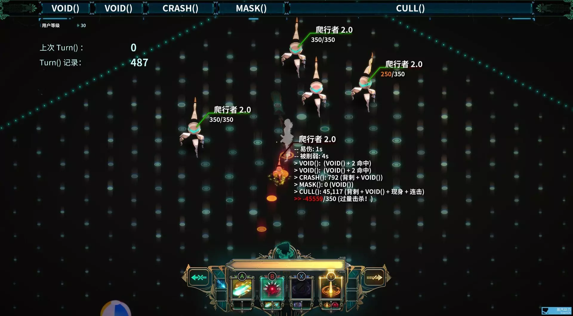 开全限制器模式下,我的第3周目完全是被一路虐过来的。因为开启了全限制器,导致进度进展非常缓慢,经过无数次调整后,我最终选择了以上技能,到了第四周目按照这样的配置通关就轻松了许多。主要依靠【Crash()函数】给【Void()】增幅,使其多了眩晕效果,再加上【Jaunt()】可以让【Void()】瞬间释放且不受【Turn()】冷却的影响,这简直是控场神技。在【Void】的增幅下,使用【Tap()】时,没有哪个进程机器人能撑过2次攻击。 不过要再次提醒,这只是我的方法,不一定适合所有人,所以还是要根据自己的情况调整技能。 最后,在开启全限制器模式时,最烦的就是满地乱跑的小机器人、触手以及保护型机器人。用我这种方法打起来可能会非常难受,我推荐用【获取】主动+【加载】增强,前面说的那3个全部都是瞬秒,真的非常非常轻松,但是全限制器模式能使用的技能实在有限,思考再三我还是换回了图中的技能。